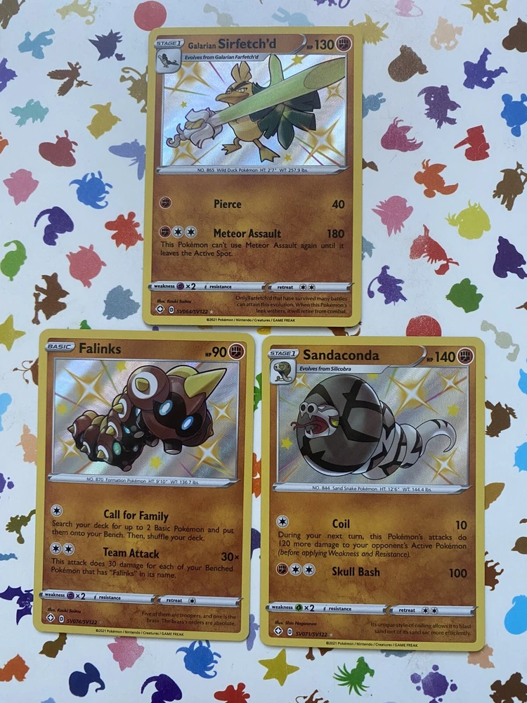 Youโ€™ll get 3 Pokemon card. GALARIAN SIRFETCHโ€™D. sv064/sv122.- FALINKS. sv074/sv122.-SANDACONDA. sv071/sv122. All in excellent conditionsโ€ฆ๐Ÿ€plus some free stuffโ€ฆ๐Ÿ€๐Ÿ€ free shipping on all graded cards and combine shipping for multiple ordersโ€ฆ๐Ÿ€๐Ÿค™๐Ÿป๐Ÿ€๐Ÿค™๐Ÿป