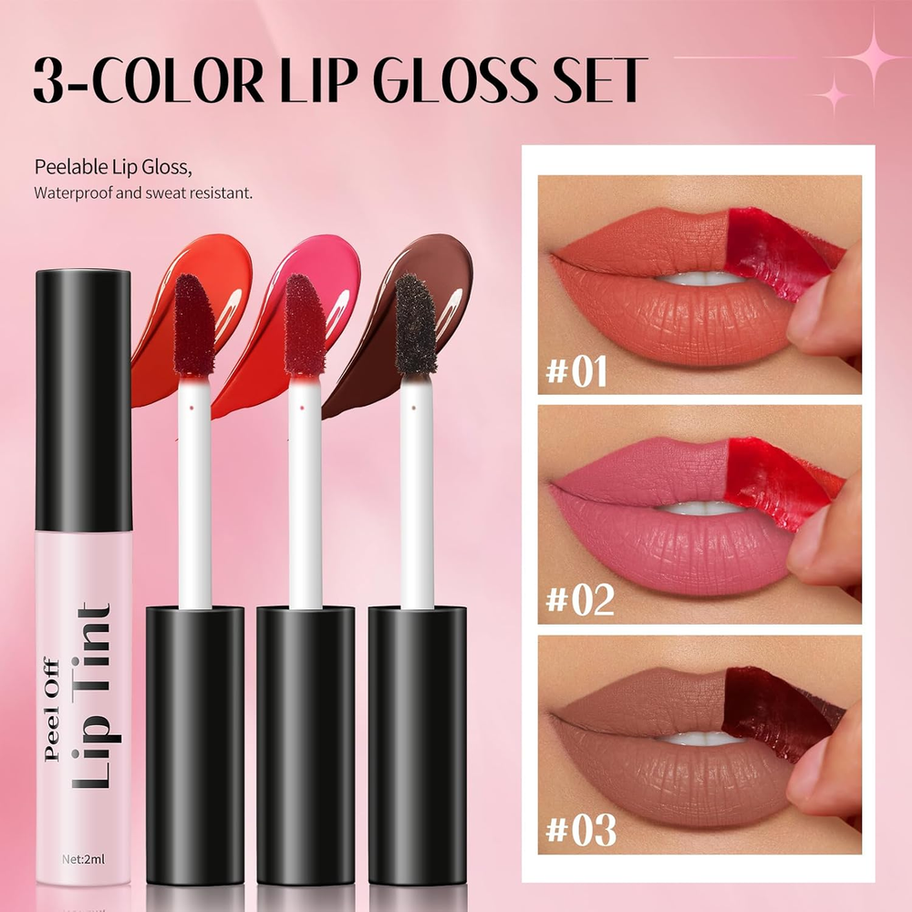 3 Colors Peel off Lip Stain Set, Tattoo Magic Color Matte Nude Lip Gloss Lip Tint, Long Lasting Waterproof Liquid Lipstick Tinted Makeup, Nonstick Cup Lip Stain for Women Girls(02+03+06) 【3 Colors Peel Off Lip Stain Set】This is a new peel off lip stain set with easy application, fast drying and easy peeling. You can choose the colour you want and when you peel it off, you get a naturally and beautiful colour on your lips 【Easy to Apply, Quick Dry, Long Lasting, Waterproof】This peel off lip stain is lightweight, easy to apply, can quickly dry and peel off in just a few minutes. After it dries, it's long-lasting and waterproof, so no matter what you're doing to your lips, the colour won't come off and always stays matte. 【Mild Formula】 Our peel-off lip gloss contains no harmful substances, gentle and non-irritating, will not harm your lips. This lip gloss has a highly pigmented formula that will naturally colour your lips for a long time, making them full and vibrant. 【How to Use】Use the included lip brush to apply the liquid evenly to your lips and leave it on for 5 minutes before peeling off a layer for a long-lasting, non-smudging, natural lip colour. 【Perfect Gift】This peel off lip stain to create smooth and beautiful color. It is good to be a perfect gift for your friends and families. Product Description: Size: 8.9*4.5*1.5cm/3.5*1.8*0.6inches Weight: 33g/1.16oz Color: 02+03+06 Skin Type: All Skin Features: 1.3 Colors peel off lip stain set. 2.Long lasting and waterproof. 3.Easy to use and carry. 4.Perfect gift for your friends and families. Warm Tips: 1.This product is for external use only. 2.Avoid direct sunlight exposure and store at room temperature. 3.Please put it away from the touch of kids. 4.Avoid contact with eyes, if accidentally contact with eyes, please flush with plenty of water immediately, and seek medical attention if necessary. 5.As most makeup, we highly recommend you to make a skin test before the first use. How to make skin test: Apply a small amount on the wrist or behind the ears, wait for 2-5 minutes to check if there is allergic reaction. If feeling unwell, please stop using immediately and seek medical attention if necessary. If you have any questions, please do not hesitate to contact us. We promise to provide you with the best and prompt service if you need any help. Dimensions 1.93 inches x 3.54 inches x 0.63 inches. Weight: 1.13 oz Specifications Color 02+03+06 Finish Type Matte Skin Type All Item Form Cream Package Dimensions 3.54 x 1.93 x 0.63 inches; 1.13 ounces Shipping: Shipped from the USA. Fast delivery within 2–3 days. Payment: PayPal, credit card, bank transfer. Returns: 30-day free return – we cover the shipping cost. Quality: Made in Europe/USA/China. No customs fees. VAT invoice on request. Feedback: You’ll automatically receive positive feedback after payment.