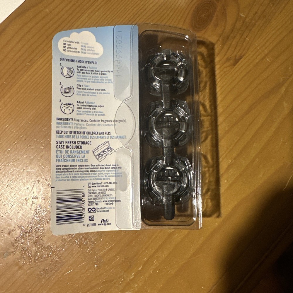 gtin13: 037000811138 Color: Blue UPC: 037000811138 Type: Car Vent Clip Brand: Febreze Scent: Linen & Sky Number in Pack: 2