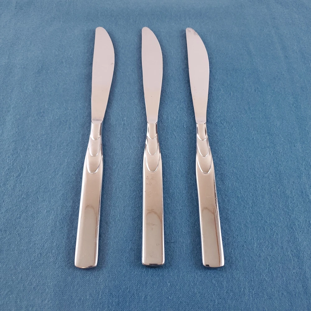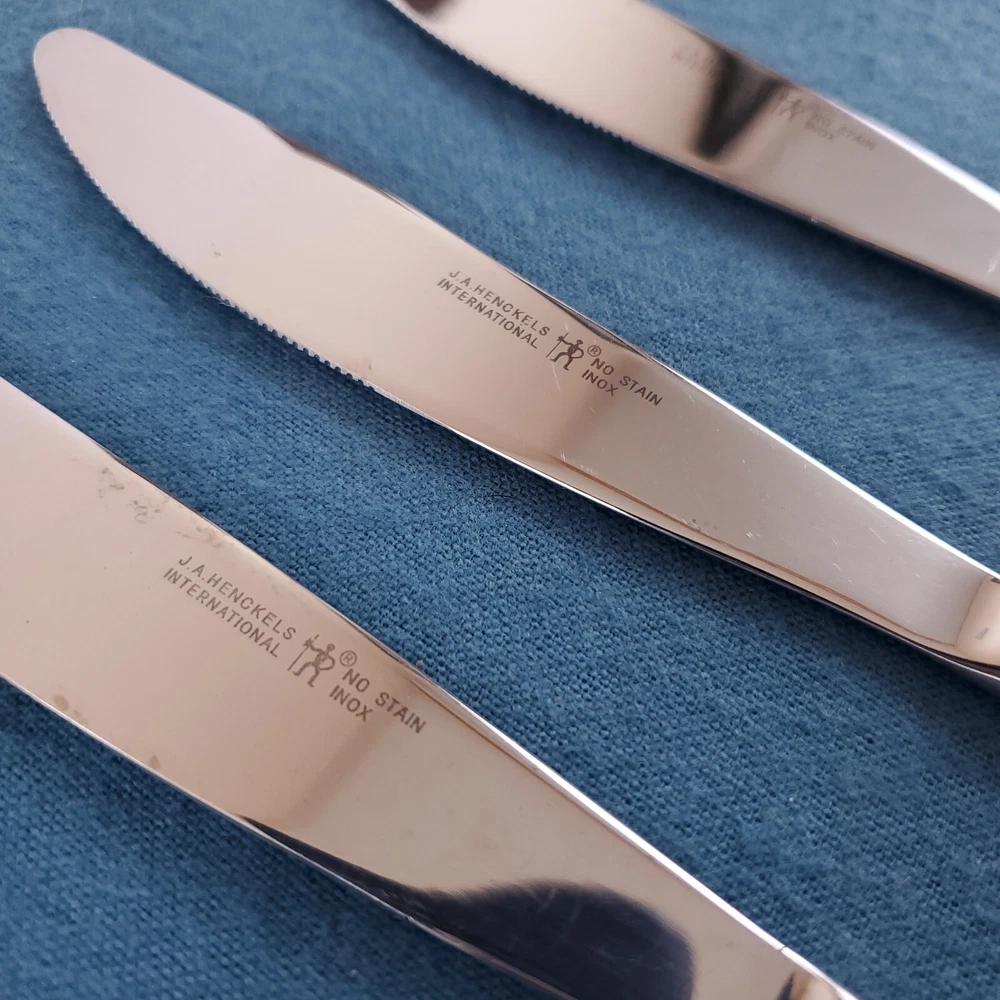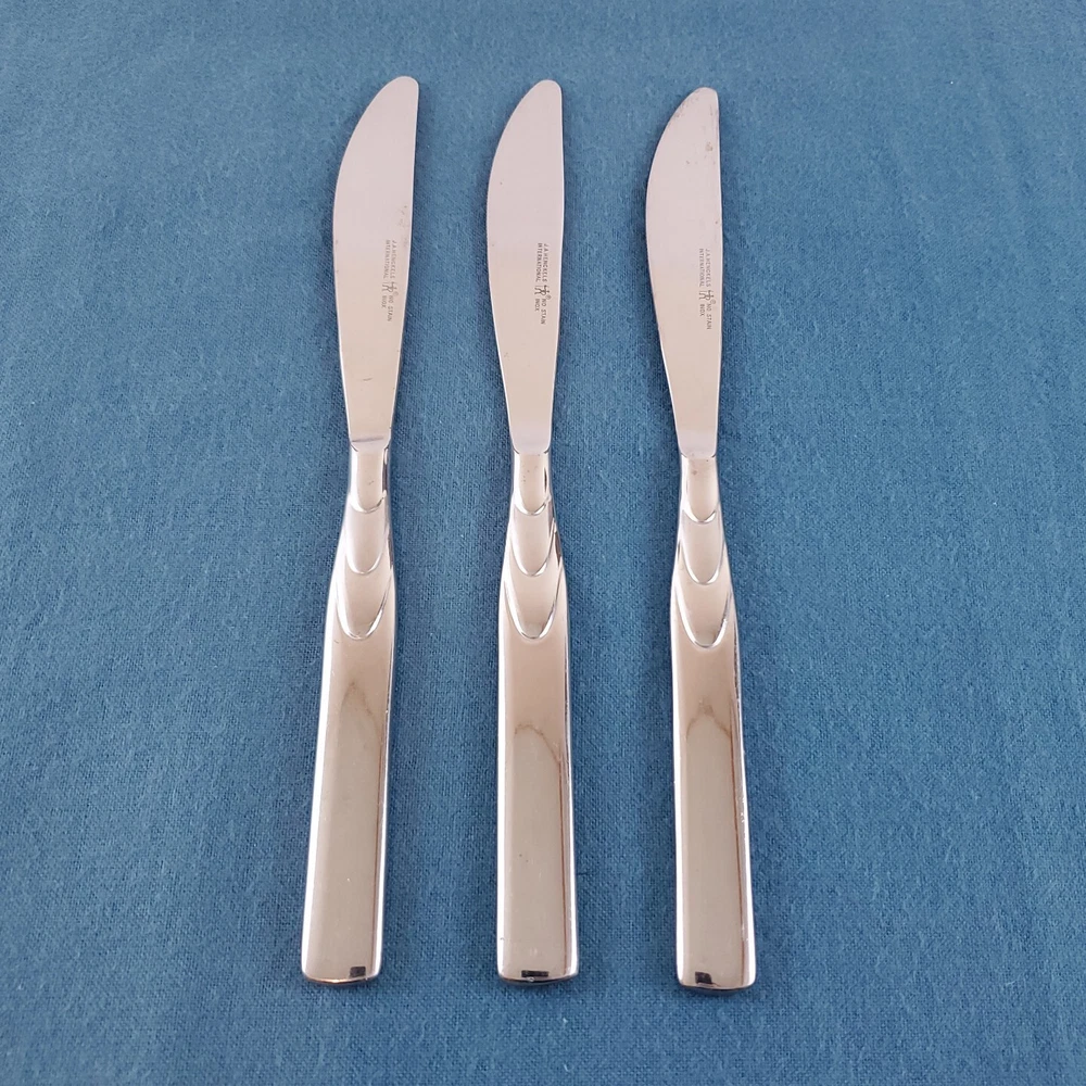 (3) Dinner Knives Solid JA Henckels Zwilling RAPTURE Stainless China Some staining on blades, see photos. Overall good condition. Please view the photos carefully for condition details. Don't forget to check out the other items in my shop. I'm getting in new fun things all the time. Thank you for looking! Have a great day!