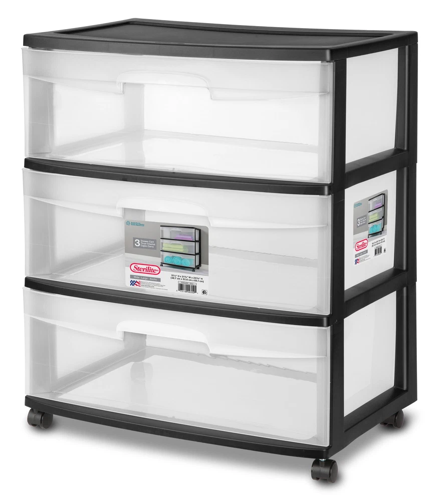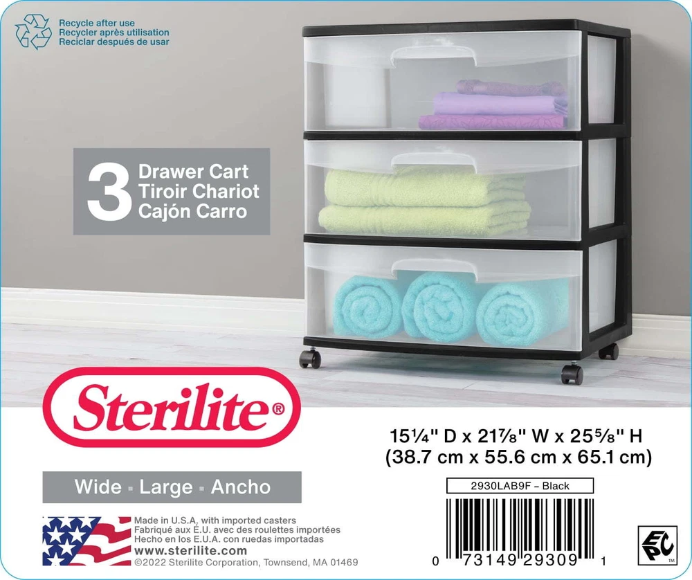 You may also like Clear Storage Bin Stackable Sweaters Toys Snacks Plastic Box Home Organization 12.26 USD 13.47 USD Free shipping 9% off 6 Pack Collapsible Cube Fabric Storage Bins Tote Organizer Container 10.5"x10.5" 27.11 USD Free shipping 3-Drawer Weave Tower Storage Basket Organizer Cabinet Bedroom Dresser Espresso 30.42 USD Free shipping Portable Lidded Storage Basket Stackable Box Home Organization w/ Lid White 25.08 USD 26.97 USD Free shipping 7% off Clear Plastic Bathroom Vanity Storage Bin w/ Handles Container Organizer Plastic 16.38 USD Free shipping Wood Storage Bin Container w/ Handles Home Organizer Office 10" L x 7.5" W x 6"H 21.64 USD 23.27 USD Free shipping 7% off Wide 3 Drawer Cart Portable Rolling Storage Organizer Plastic Container White 25.81 USD 27.78 USD Free shipping 7% off Set of 2 Storage Basket Home Organization 2 Medium Bins, 4 Small Bins With Lids 41.76 USD 44.91 USD Free shipping 7% off 2 Pack Fabric Cube Storage Bins Organizer Lightweight Portable 12.75" x 12.75" 25.85 USD Free shipping 2Pack Lightweight Resin Wicker Storage Bin Organize Bathroom Office Closet White 21.41 USD 23.02 USD Free shipping 7% off Plastic Storage Basket W/ Lid Storing Toy Tool Container Lightweight Portable US 16.134 USD Free shipping The Sterilite 3 Drawer Wide Cart offers a practical and versatile storage solution for any room of the home! Organize a variety of household items where they are most frequently used - in the bedroom, kitchen / pantry, bathroom, craft room, nursery or dorm room. It can even double as a nightstand, dresser or way to make efficient use of closet space. Neatly store anything from clothing, accessories, and towels to craft supplies, health and beauty items, toys, and more. The drawer design features an integrated handle for easy opening and is clear, allowing contents to be easily identified, while keeping them contained. The drawer stop feature prevents drawers from being removed accidentally. Add the casters to create a rolling storage option, and easily move the Drawer Cart wherever it is needed. It's easy to get organized and keep your living spaces clutter-free with the 3 Drawer Wide Cart! The overall assembled dimensions of this item are 15 1/4" D x 21 7/8" W x 24" H. Outside Dimensions: 15 1/4" x 21 7/8" x 24" Single unit option Black Interior Dimensions at bottom of drawer: 19 1/8" x 13 1/4" x 7" Assembled Cart Height, with Casters: 25 5/8" Multi-purpose and versatile storage option for any room of the home Clear drawers allow contents to be easily identified Easy pull out handles with drawer stops to prevent drawers from being removed accidentally Casters are included to create a portable storage solution You may also like Bluetooth Soundbar with Subwoofer 100W Sound Bar for TV 2.1 Stereo TV Sound Bar 67.21 USD 87.46 USD Free shipping 23% off Hakko Soldering Iron for Stained Glass Corded Electric FX601 Iron 117.23 USD 136.93 USD Free shipping 14% off LED Cube Shaped 3 Gallon Aquarium w/ Pedestal Base For Small Tropical Fish Betta 70.13 USD Free shipping Portable Boombox CD Player & Cassette Player Combo W/ Bluetooth 5W HiFi Speakers 82.65 USD 88.87 USD Free shipping 7% off Fish Tank Filter For 45 To 70 Gallon Aquariums Silent Multi-Stage Filtration 49.33 USD 53.04 USD Free shipping 7% off 4030 Coil Spring Compressor Heavy duty Portable 96.14 USD Free shipping Snack Cart Rolling Pantry Utility Kitchen Cart Adjustable Fruit Vegetable Basket 57.54 USD 61.87 USD Free shipping 7% off Shooting Rest 3 Adjustable Ambidextrous Recoil Reducing Rifle for Sighting in 174.67 USD Free shipping Digital Display Soldering Iron Station W/ Solder Sucker Tweezers Soldering Tips 54.65 USD 58.76 USD Free shipping 7% off Workbench and Shelving Hardware Kit 88.87 USD Free shipping 138 W 600 CFM Centrifugal Air Mover Carpet Dryer Floor Fan Blower for Home Use 73.87 USD 79.43 USD Free shipping 7% off 38 Gallon Patio Trash Can Waterproof Resin Garbage Can w/ Tiered Lid Drip Tray 87.67 USD 94.27 USD Free shipping 7% off
