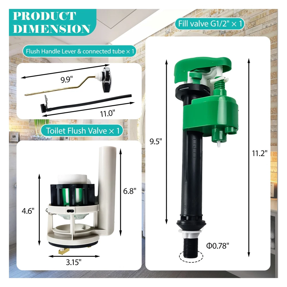 3-Inch Toilet Flush Valve Repair Kit for One-Piece Toilets, Drain Valve & Fill V Product description 【Universal Fit for Most Toilets】 Specially designed to fit most standard one-piece toilets (with a 3-inch flush hole), this kit is compatible with most major brands and models. 【Complete All-in-One Kit】 It includes a high-performance fill valve G1/2", a durable flush valve, and a corrosion-resistant stainless steel lever. Everything you need to complete a full toilet tank repair in one package.