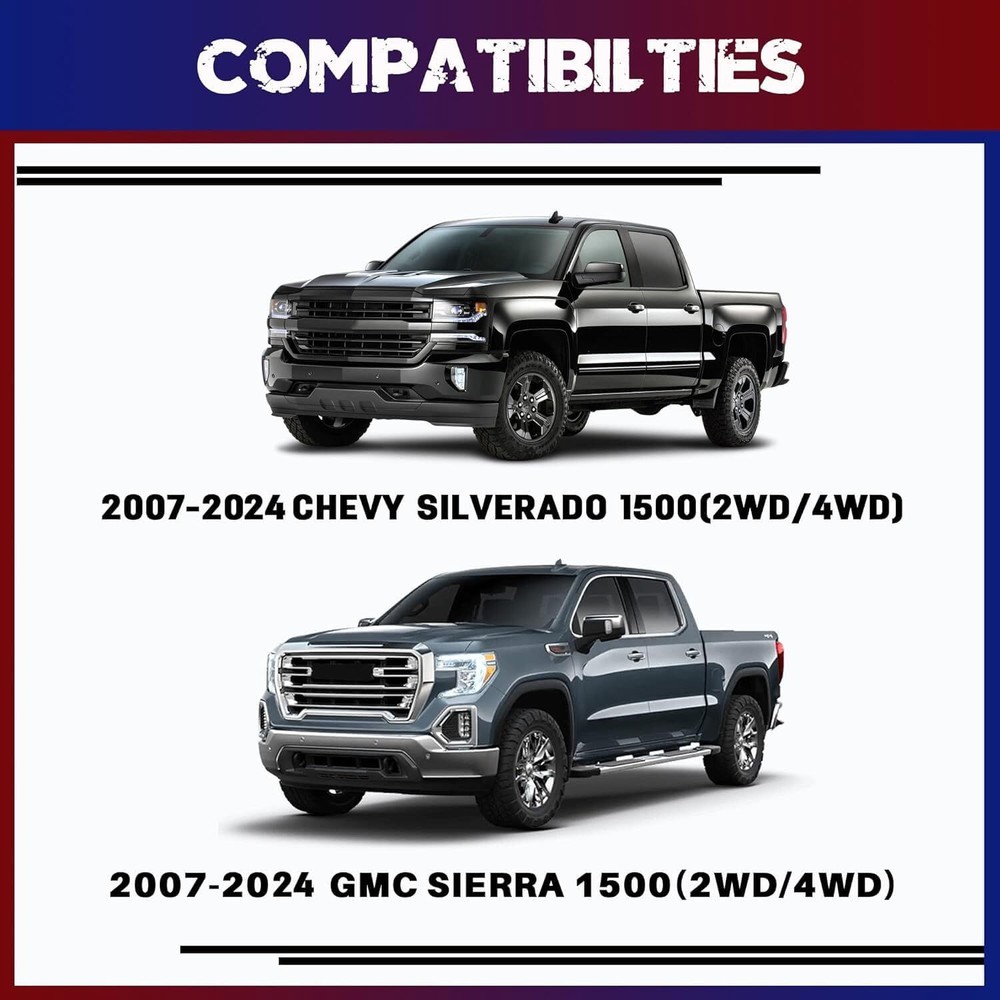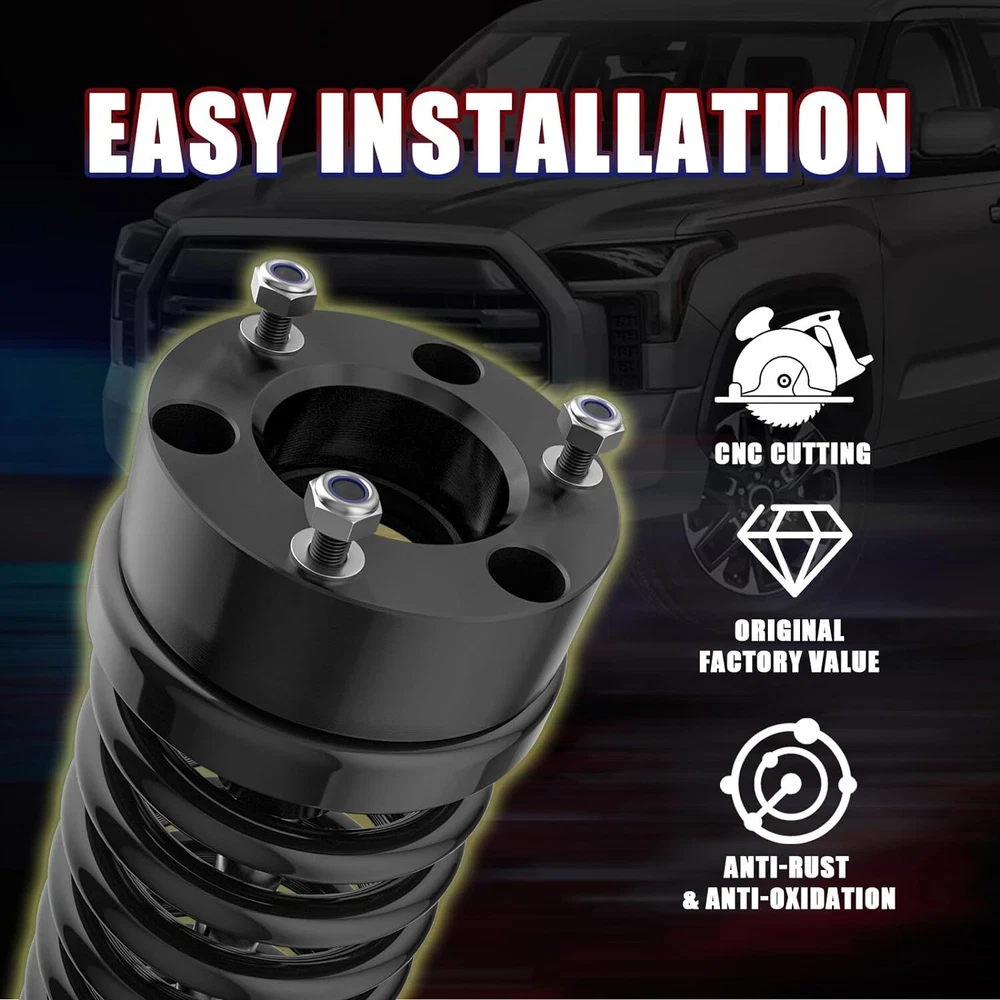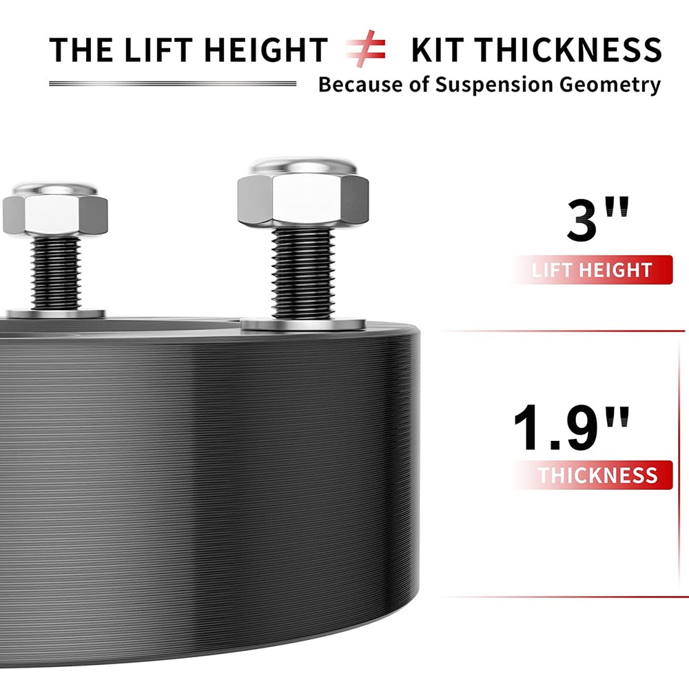 3" Front Leveling lift kit for 2007-2019 Chevy Silverado GMC Sierra 1500 2WD 4WD 【Lifting Height】This kit will raise the front of your Silverado 1500 Sierra 1500 by 3 inch.Due to the geometry of the suspension,the ratio of lifting height to kit thickness is not 1:1.The actual thickness of the leveling lifting kit itself is less than the lifting height 【Model Compatibility】Suitable for 2007-2024 Silverado 1500/2007-2024 Sierra 1500.This set will raise the front of the Silverado 1500 Sierra 1500 by 3" 【Process And Material】Forged from 6061-T6 aluminum alloy,CNC automatic processing,surface anodizing and heat treatment,and hardened grade 12.9 bolts are installed in advance,which not only ensures high precision and stability,but also improves the hardness and corrosion resistance of the material 【Easy To Install】The leveling Lift Kits is equipped with everything you need for a simple bolted installation. This process can be completed within 2 hours without preloading,cutting or modifying any factory parts 【Service And Warranty】All products are guaranteed for two years.If you have any questions about our products and services, please feel free to contact us Note:It will raise the front of your truck by 3 inch , Because of suspension geometry,the ratio between lift height and kit thickness is not 1:1. Compatible with 2007-2022 Chevy Silverado 1500 (2WD/4WD) 2007-2022 GMC Sierra 1500 (2WD/4WD) 2007-2021 Yukon 2WD/4WD 2007-2020 Tahoe 2WD/4WD Package: 2 x Front Leveling Lift Kit 1 Set Nut.