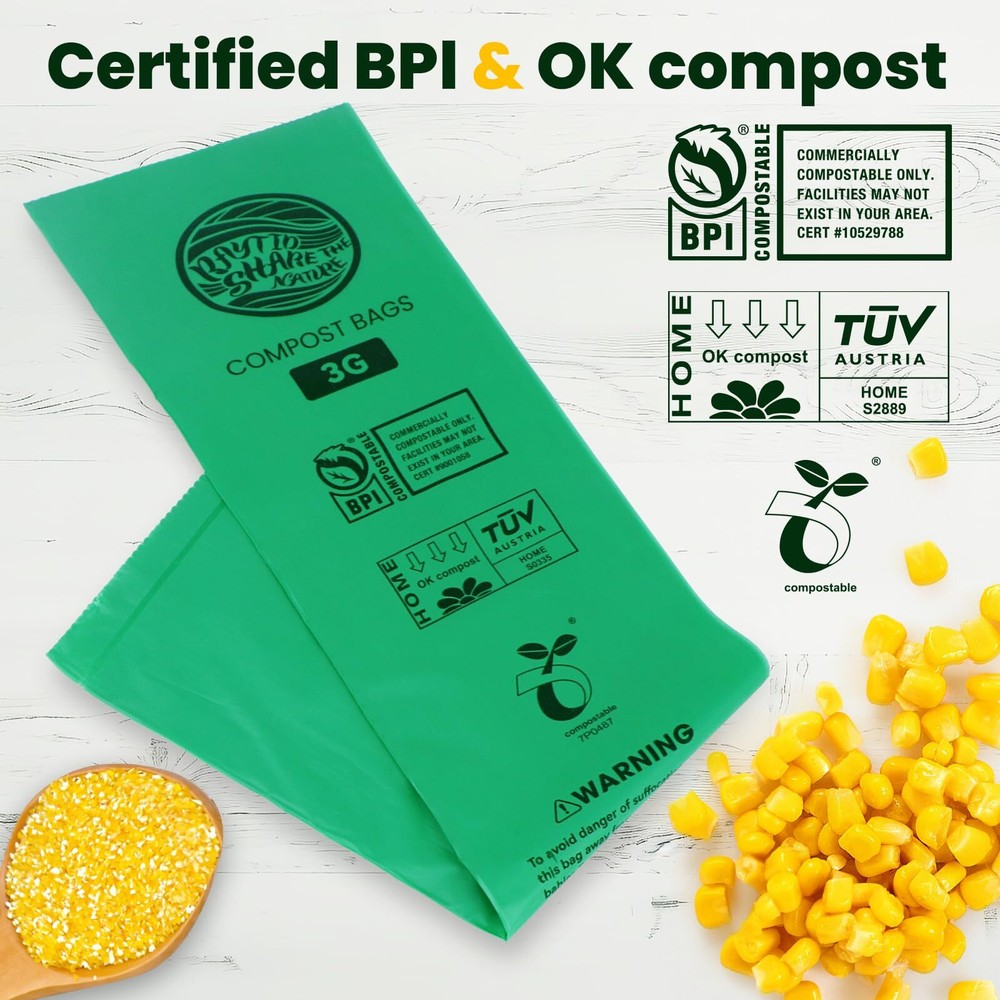 PRODUCT INFORMATION: Compostable bags 3 gallon 16.9 in x 18 in, 100 compost bags per roll. Kitchen small trash bags: These compost bags for countertop bin and compost bin are stretch, strong, expand to accommodate oversized loads without punctures, leaks or tears. compostable trash bags: 100% Compost meet with US BPI ASTM D6400 and EU OK Compost EN 13432 standard. Degrades into humus, CO2, and water within 180 days in a standard compost pile. HIGHEST BIOBASED CONTENT: compost bin bags are made from plant starches and contain NO polyethylene. Our garbage bags are durable, nontoxic, easy to use and great for the environment. USAGE & STORAGE: Avoid excessive heat; compost bag in a cool, dry place and use within 10 months of purchase.