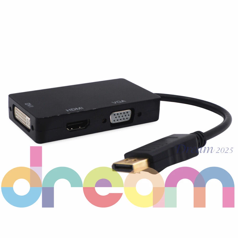 Brand New 3 In 1 Displayport DP Male To HDMI/DVI/VGA Female Adapter Converter Cable 1080P Features Connects a DisplayPort DP equipped laptop or desktop to an HDTV, monitor, or projector with HDMI/DVI/VGA; Only supports 1 display output at a time, HDMI/DVI/VGA cable (sold separately) is required. Transmits high-definition audio and video from your computer to an HDTV display for video streaming or gaming via HDMI; Connect and configure your monitor for an Extended Desktop or Mirrored Displays Supports video resolutions up to 1920x 1080P (Full HD) and uncompressed digital 7.1, 5.1 or 2 audio channels.When connect to monitor, audio will not pass through the adapter to the HDMI/VGA/DVI monitor, a speaker is needed to get audio out; When connect to TV, only HDMI port can have audio out, VGA and DVI ports need a speaker to get audio out Silver-plated connectors resist corrosion, provide durability and improve the signal transmission DisplayPort connector with latches provides a secure connection with a release button that must be depressed before unplugging Specifications Can only convert signal from DisplayPort to HDMI/DVI/VGA. This is not a bi-directional adapter Input: DisplayPort Male,(Not compatible with USB ports) HDMI: Output, 19-pin, Female (Note: A separate HDMI cable is required, not included, ) DVI: Output, 25-pin DVI-D (Note:A separate DVI cable is required, not included ) VGA: Output, 15-pin, Female (Note:A separate VGA cable is required, not included) Note: Not compatible with USB ports - Color: Black IMPORTANT NOTE - It does not support more than one output simultaneously - When connect to monitor, audio will not pass through the adapter to the HDMI/VGA/DVI monitor, a speaker is needed to get audio out; When connect to TV, only HDMI port can have audio out, VGA and DVI ports need a speaker to get audio out - Depress the button on the DisplayPort connector to release the latches and avoid damage when unplugging - This adapter is NOT compatible with USB port on your computer Includes 1 x Displayport Dp to Hdmi/dvi/vga Male to Female 3-in-1 Adapter Converter Cable Warranty : 12 Months Return & Refund : Refund or replacement request is available only the requests within 1 week after parcel received & returning the item as the same condition as received. Shipping : We ship to eBay address. Please make sure your address in ebay is matched with your shipping address before you pay. W e ship your product in 3 days and provide the tracking number. Generally, about 5-10 working days to UK, USA, AU, CANADA, France,Germany,Japan South korea. Other countries in the region: usually takes 15-30 working days. You may sometimes experience longer delivery time due to customs-related delays. If you we are not satisfied with the product or service ,please contact me and don't give us negative or natural feedback,We must give you a satisfactory solution. We have many products not listed.Please send message If you need more with better price. Our working time: Beijing time :Monday to Friday 9:00 am to 6:30 pm. We do not work holidays in China. if you send email to us,In our working hours will be resumed within 48 hours. Feedback & DSRs (Detailed Seller Ratings): We depend on our eBay reputation and customer satisfaction to succeed. We would like to earn your good feedback and 5 star DSR rating.