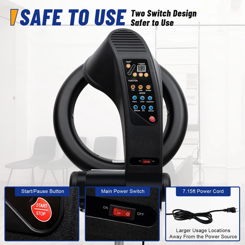 Description This beautiful and practical hair dryer is your ideal choice. High-quality materials make it safe and durable. It uses high-power infrared heating technology to achieve rapid heating and save time. At the same time, multiple functions can meet customers' daily styling needs. The four universal wheels at the bottom and an extended power cord are convenient for movement and use. Its high-quality and beautiful appearance will attract more customers for you. Key Features Build to Last: Premium iron, aluminum, ABS, and exquisite painting and electroplating process make this product wear-resistant, corrosion-resistant, high-temperature, and deformation-resistant, so it can withstand the test of time. Package Included 1*Freestanding Hair Dryer 1*English Manual 3 In 1 Hair Dryer Roller Ball Climazone Infrared Color Processor Salon Perming Description This beautiful and practical hair dryer is your ideal choice. High-quality materials make it safe and durable. It uses high-power infrared heating technology to achieve rapid heating and save time. At the same time, multiple functions can meet customers' daily styling needs. The four universal wheels at the bottom and an extended power cord are convenient for movement and use. Its high-quality and beautiful appearance will attract more customers for you. Key Features Build to Last: Premium iron, aluminum, ABS, and exquisite painting and electroplating process make this product wear-resistant, corrosion-resistant, high-temperature, and deformation- resistant , so it can withstand the test of time. High Efficiency: The high-power machine (950W) use infrared technology to quickly heat up to the desired temperature, and the 360° rotating heating disc transfers heat evenly to the roots of the hair, reducing customer waiting time. Besides, it can help customers promote blood circulation, accelerate metabolism, and make hair elastic. Thoughtful Design: It has three working conditions to choose from cold air, hot air, and rotating. The blowing outlet can be adjusted up or down with a knob in the range of 30-45° so that you can comfortably enjoy the hair care process. In addition, its six function modes and adjustable temperature and time (10-60 minutes) make it easier for you to use. Adjustable Height : It is height adjustable from 58.46-66.14 inches to meet the needs of people of different heights, providing comprehensive lighting and better hair care. Convenient to Move: Four anti-sticky hair universal wheels allow you to move freely to any place with less noise. Safe to Use: The approximately 7.15ft long power cord provides you with more usage locations while keeping you away from the power source. It will be safer to turn on the main power switch and select the usage mode before pressing the start/pause button. Easy to Clean: The smooth surface makes it very easy to clean, so you just need to gently wipe it with a cloth. Beautiful Appearance: The classic black and smooth surface makes it look very neat and beautiful. High beauty value makes your work more enjoyable. Protective Package: The double wrapping of foam and cardboard box can effectively protect the product in transit. Buy with Confidence: We are honored that you have chosen our product. We have sufficient confidence in the quality of the product so that you can buy it confidently. But if you have any questions, you can contact our customer service, he will patiently answer and solve your problems. Details Stable Base: The sturdy support rod and large four-legged base ensure good stability, making it safer to use. Heat Dissipation Holes: It comes with cooling holes to help the machine dissipate heat promptly, ensuring safety and extending service life. Clear Display: You can see the temperature and time clearly with the display on the control panel. It makes your operation easier. Application It can be used in barbershops, beauty salons, and other places, and is suitable for perms, color, treatment, semicolor dryhead care, and so on. Specification Color: Black Martial: Aluminium, Iron, ABS Process: Painting, Electroplating Technology: Infrared Plug Type: US Standard Voltage: 110V Power: 950W Frequency: 60Hz Time Control Range: 10-60mins Three Functions: Fan, Heat, Rotate Six Modes: Perm, Color, Treatment, Semicolor, Dry, Manual Power Cable Length: 2.18m/7.15ft Heater Diameter : 50cm/19.69inch Base Size: 68*49cm/26.77*19.29inch Height Adjustment Range: 148.5-168cm/58.46-66.14inch Package Size: 69*52*39.5cm/27.17*20.47*15.55inch Gross Weight: 12.05kg/26.57lbs Net Weight: 10.25kg/22.6lbs Package Included 1*Freestanding Hair Dryer 1*English Manual All Accessories for Assembly Notes Please read the manual carefully and pay attention to the safety precautions inside. External collision should be avoided. Please allow the slight color difference caused by the shooting light and the 1-3cm error due to manual measurement, and make sure you do not mind before ordering. Payment Delivery details Terms of sales About us Contact us Payment We accept ebay payment 。 Fees such as import duties, taxes are not included in the item price or shipping costs. These charges are the buyer's responsibility. Delivery details Shipping: 2-9 working days to: USA Terms of sales We maintain high standards of excellence and strive for hundred percent customer satisfaction. Feedback is very important to us. We hope that you contact us immediately before you give neutral or negative feedback, so that we can address your concerns. It is impossible to address issues if we do not know about them! About us Your satis faction is our ultimate goal. We work hard to earn your trust and future business. Our certified technicians have tested each item before shipping. The unit comes with 1 year limited warranty on all manufacturing defects. a) If you receive a defective item, you may return it or ask for a discount. Please contact us within 14 days after you receive the package. b) What you returned must be intact and in i