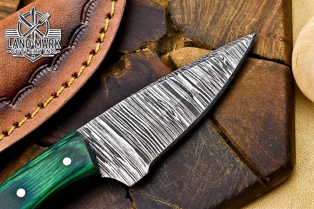 This Damascus steel hunting knife is a stunner—razor-sharp, perfectly balanced, and the green Pakka wood handle feels luxurious. The leather sheath is a sleek touch. I love the craftsmanship; it's a reliable little beast for outdoor tasks. The combined shipping discount is a nice bonus if you grab more than one. Great value for such a well-made blade!