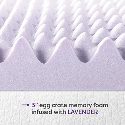 Egg crate topper type memory foam provides a great sleeping surface. In normal temperatures It is somewhat firm, but when you lay down, it starts reacting to the temperature of your body and begins to mold itself to your shape. Then, the weight is evenly distributed along the surface, relieving pressure points and helping you to sleep more without tossing and turning. 3 years . Amazing comfort from body-conforming memory foam Responsive active suspension isolates motion so no disruption for your sleep partner Body-conforming memory foam provides pressure all throughout the body Soothing lavender infusion works as a natural relaxant for calming sleep Product Note: Please allow up to 72 hours for the topper to rise