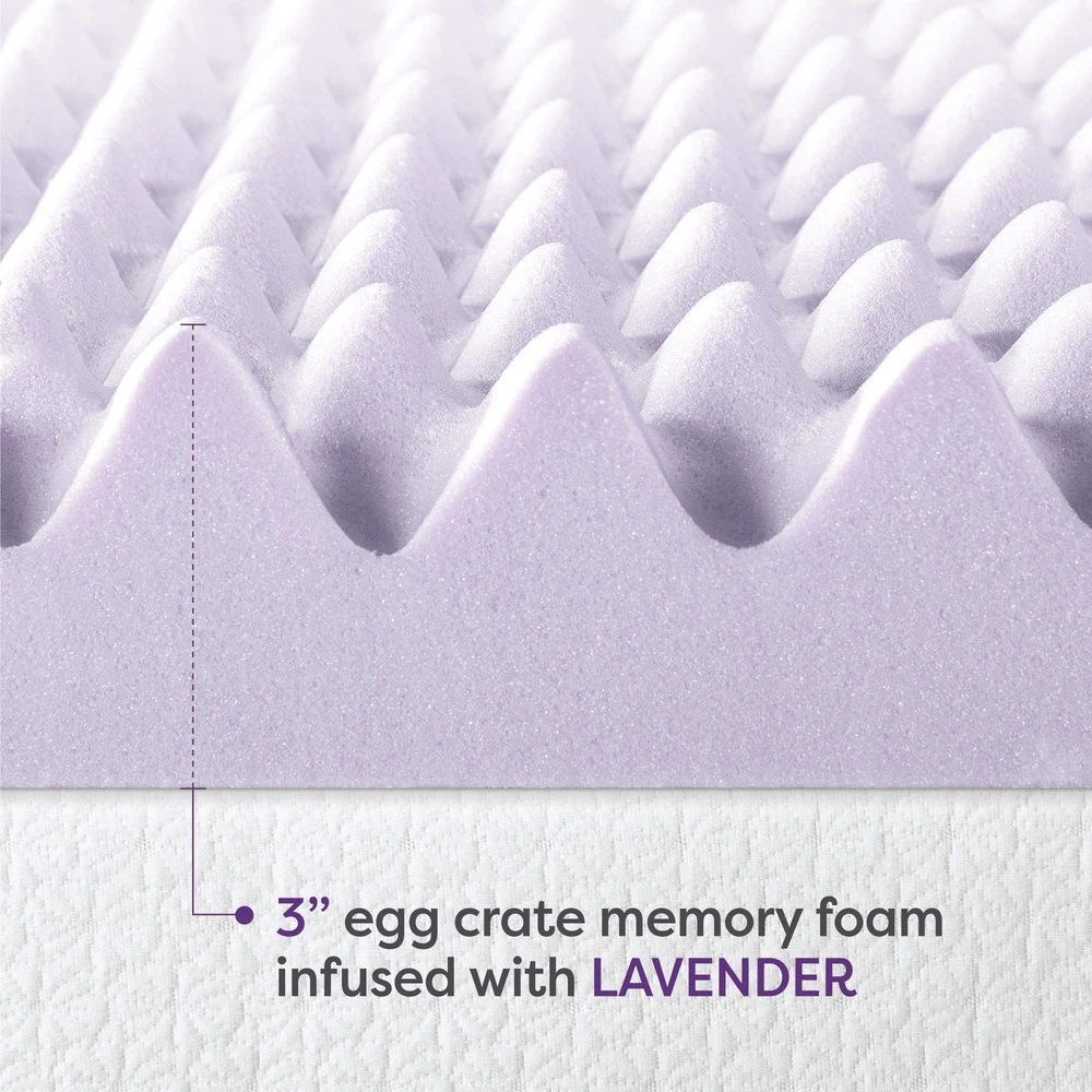 Egg crate topper type memory foam provides a great sleeping surface. In normal temperatures It is somewhat firm, but when you lay down, it starts reacting to the temperature of your body and begins to mold itself to your shape. Then, the weight is evenly distributed along the surface, relieving pressure points and helping you to sleep more without tossing and turning. 3 years . Amazing comfort from body-conforming memory foam Responsive active suspension isolates motion so no disruption for your sleep partner Body-conforming memory foam provides pressure all throughout the body Soothing lavender infusion works as a natural relaxant for calming sleep Product Note: Please allow up to 72 hours for the topper to rise