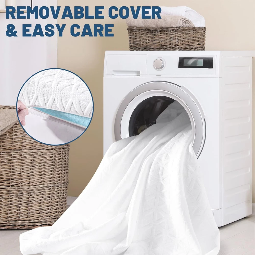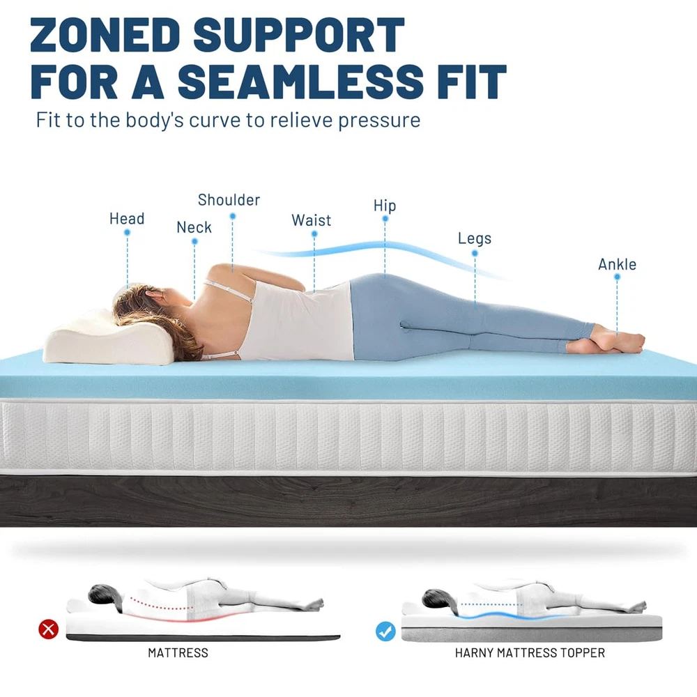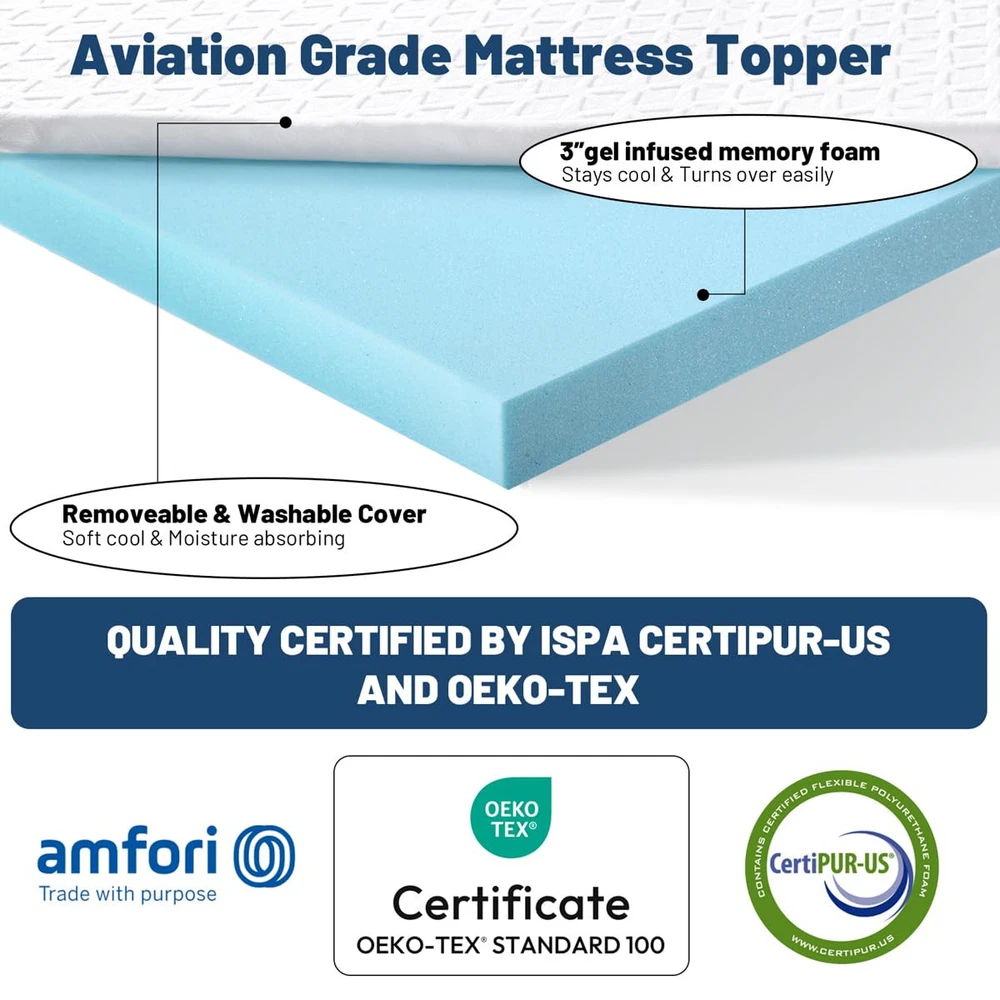 Cooling Gel Memory Foam: Made of high-density memory foam and gel beads to provide, it absorbs and dissipates heat while providing good support, helping to relieve common pressure points, prevent you from falling into foam, and improve your sleep experience Premium Fiber Cover: Use skin-friendly viscose fiber, it makes the mattress cover more breathable, cool and Breathable. Zipper closure for easy disassembly and washing, effectively preventing dust and allergies Dual Anti Slip: The back of the cover is evenly distributed with small anti slip particles, and four adjustable elastic bands are added to increase friction and prevent displacement. No matter how you flip it at night, it can remain the same Quality Certification: The memory foam mattress topper is certificated CertiPUR-US and Viscose cover is certificated OEKO-TEX. Meets specific content and performance standards, allowing you to enjoy healthy sleep Satisfaction Customer Service: We offer a 365 night 100% satisfaction Customer Service. 10 -Year Customer Service for Quality-Related Issues. If you have any question, please contact us and We will provide 100% satisfactory after-sales service Warm Tips: Allow 24-48 hours for new foam smell to dissipate and fully expanded. Low temperature may need more time, find a suitable temperature(78℉) will shorten the time