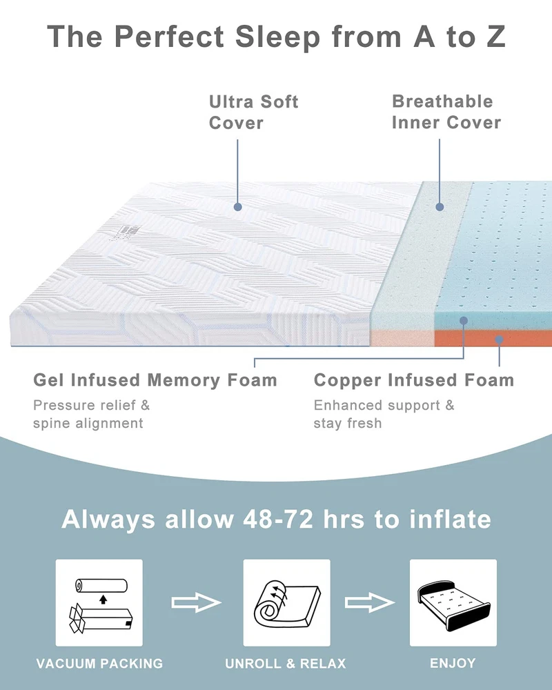 Contouring Comfort: Designed to correctly align the spine and cradle your curves, this queen size mattress topper helps relax as you are catching some Z’s Two Layer Design: The 3 inch mattress topper is crafted from gel memory foam and copper supportive foam. Together they can offer you additional comfort and adequate support during sleep Benefits of Copper: The advanced copper-infused topper is extremely efficient in maintaining the freshness of your foam bed topper Choose Your Plush: The memory foam toppers come in 2/ 3/ 4 inches for customized softness. Just select the height to suit your preferred level of comfort What You Get: memory foam mattress toppers come with CertiPUR-US foam. And we’ve got you covered for manufacturing defects 3 Inch Gel Memory Foam Mattress Topper Queen