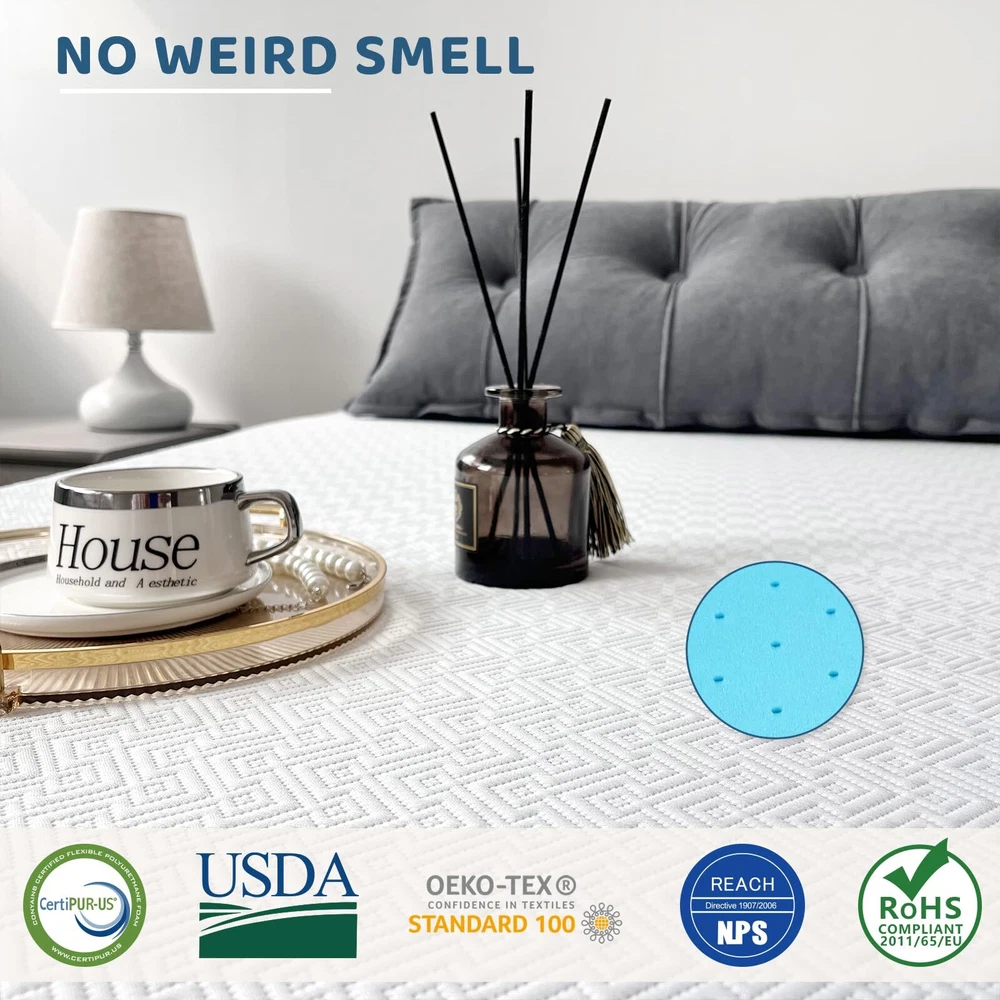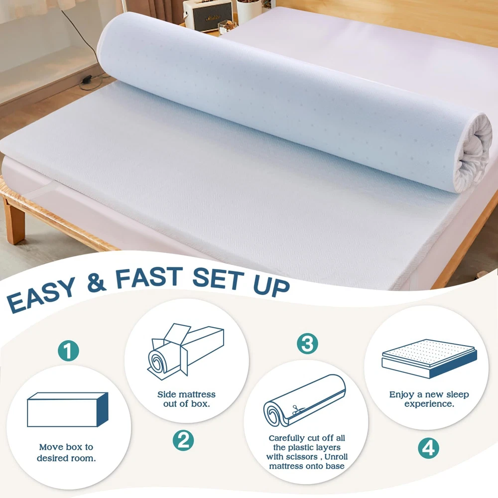 【Upgraded Gel Memory Foam & no weird smell】No smell at all. High-density memory foam provides adaptive comfort and support. memory foam mattress topper is breathable to prolong the service life of the mattress, and will bring you a new sleeping experience that is comfortable and not stuffy all night. Enjoy deeper and better and more comfortable sleep. 【Certification】The topper has obtained CertiPUR US certification and cover is certificated OEKO-TEX. Undergone rigorous testing, meeting standards for harmlessness, materials, performance, and durability. It is also very friendly to pregnant women and children, and is suitable for all families 【Skin-friendly Cover & Durable Zipper】Made with skin-friendly and breathable fiber. The topper cover is machine washable and wear-resistant, with adjustable elastic straps and anti-slip surface backing to prevent sliding, straps are stretchy and reliable. Premium durable zipper for convenient disassembly and washing, won't break. Keep your topper fresh and clean. 【Pressure Release and Support】The memory foam mattress topper can easily fit the curve and shape of your body, and the stress points are evenly distributed, without compressing the spine and joints, so as to achieve better sleep. Sleeping on a memory foam mattress feels like floating on clouds, with blood flowing throughout your body, providing a perfect sleep experience. You couldn’t even feel the floor under. 【Breathable & Ventilated Design】The gel memory foam mattress topper is infused with heat-absorbing gel to regulate temperature, and the vents increase airflow for breathability. No trapped heat with this topper. Compared with ordinary memory foam, it is more breathable, more sensitive, and softer. 【Tips】Allow 24-48 hours for expansion. After your topper is fully expanded, you could enjoy the benefits of topper. it's a game-changer for you. You deserve a restful night! 【Worry-Fr ee 10-Year Limited Warr anty】Provides 120-day guarantee, 10-year worry-fr ee warr anty, and lifelong . If you have any questions, please feel fr ee to us and you will receive a satisfactory response within 24 hours.
