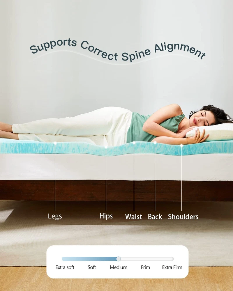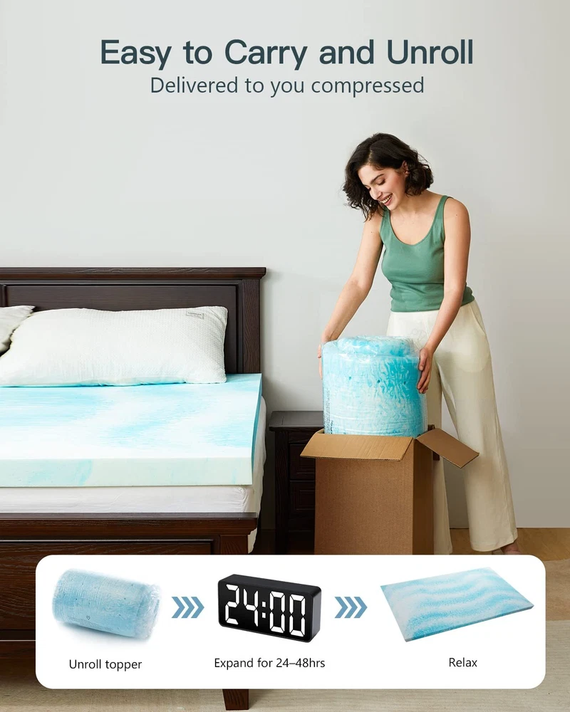 Upgraded Sleep Experience: Improve comfort & support for sleep without spending a fortune on a new bed. Renew an old mattress, transform a hard mattress, or enhance a new mattress with this queen memory foam mattress topper. All-Night Comfort: This high-density memory foam mattress topper queen conforms to your body and provides real support for shoulders, back, waist, hips, and legs. It's suitable for all sleeping positions and brings ultimate relaxation. Breathable & Cool: This queen bed topper is breathable and has airflow channels to carry excess heat away, helping you have a cool night. It's also infused with cooling gel for an enhanced cooling effect. Certified Mattress Topper: The queen foam mattress topper has been tested to meet rigorous CertiPUR-US standards for content, emissions, and durability. It's safe and skin-friendly, so the whole family can use it with confidence. Easy to Carry & Unroll: The foam mattress topper is convenient for use around the home on sofa beds, air mattresses, and floors. The topper is delivered to you compressed and needs 24–48 hours to fully expand (may take longer in low temperatures).