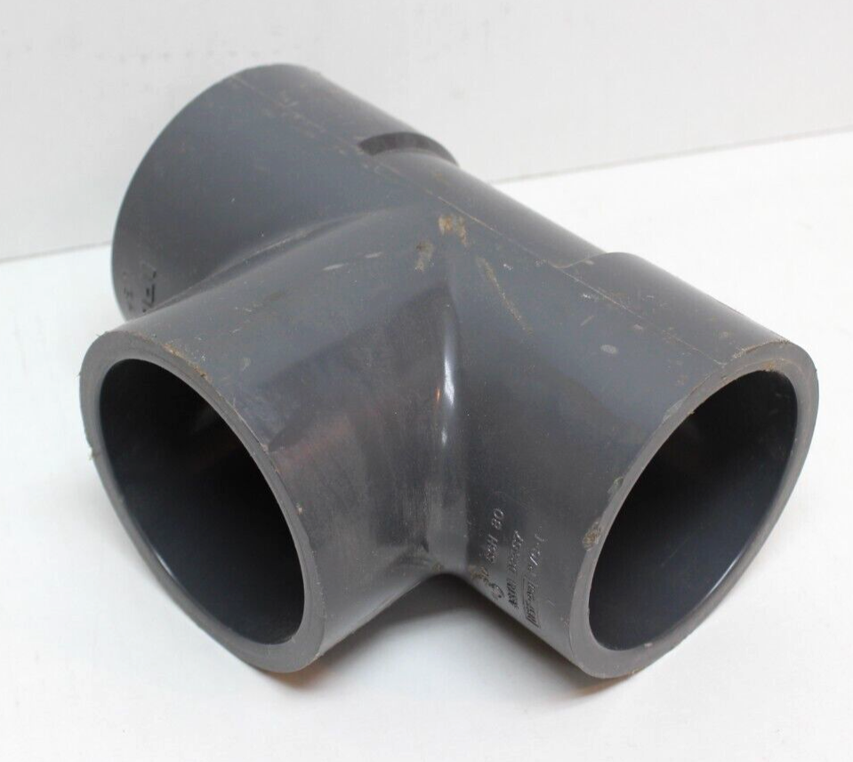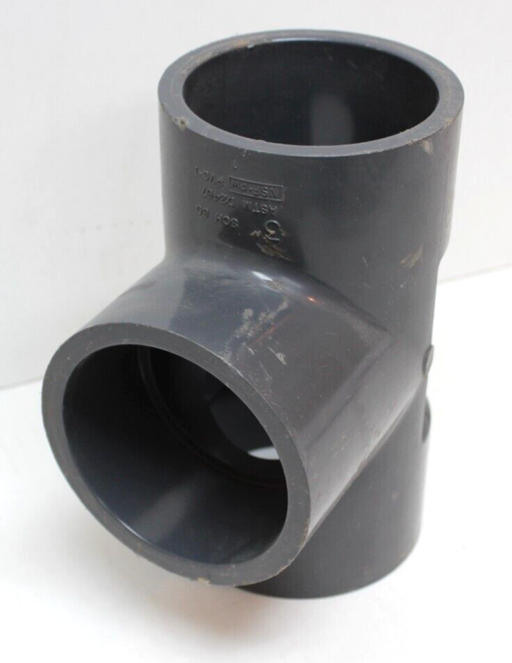 The Ipex 3" Sch80 Socket Weld PVC Tee is a fitting used in hydraulics, pneumatics, pumps, and plumbing applications. It is designed with a socket weld connection for easy installation. The tee allows for the branching of pipelines, creating a T-shaped junction for fluid flow. Made of durable PVC material, this tee is suitable for use in various industrial settings.