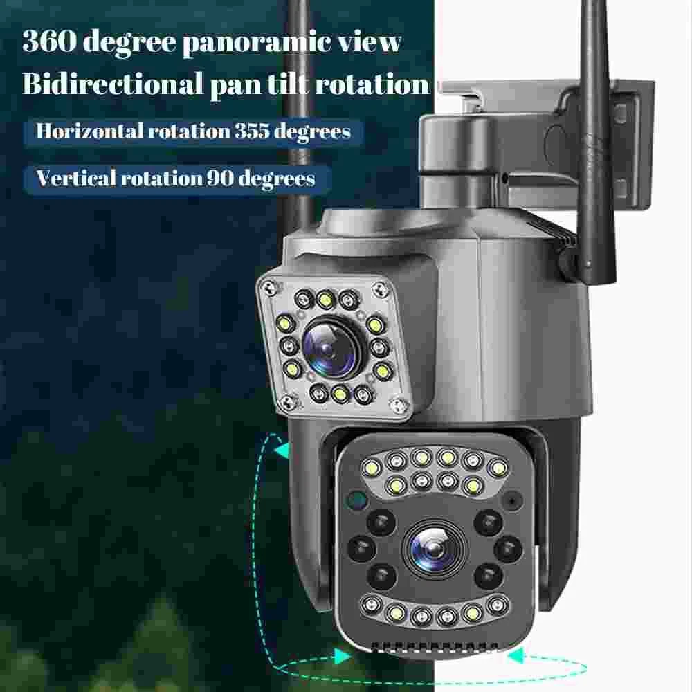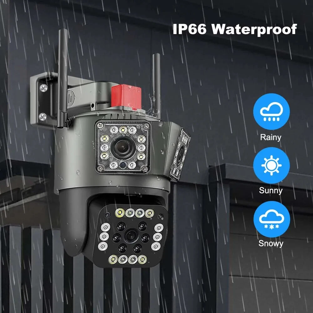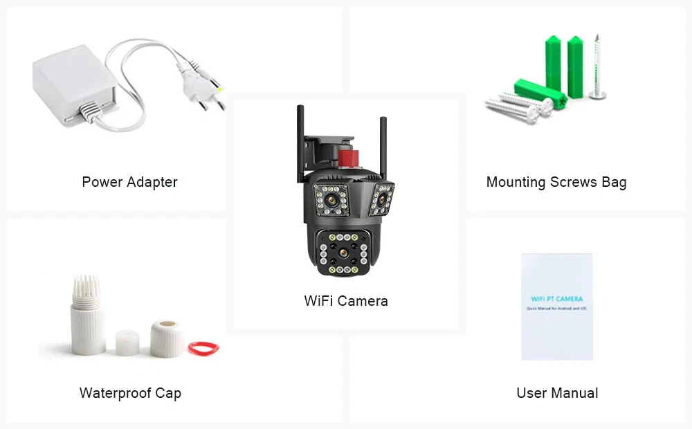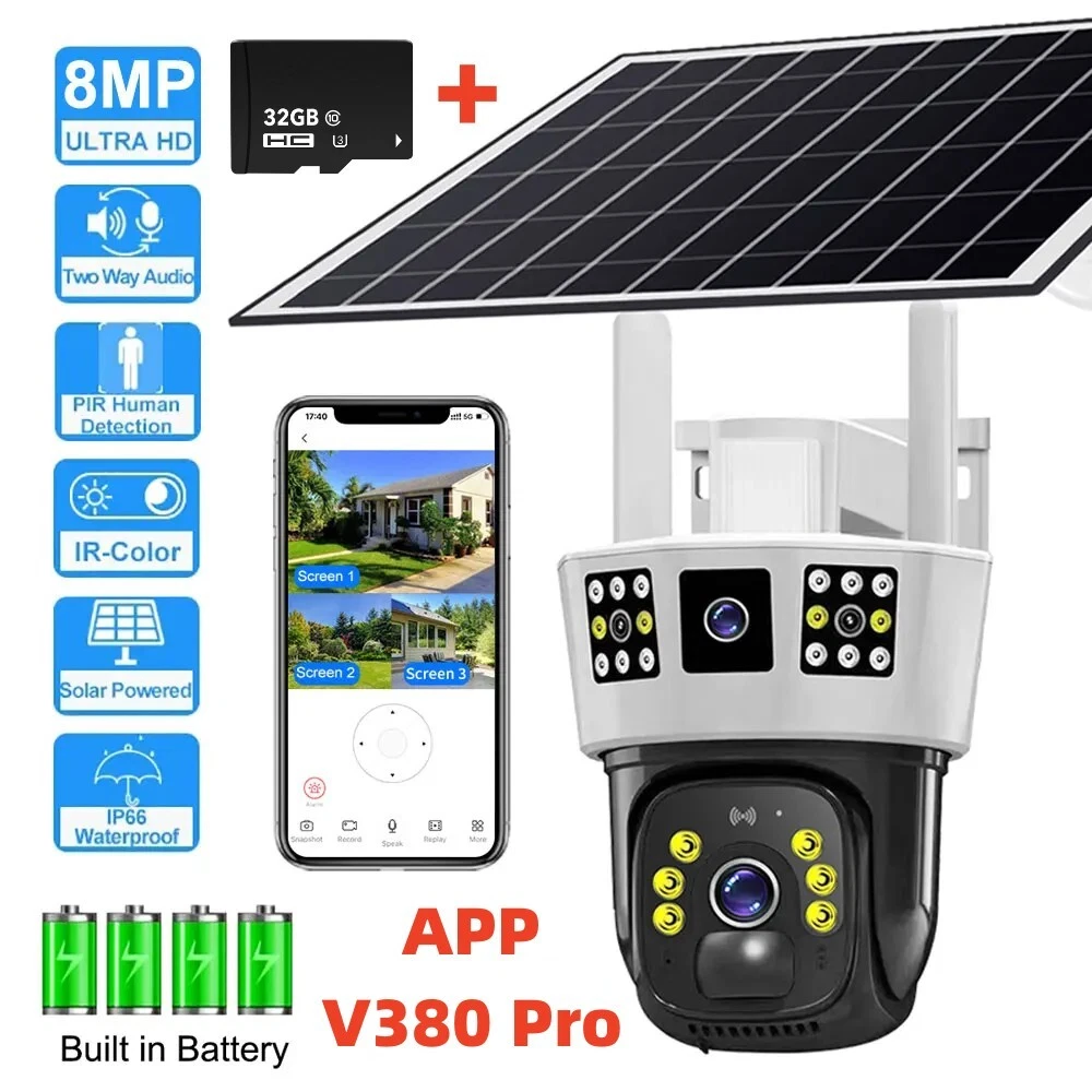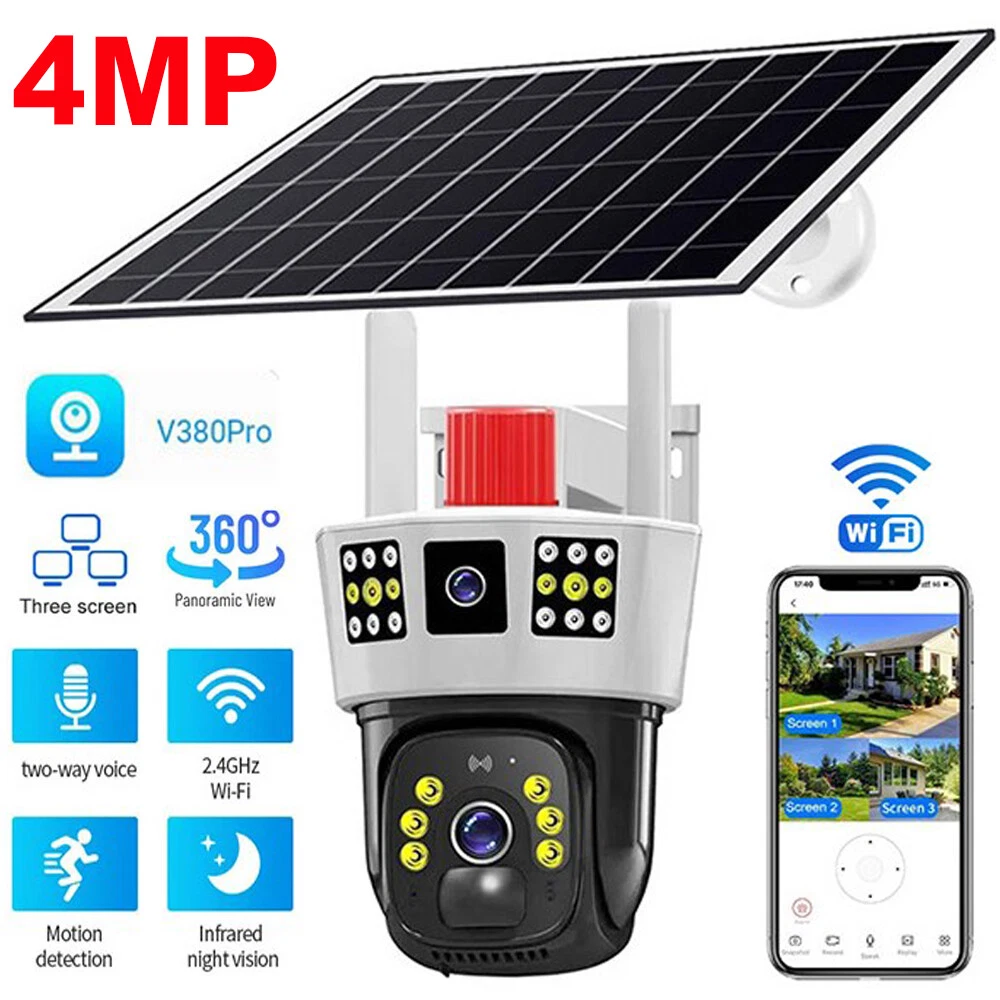 9MP Camera Product specifications: Sensor: 3MP+3MP+3MP Lens: 3.6mm Infrared light: upper infrared 12 lights, white 10 lights, lower infrared 10 lights, white 4 lights Low illumination: 0.01Lux Effective distance: 8-10 meters Switch: automatic Termination (s): N/A Thunder sensor: None 2. Video imaging Lens pixel: 3 million+3 million+3 million Compression format: H.264 High profile Effective resolution: 1920x1080P Visual angle: 105 degree Frame rate: 1080P 18FPS Mirror flip function: Yes Visual mode switching: ultra clear&high-definition&automatic 3. Audio Voice communication: two-way intercom Audio input: built-in microphone Audio output: built-in speaker 4. Network mode Network interface: wireless (WiFi) or 4G, without network port Network protocols: IP, TCP, DHCP WPS Domain name resolution: Yes Port transmission: P2P Platform: Dual Stream DHCP: Automatic 5. Wireless Output power: 802.11g: 10.95dBm (0.012w) 802.11b: 10.74dBm (0.012w) 802.11nHT40: 11.58dBm (0.014w) 802.11nHT20: 11.07dBm (0.013w) Frequency: 2412-2462MHZ 6. Antenna Antenna: omnidirectional antenna Antenna gain: 3dBi Network security: WEP, WPA-PSK, WPA2-PSK FCC identification number: 2APD7-R9820 Bandwidth: 40000 khz Modulation: DSSS, OFDM 7. Pan tilt Pan tilt angle: horizontal left and right: 355 degrees, vertical up and down: 110 degrees“ 8. Control Management Remote control: App remote Multi user management: Share up to 5 users Split screen view: up to 4 split screens display Mobile applications: IOS&Android 9. Alarm and notification methods Mobile detection: yes Information push method: Mobile phone automatic push (1 image, 3 second video) Information push interval: 5 seconds APP name: IPC360 home Storage method: Amazon Cloud (overseas) Alibaba Cloud (mainland)/TF Dual Lens Camera Features : 1. 2K 4MP (2MP+2MP) HD Dual Lens Network IP Camera For Indoor&Outdoor 2. Dual light source design, built-in 8 pcs infrared light + 8 pcs white light, night vision infrared and night vision full color can be set; 3. Pan&Tilt: horizontal 0~350 degrees, vertical 0~90 degrees; 4. 2.4G WIFI + RJ45 network port for Internet access; 5. power supply DC 12V/2A 6. Dual Design, Support SD / TF storage and cloud storage; 7. Two-way voice intercom, two-way video synchronous recording and playback 8. Humanoid detection/vehicle detection/pet detection/other detection 9. Automatic tracking/movement alarm, alarm output sound and light linkage; 10. AI intelligent algorithm to achieve video 3D positioning and continuous tracking of target alarms; 11. Support Android/IOS APP remote management (V380 Pro). Real Two Way Audio Notice: APP: V380 PRO does not support 10XZOOM 3 Lens Camera Ensure your home is protected from every angle with our cutting-edge surveillance technology. The Double 3MP WiFi Camera features not one, but two lenses and three imaging screens, providing a 360-degree view with no blind spots. two of these lenses serving as decorative elements with the LED lights working properly.Keep a watchful eye on every corner and enjoy the peace of mind that comes with comprehensive security. VTS01 3 Lens Camera 3 screens shows on the V380 app Three images can be viewed simultaneously, and each image can be individually enlarged. Real time alerts Set up monitoring areas in advance, conduct actual testing, and promptly push alarm information. IP66 Waterproof / Dustproof The camera is equipped with IP66 case , which is waterproof, sun-proof and dust-proof. It is suitable for any environment. Clear Two Way Audio Built-in microphone and speaker / Customized new speakers with loud volume; You could talk to anyone nears the camera ( Warn someone to leave your house ). Advanced H.265 Video Compression H.265 (HEVC) doubles the coding efficiency compared with its predecessor H.264. H.265 video saves around 50% of the bit rate at the same quality of coding.H.265 only need less bandwidth,faster loading speed,more smooth video,Lower bite rate,higher image quality! 10X Zoom(Both 3 cameras support zoom) you can switch from 1X to 10X zoom instantly;it can fast zoom in or zoom out without lag;watch far and near images Simultaneously through Picture in Picture,don't miss a detail. Full Color Night Vision: When the white LED light is on, the camera will display colorful vision at night, and there are three night modes for you to choose. Ai Human Detect Alert Quickly finds human targets and immediately sends a notification to your phone, letting you see what happens anywhere. It only detects the human shape and will not trigger falsely for objects such as cars and trees. PTZ Control by APP Rotates 355° Horizontally and 90° Vertically.You can control it in the APP directly whenever you want and wherever you are.