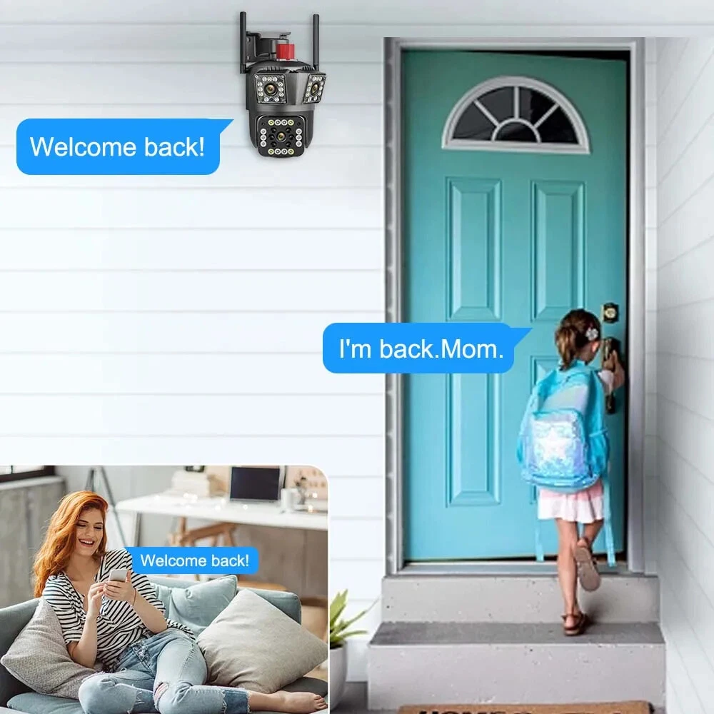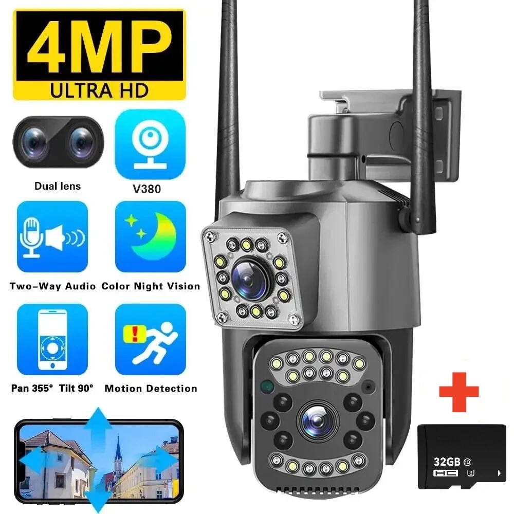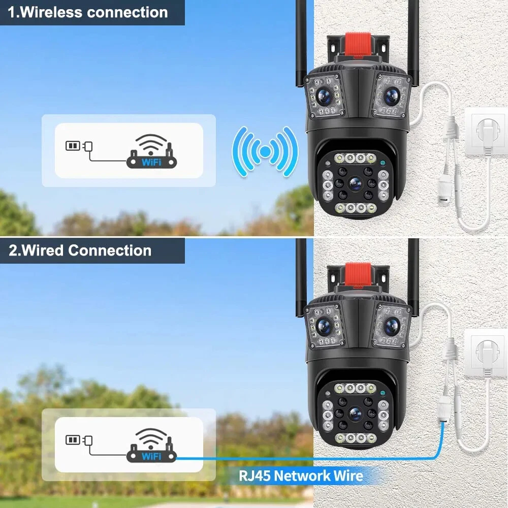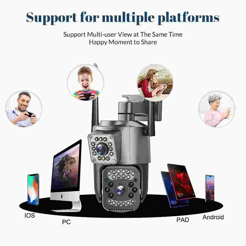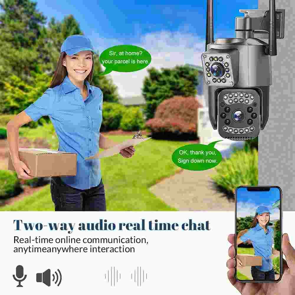 9MP Camera Product specifications: Sensor: 3MP+3MP+3MP Lens: 3.6mm Infrared light: upper infrared 12 lights, white 10 lights, lower infrared 10 lights, white 4 lights Low illumination: 0.01Lux Effective distance: 8-10 meters Switch: automatic Termination (s): N/A Thunder sensor: None 2. Video imaging Lens pixel: 3 million+3 million+3 million Compression format: H.264 High profile Effective resolution: 1920x1080P Visual angle: 105 degree Frame rate: 1080P 18FPS Mirror flip function: Yes Visual mode switching: ultra clear&high-definition&automatic 3. Audio Voice communication: two-way intercom Audio input: built-in microphone Audio output: built-in speaker 4. Network mode Network interface: wireless (WiFi) or 4G, without network port Network protocols: IP, TCP, DHCP WPS Domain name resolution: Yes Port transmission: P2P Platform: Dual Stream DHCP: Automatic 5. Wireless Output power: 802.11g: 10.95dBm (0.012w) 802.11b: 10.74dBm (0.012w) 802.11nHT40: 11.58dBm (0.014w) 802.11nHT20: 11.07dBm (0.013w) Frequency: 2412-2462MHZ 6. Antenna Antenna: omnidirectional antenna Antenna gain: 3dBi Network security: WEP, WPA-PSK, WPA2-PSK FCC identification number: 2APD7-R9820 Bandwidth: 40000 khz Modulation: DSSS, OFDM 7. Pan tilt Pan tilt angle: horizontal left and right: 355 degrees, vertical up and down: 110 degrees“ 8. Control Management Remote control: App remote Multi user management: Share up to 5 users Split screen view: up to 4 split screens display Mobile applications: IOS&Android 9. Alarm and notification methods Mobile detection: yes Information push method: Mobile phone automatic push (1 image, 3 second video) Information push interval: 5 seconds APP name: IPC360 home Storage method: Amazon Cloud (overseas) Alibaba Cloud (mainland)/TF Dual Lens Camera Features : 1. 2K 4MP (2MP+2MP) HD Dual Lens Network IP Camera For Indoor&Outdoor 2. Dual light source design, built-in 8 pcs infrared light + 8 pcs white light, night vision infrared and night vision full color can be set; 3. Pan&Tilt: horizontal 0~350 degrees, vertical 0~90 degrees; 4. 2.4G WIFI + RJ45 network port for Internet access; 5. power supply DC 12V/2A 6. Dual Design, Support SD / TF storage and cloud storage; 7. Two-way voice intercom, two-way video synchronous recording and playback 8. Humanoid detection/vehicle detection/pet detection/other detection 9. Automatic tracking/movement alarm, alarm output sound and light linkage; 10. AI intelligent algorithm to achieve video 3D positioning and continuous tracking of target alarms; 11. Support Android/IOS APP remote management (V380 Pro). Real Two Way Audio Notice: APP: V380 PRO does not support 10XZOOM 3 Lens Camera Ensure your home is protected from every angle with our cutting-edge surveillance technology. The Double 3MP WiFi Camera features not one, but two lenses and three imaging screens, providing a 360-degree view with no blind spots. two of these lenses serving as decorative elements with the LED lights working properly.Keep a watchful eye on every corner and enjoy the peace of mind that comes with comprehensive security. VTS01 3 Lens Camera 3 screens shows on the V380 app Three images can be viewed simultaneously, and each image can be individually enlarged. Real time alerts Set up monitoring areas in advance, conduct actual testing, and promptly push alarm information. IP66 Waterproof / Dustproof The camera is equipped with IP66 case , which is waterproof, sun-proof and dust-proof. It is suitable for any environment. Clear Two Way Audio Built-in microphone and speaker / Customized new speakers with loud volume; You could talk to anyone nears the camera ( Warn someone to leave your house ). Advanced H.265 Video Compression H.265 (HEVC) doubles the coding efficiency compared with its predecessor H.264. H.265 video saves around 50% of the bit rate at the same quality of coding.H.265 only need less bandwidth,faster loading speed,more smooth video,Lower bite rate,higher image quality! 10X Zoom(Both 3 cameras support zoom) you can switch from 1X to 10X zoom instantly;it can fast zoom in or zoom out without lag;watch far and near images Simultaneously through Picture in Picture,don't miss a detail. Full Color Night Vision: When the white LED light is on, the camera will display colorful vision at night, and there are three night modes for you to choose. Ai Human Detect Alert Quickly finds human targets and immediately sends a notification to your phone, letting you see what happens anywhere. It only detects the human shape and will not trigger falsely for objects such as cars and trees. PTZ Control by APP Rotates 355° Horizontally and 90° Vertically.You can control it in the APP directly whenever you want and wherever you are.