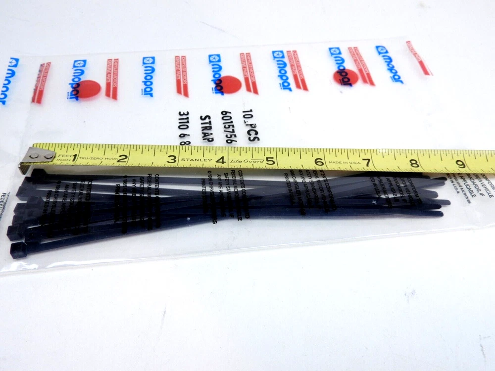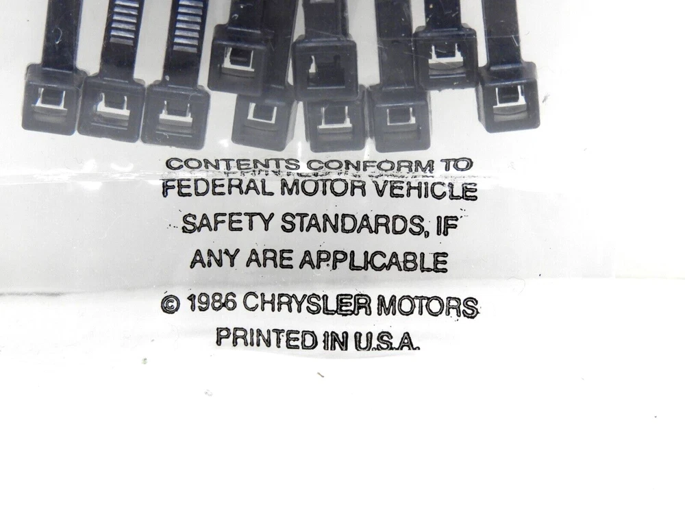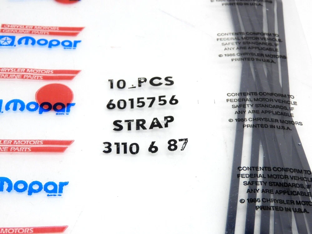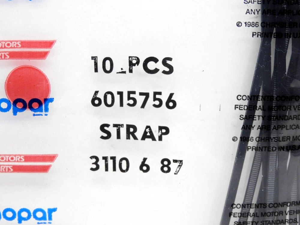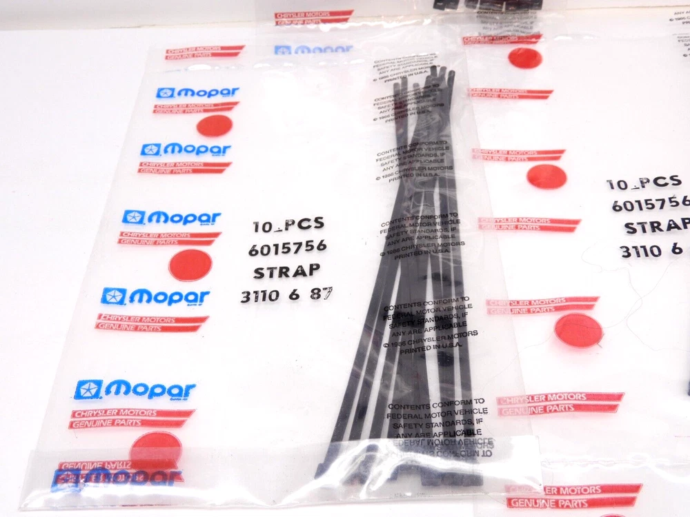 I'm offering... 3 NOS MOPAR SEALED PACKAGE OF 10 BLACK PLASTIC STRAPS CHRYSLER PART NUMBER: # 6015756 PACKAGE IS DATED JUNE 1987 THIS IS FOR 3 SEALED PACKAGES AS SHOWN! NICE ADDITION TO ANY MOPAR MEMORABILIA COLLECTION! PLEASE SEE ALL THE PICTURE'S INCLUDED WITH THIS AUCTION FOR CONDITION & PROPER APPLICATION PRIOR TO BIDDING. FREE SHIPPING! I will be happy to answer any questions. THANK YOU