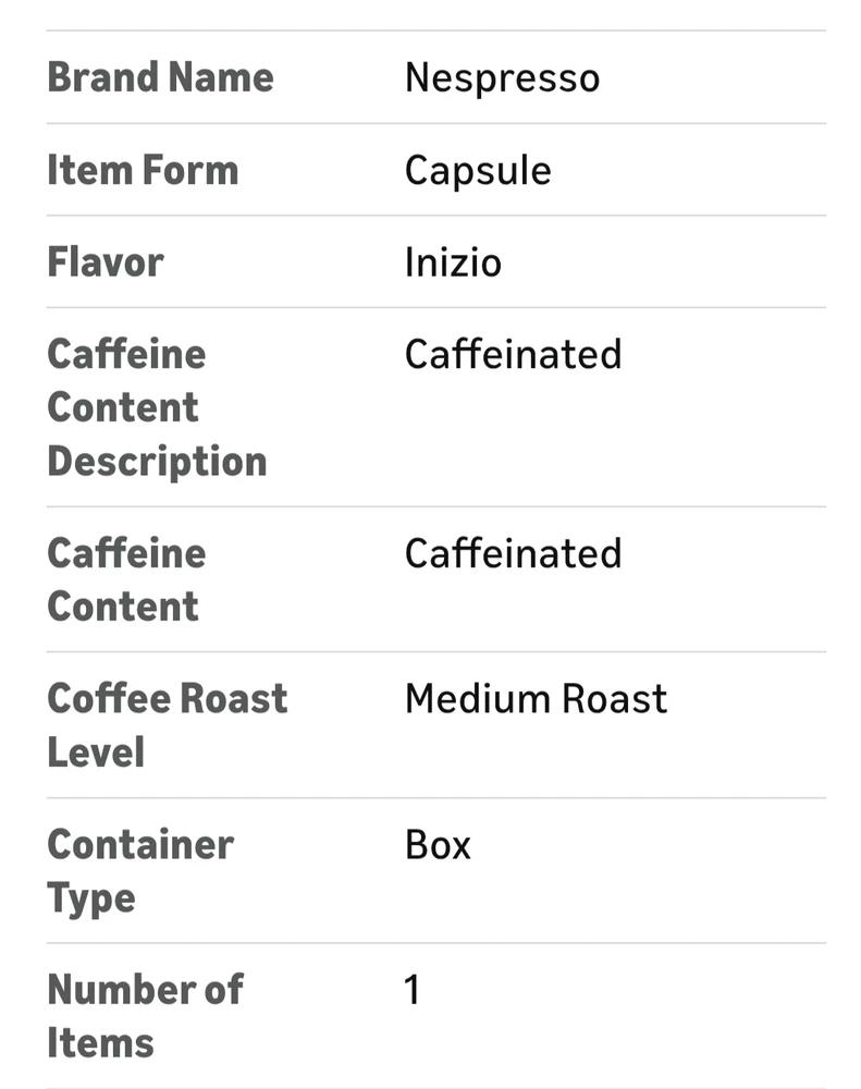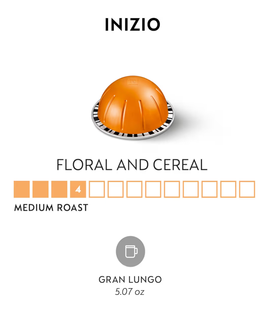 Roast: Medium Style: Capsules Compatibility: Nespresso Vertuo, Nespresso Calories per Serving: Less Than 50 Flavor: Medium Roast, Cereal, Coffee, Wild Florals Product Name: Inizio Gran Lungo Type: Lungo Expiration Date: 2/28/2026 Food Aisle: Pantry Serving Size: 1 Cup Product: Coffee Pod & Capsule Brand: Nespresso Country of Origin: Switzerland