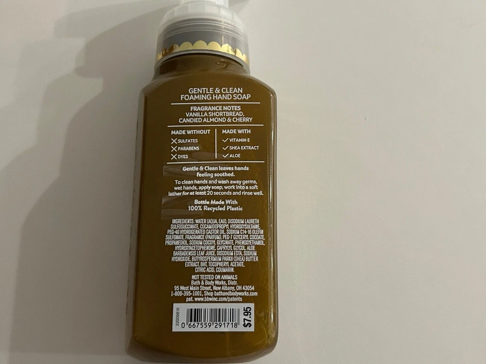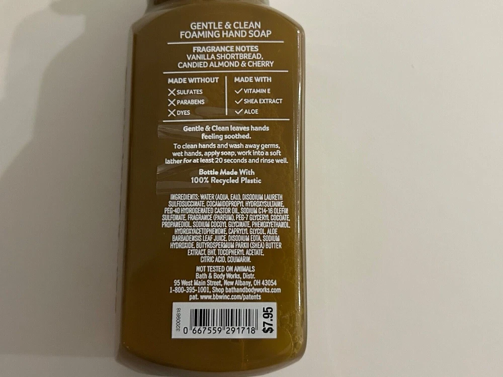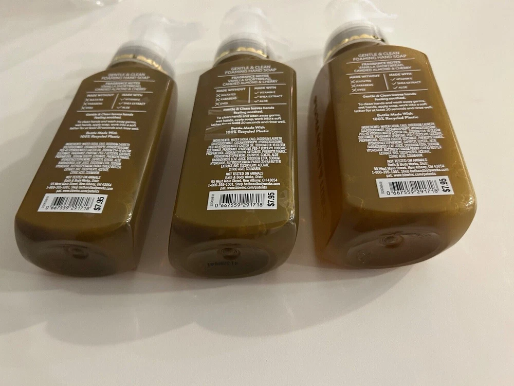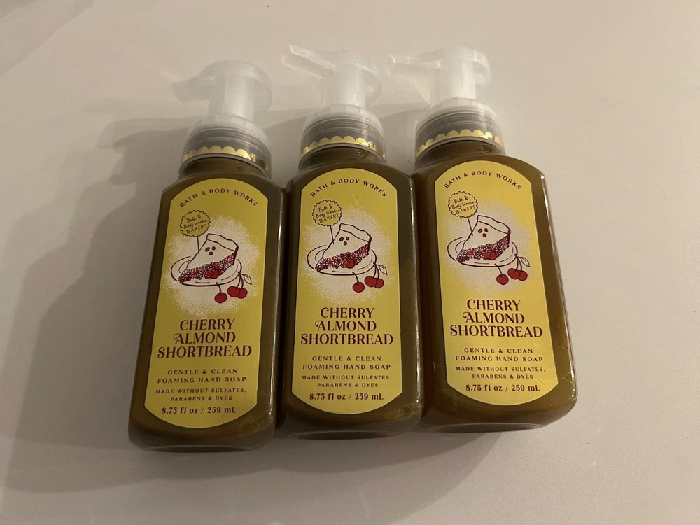This auction is for 3 identical, brand new, BATH & BODY WORKS Gentle & Clean FOAMING HAND SOAP i n CHERRY ALMOND SHORTBREAD scent in the 8.75 oz. size . They are brand new, never opened. You will receive exactly what is in the photos.This is a great deal with an amazing smell! I am including the clear cello bag and a to/from tag. I will send them out the same day that payment is made. Good luck!