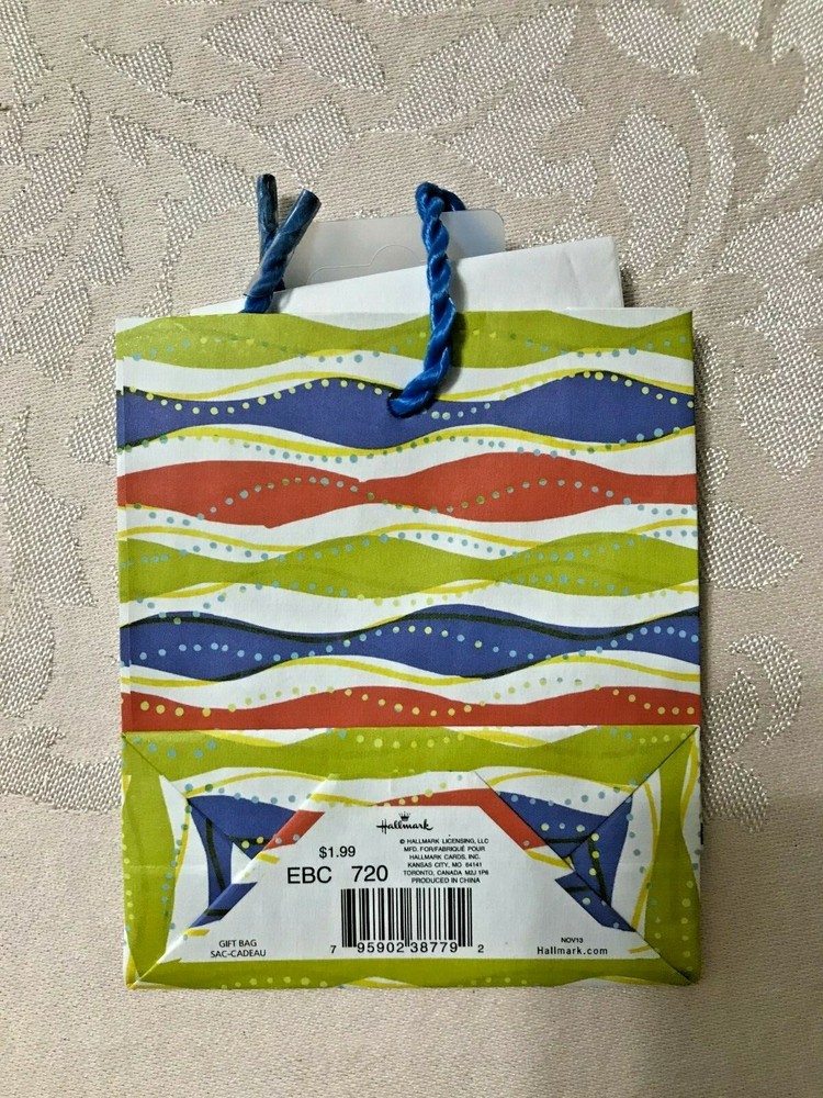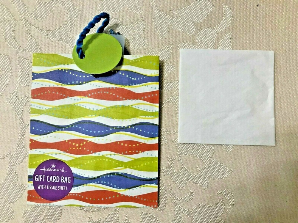 Gift Card Bags Lot of 3 - Red, Blue, & Green Stripes with White Tissue and Green Round Tag - NEW Measures about 4 5/8" Tall x 4" Wide x 1 3/4" Deep. Tag measures about 1 1/2" Ships by USPS