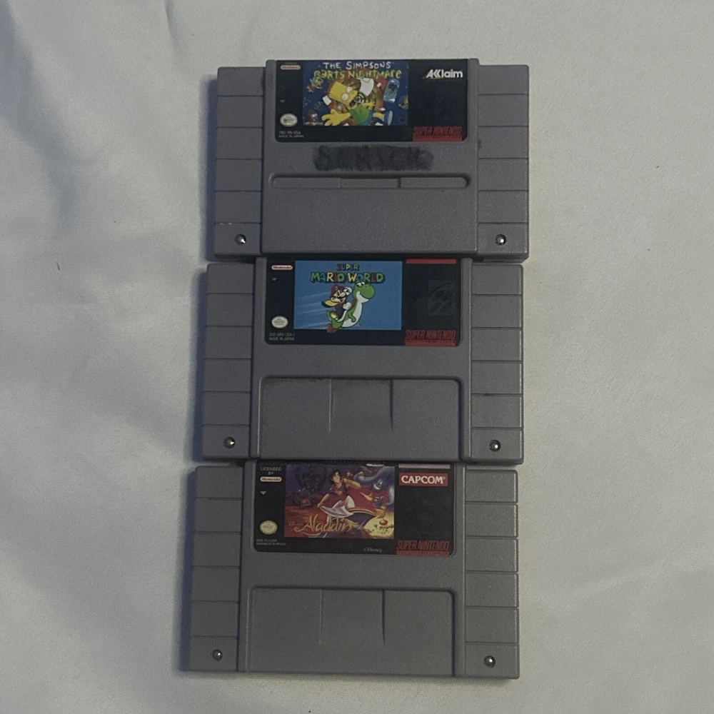 Embark on a nostalgic journey with this classic Nintendo NES bundle featuring three beloved games: Super Mario World, Aladdin, and Barts Nightmare. Each title offers a unique adventure, from the vibrant Mushroom Kingdom with Mario and Luigi to the mystical streets of Agrabah with Aladdin, and the spine-tingling escapades in Barts Nightmare. Ideal for collectors and retro gaming enthusiasts, these cartridges bring the charm of 16-bit graphics and timeless gameplay to your console. Whether you're reliving cherished memories or experiencing these platformer gems for the first time, this bundle promises hours of entertainment.