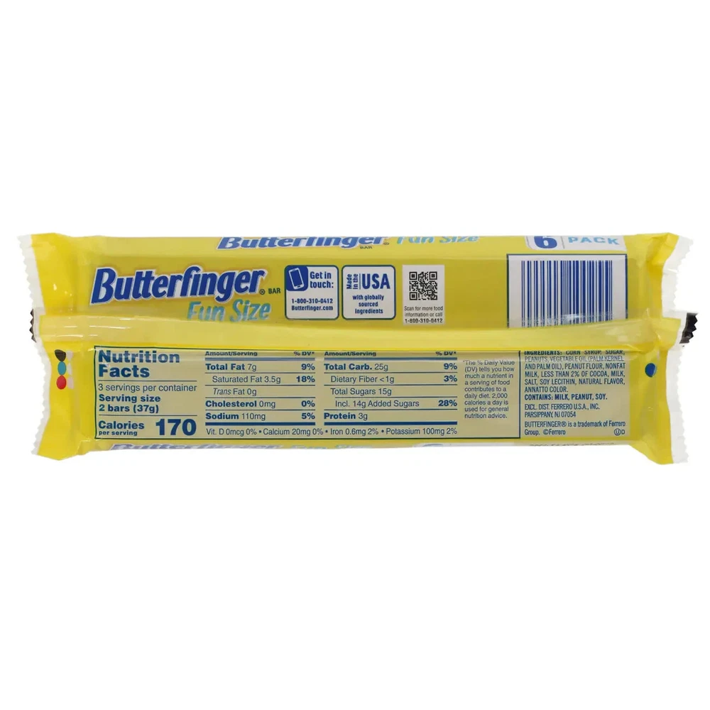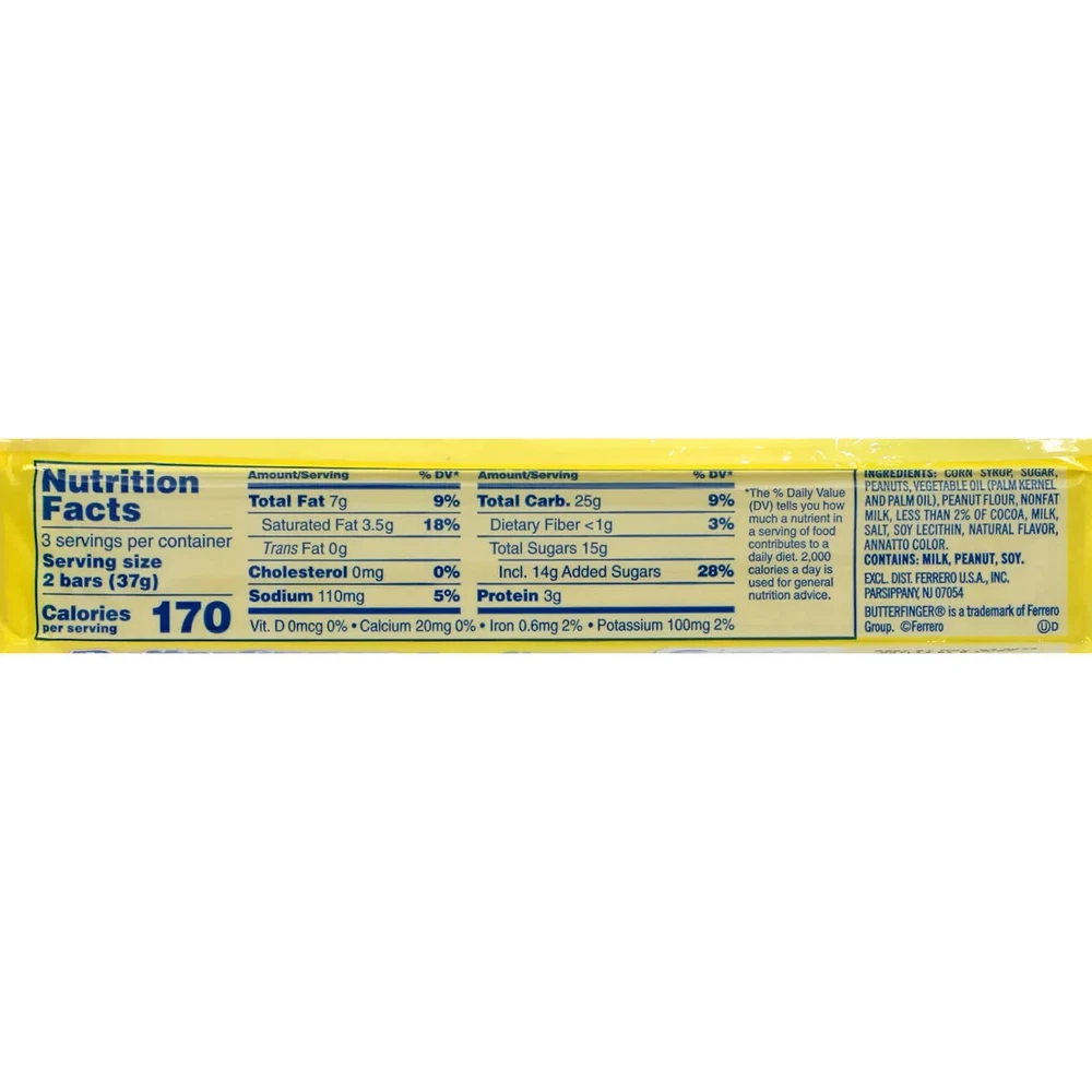 Product Details Crispety, crunchety, and peanut-buttery! With no artificial flavors or colors, Nestle(R) Butterfinger(R) bars are the perfect treat! Each 3.9-oz. pack contains six 0.65-oz. chocolate candy bars. Ideal for care packages, giveaways, and gift baskets and more. Specifications Assortment Details: 6-ct. Packs of Nestle(R) Butterfinger(R) Candy Bars Brand: Nestle(R) Material: Candy Width: 8.7 in Height: 2.563 in Length: 0.805 in Weight: 3.9 oz We are always here to serve you. Remember if you have any questions regarding your purchase, please contact us before making your purchase. And we will be very happy to help you. Also remember before leaving negative or neutral feedback please contact us and we are happy to help and resolve any situation. We are available Monday through Friday 9:00 am to 5:00 pm. Saturday, Sunday and holidays we are not available. Thank you so much.