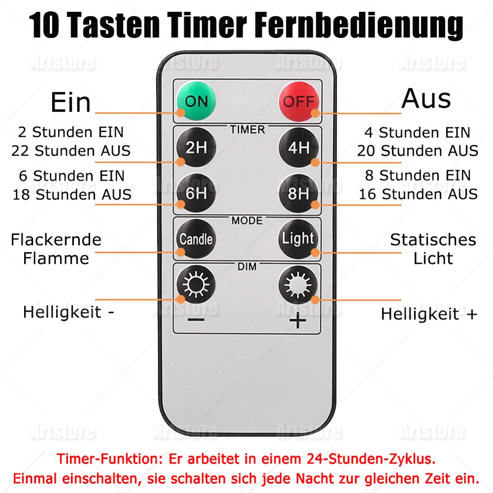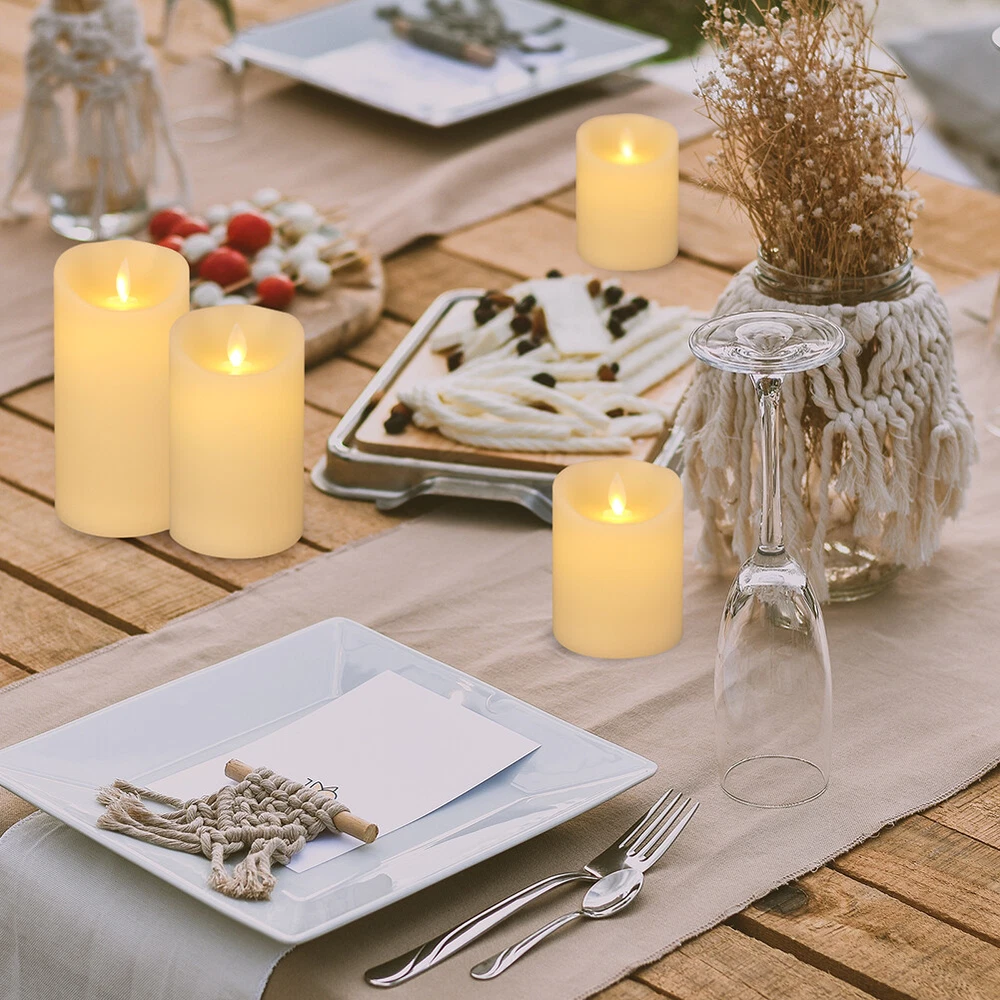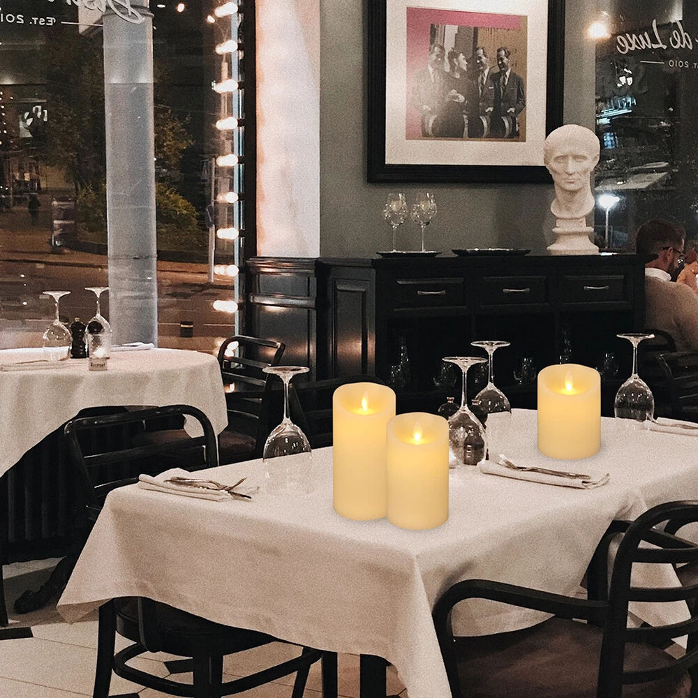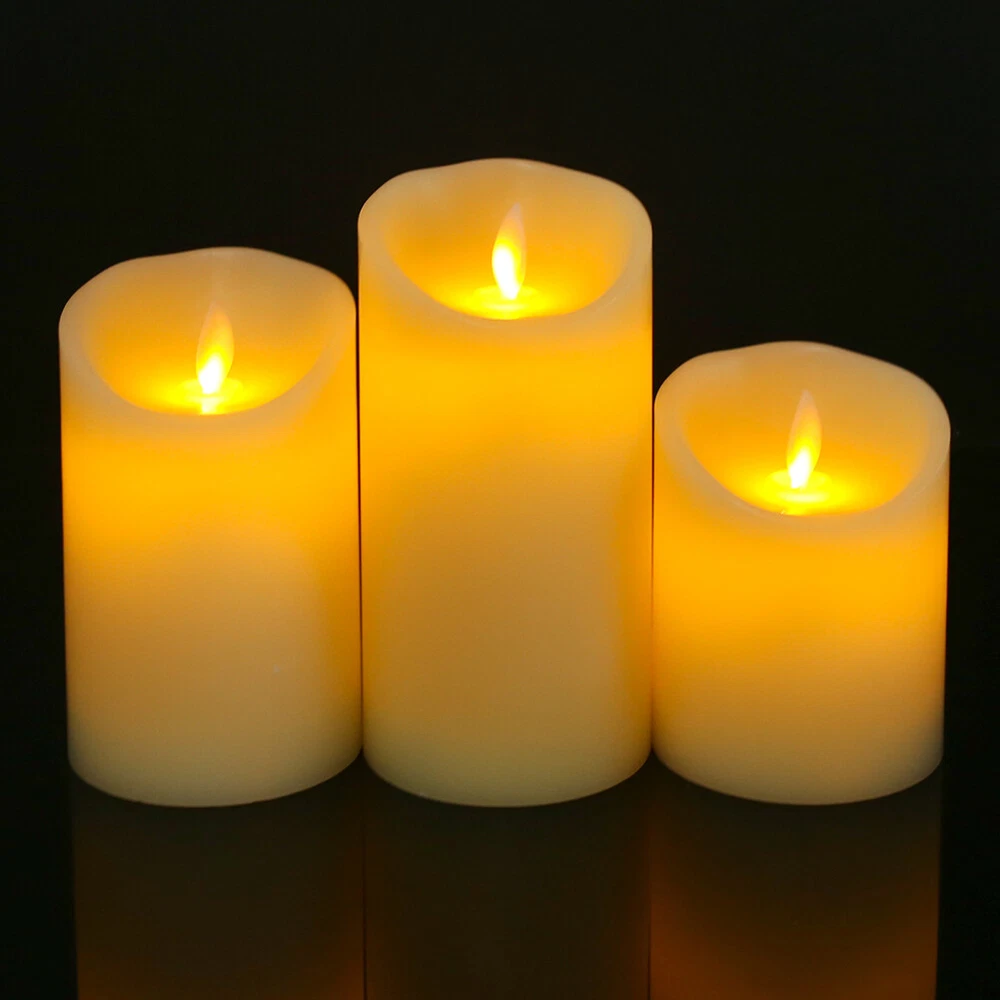Descriptive: 3 LED Flameless candle (Size: Φ 7.5cm x H 10/12.5/15cm / Φ 2.9" x H 4"/5"/6"), 1 remote control,. Batteries are NOT include This big diameter and 3 different heights flameless candles can decorate your happy time! Safe To Use Around Children and Pets:Light is created by LED, The LED flameless candles without real fire, never worry about fire-related accidents again. Each LED bulb delivers 50,000 hours of lamp life. Use of 2 high-grade AA batteries that will provide 300 hours of continuous ambience 10-KEY REMOTE CONTROL with 16.4-foot range lets you display candles in hard-to-reach places. Timer feature lets you schedule your candles in 2-, 4-, 6- and 8-hour increments, cycling every 24 hours SMOKELESS AND DRIPLESS CANDLES with smooth, classic ivory color are ideal for bookshelves, bedrooms and as safe focal points in holiday wreaths and centerpieces These decorative moving wick candles can be widely applied to birthday, Christmas, home decorations, bars, hotel, parties, holidays, wedding, or other occasions. Specification: Product: LED Candle Lamp Material: ABS Color: Ivory Size: Φ 3" x H 4"/5"/6" On-Off Button: Illuminating the Candle On=Off (Note:Before you use the Remote Control, switch the ON-OFF button to ON at the bottom of the LED candles). How to illuminating the Candle: Move the OFF-ON switch on the bottom to ON. The candle will illuminate until you manually move the switch to OFF. ON-OFF button: Illuminating the Candle On=Off (Note:Before you use the Remote Control, switch the ON-OFF button to ON at the bottom of the LED candles). TIMER: set On/Off Automatic Time feature, set to 2Hours/4Hours/6Hours/8Hours. Mode: Candle-Flickering Lights; Light-Non-Flickering Lights. Brightness Control: Left button to lower the brightness Right button to increase brightness. Package Included: - 1 x LED Candles (Size: D 2.9" x H 4") - 1 x LED Candles (Size: D 2.9 " x H 5") - 1 x LED Candles (Size: D 2.9 " x H 6") - 1 x 10 Key Remote Control More Tips: 1. This candle is made of real wax and is flammable. Do not attempt to light this candle. 2. Keep out of direct sunlight, away from heat sources and out of extreme temperatures or your candle may soften or melt. 3. Constant use of the timer however may considerably reduce battery life.