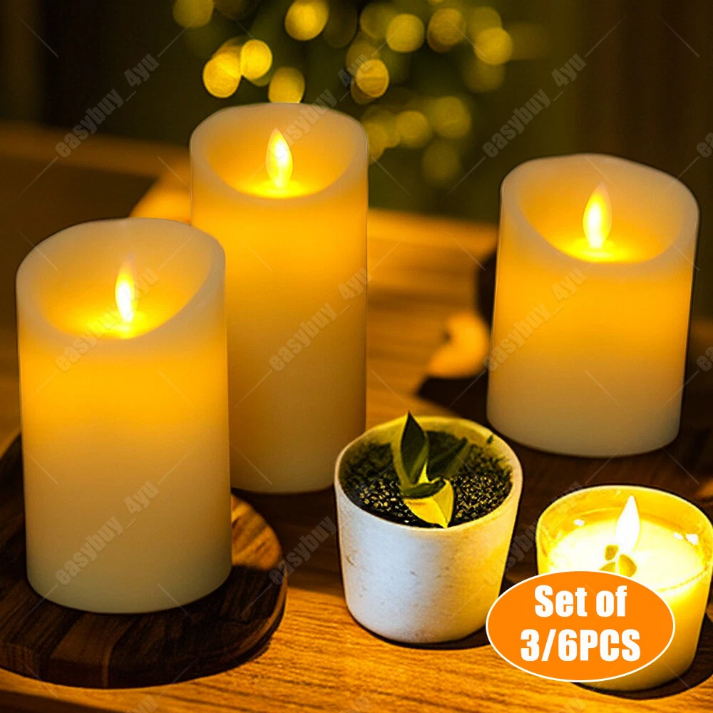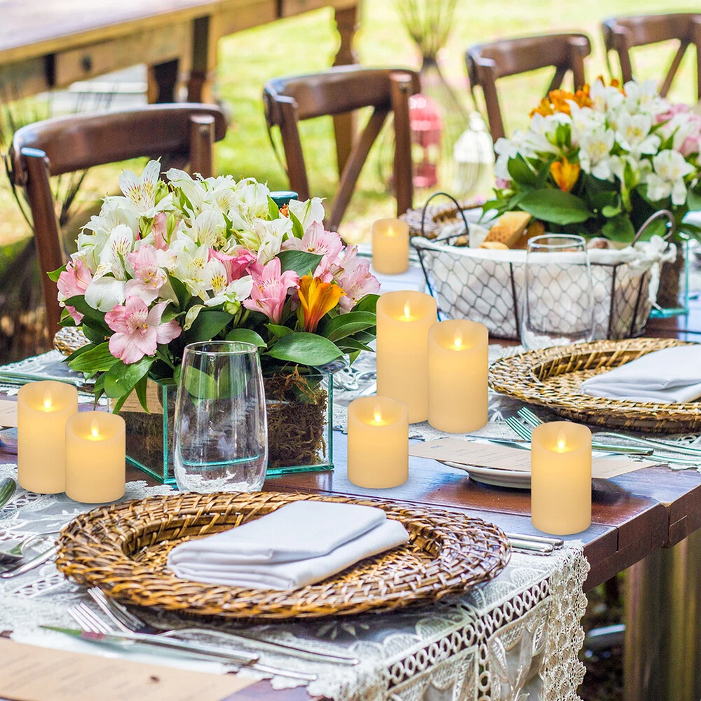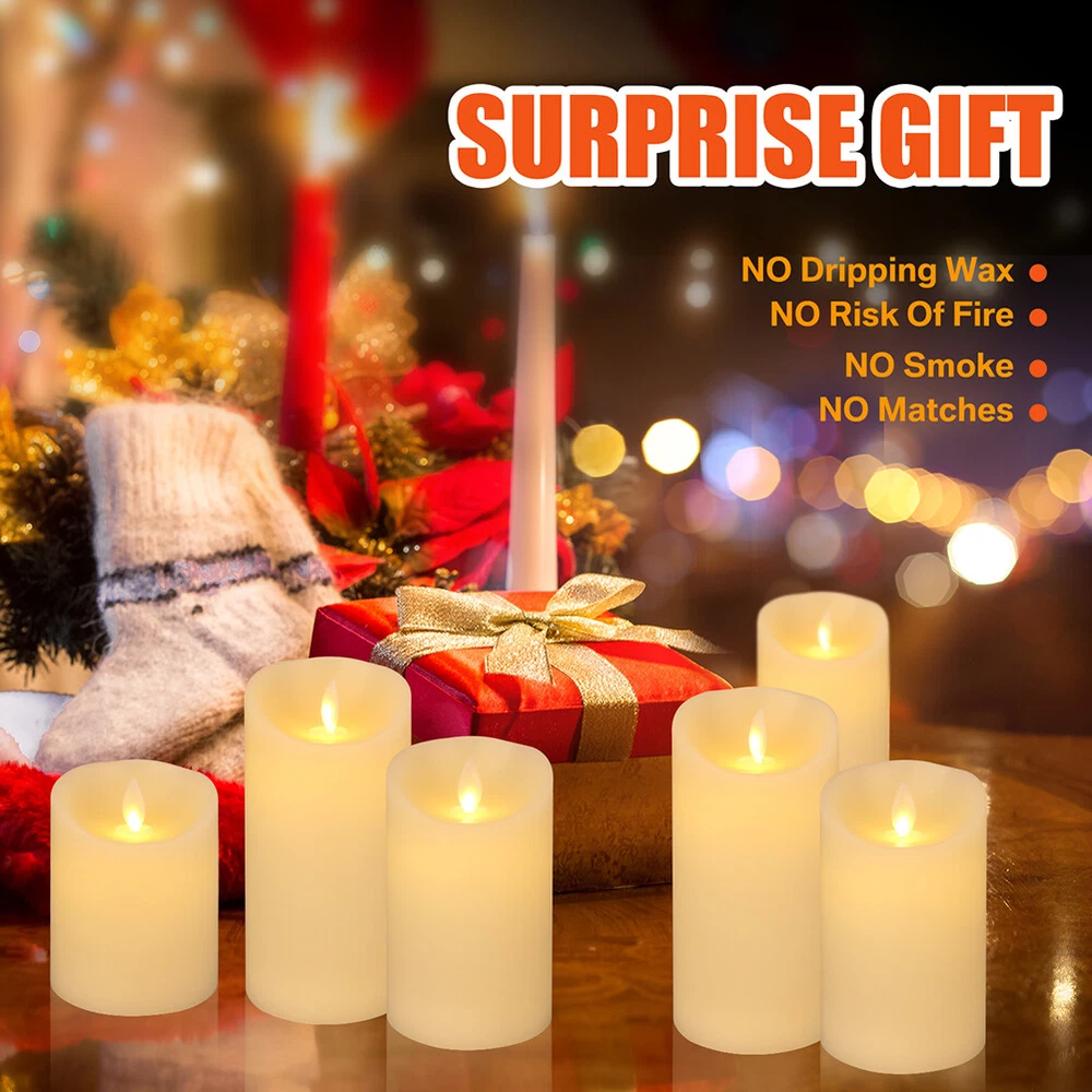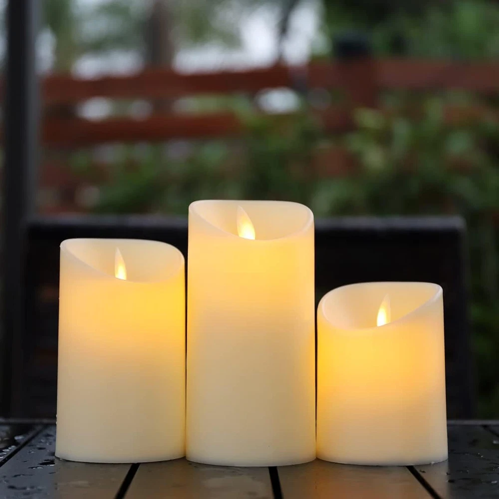 Descriptive: 3 LED Flameless candle (Size: Φ 7.5cm x H 10/12.5/15cm / Φ 2.9" x H 4"/5"/6"), 1 remote control,. Batteries are NOT include This big diameter and 3 different heights flameless candles can decorate your happy time! Safe To Use Around Children and Pets:Light is created by LED, The LED flameless candles without real fire, never worry about fire-related accidents again. Each LED bulb delivers 50,000 hours of lamp life. Use of 2 high-grade AA batteries that will provide 300 hours of continuous ambience 10-KEY REMOTE CONTROL with 16.4-foot range lets you display candles in hard-to-reach places. Timer feature lets you schedule your candles in 2-, 4-, 6- and 8-hour increments, cycling every 24 hours SMOKELESS AND DRIPLESS CANDLES with smooth, classic ivory color are ideal for bookshelves, bedrooms and as safe focal points in holiday wreaths and centerpieces These decorative moving wick candles can be widely applied to birthday, Christmas, home decorations, bars, hotel, parties, holidays, wedding, or other occasions. Specification: Product: LED Candle Lamp Material: ABS Color: Ivory Size: Φ 3" x H 4"/5"/6" On-Off Button: Illuminating the Candle On=Off (Note:Before you use the Remote Control, switch the ON-OFF button to ON at the bottom of the LED candles). How to illuminating the Candle: Move the OFF-ON switch on the bottom to ON. The candle will illuminate until you manually move the switch to OFF. ON-OFF button: Illuminating the Candle On=Off (Note:Before you use the Remote Control, switch the ON-OFF button to ON at the bottom of the LED candles). TIMER: set On/Off Automatic Time feature, set to 2Hours/4Hours/6Hours/8Hours. Mode: Candle-Flickering Lights; Light-Non-Flickering Lights. Brightness Control: Left button to lower the brightness Right button to increase brightness. Package Included: - 1 x LED Candles (Size: D 2.9" x H 4") - 1 x LED Candles (Size: D 2.9 " x H 5") - 1 x LED Candles (Size: D 2.9 " x H 6") - 1 x 10 Key Remote Control More Tips: 1. This candle is made of real wax and is flammable. Do not attempt to light this candle. 2. Keep out of direct sunlight, away from heat sources and out of extreme temperatures or your candle may soften or melt. 3. Constant use of the timer however may considerably reduce battery life.