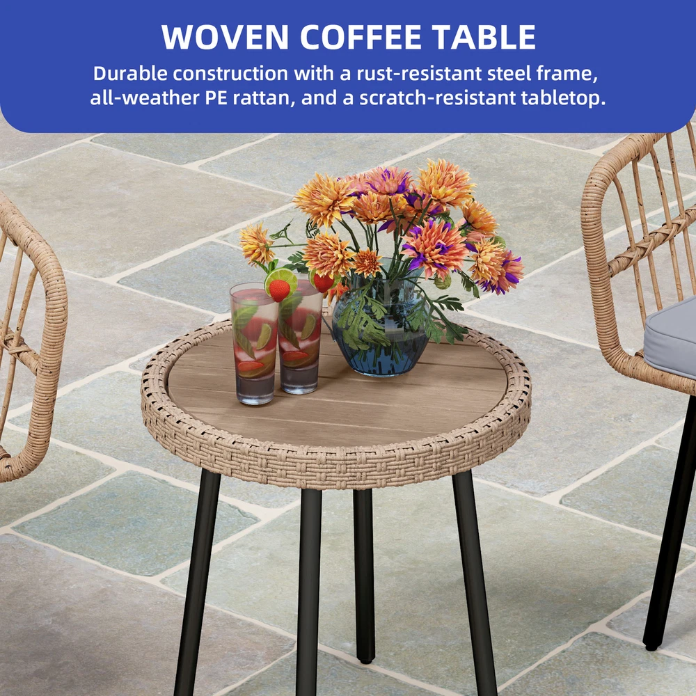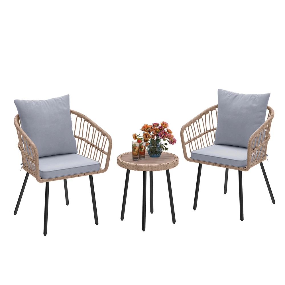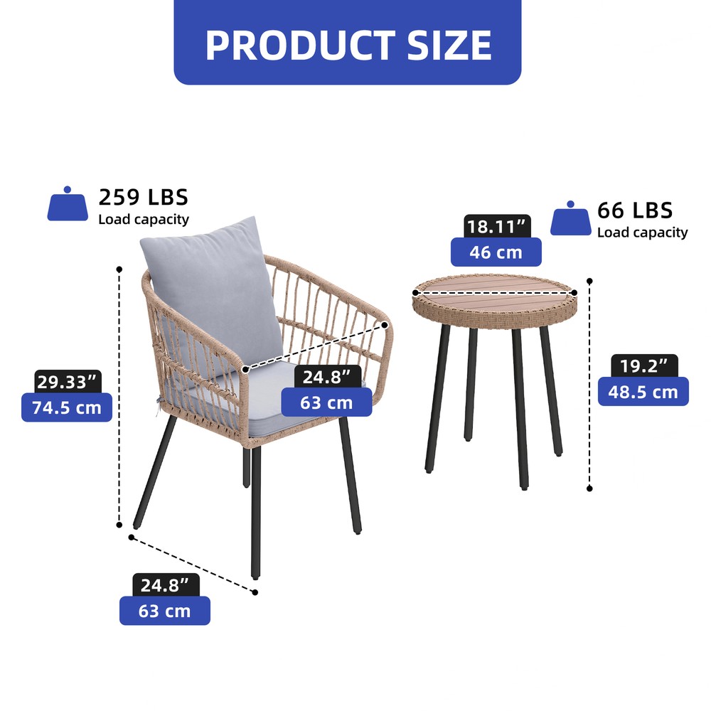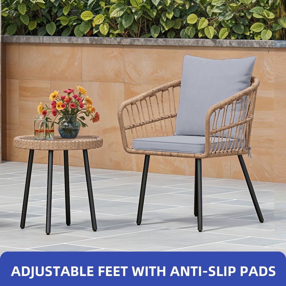 3 PCS Patio Rattan Chair & Table Wicker Bistro Set Gray Thick Foam for Outdoor Product Description NOTE: Professional Installation Would Be Highly Recommended. Description : 1. Color: Gray 2. Material: Rattan, Wicker, Steel, Polyester Fabric 3. Room Type: Living Room, Entertainment Room, Open Plan Living Area, Sunroom, Patio, Backyard, Outdoor, Courtyard, Deck, and Poolside. 4. Features: Thick Comfortable Soft Cushions, Comfortable & Breathable Fabric, Skin Friendly Fabric, Thick & Strong Wicker, Rust-Resistant Metal, Removable Cover, UV Protected, Weatherproof, Waterproof, Easy to Assemble, Easy to Clean, Protective Foot Pads. 5. Weight Capacity: Chair 259 lbs, Table 66 lbs. Features: 1. Stable Adjustable Feet: Equipped with anti-slip pads, the adjustable feet enhance stability on uneven surfaces. This feature prevents unwanted movement, ensuring secure placement. 2. Weatherproof & Soft: Made of durable PE rattan, the chair withstands various weather conditions for long-term outdoor use. The wrinkle-free cushions provide a plush and cozy seating experience. 3. Durable Woven Table: Constructed with a rust-resistant steel frame, the woven coffee table offers lasting strength. Its scratch-resistant tabletop adds both style and functionality. 4. Size & Capacity: Perfect for patios, balconies, or gardens, this set offers a cozy outdoor seating solution. The sturdy chair supports up to 259 lbs, while the durable table holds 66 lbs, ensuring reliability and practicality. Dimensions: 1. Chair Dimension: 24.8 "D x 24.8 "W x 28.74"H 2. Table Dimension: 17.71"Ø x 18.3"H Package Included: 1. 2 x Chairs 2. 1 x Table 3. 1 x Cushions Set 4. 1 x Instruction Manual Note: 1. During assembly, do not tighten screws until all holes are aligned. 2. Confirm the appropriate furniture size for your needs prior to purchase. 3. There may be a slight color discrepancy between the product as seen on your monitor versus in real life. 4. Do not expose the product to extreme sunlight. To extend product lifetime, cover sofas when not in use. 5. Contact us immediately if any components are missing or damaged upon arrival. Our customer service team will resolve your issue right away. 6. Protect cushions from rain. The inner sponge is NOT waterproof. To extend product lifetime, cover sofas when not in use. 7. T he product will be dispatched separately into 2 packages, may not arrive simultaneously. Shipping 1. Normally the item will be dispatched within 1 business day if payment is cleared before 12 pm PST. 2. Please verify the correct shipping address in your PayPal account before making the payment. We only dispatch the item to the address that is sent to us at the time of checkout. 3. We don't ship to Hawaii, Alaska, Puerto Rico, APO/FPO/PO Boxes. 4. We don't provide local pick-up service. 5. Normally we will use USPS, UPS, FedEx & LTL to dispatch items. Payment 1. We accept PayPal and credit card. 2. We will ship to the confirmed Paypal shipping address that is provided with the payment only. Return 1. 30 days Money Back Guarantee. 2. Please contact our customer service to receive a RMA form first if want to return the item. 3. All returned items MUST in new condition with the original package. Contact If has any problem, please contact us by sending an ebay message. Our customer service will resolve the problem as soon as possible. On Mar 4, 2025 at 18:26:38 PST, seller added the following information: