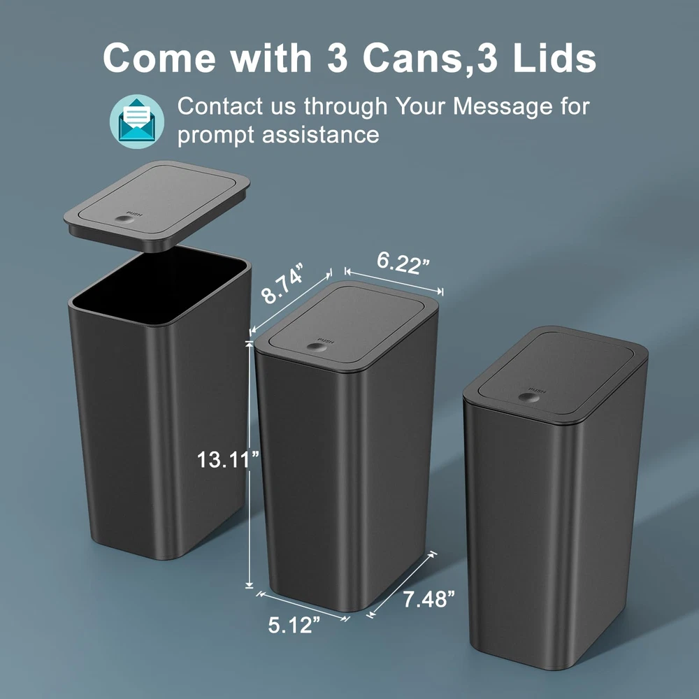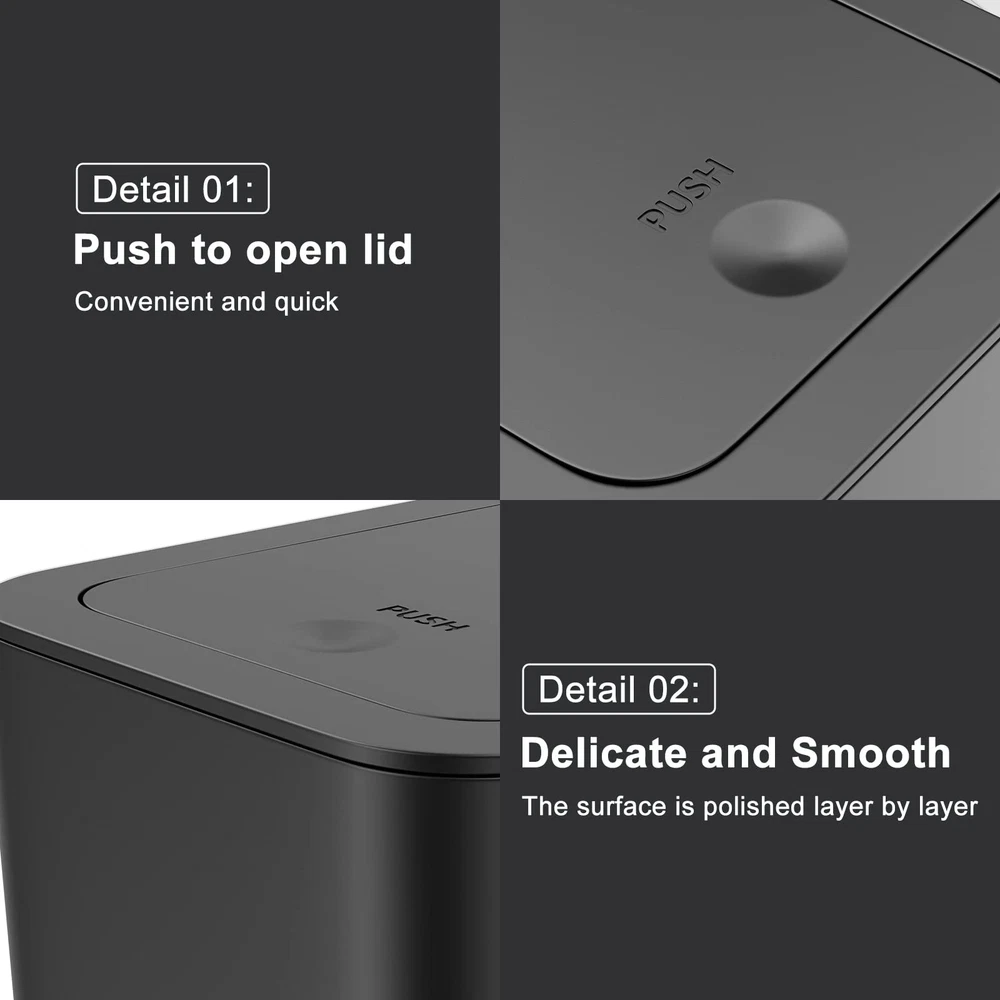 This black small trash can is the great choice for any home or office. Whether you need a small kitchen trash can, a slim bathroom trash can, or a small trash can, this small trash can kitchen is sure to meet your needs. It has a secure lid to keep odors sealed in and a sleek, modern design to add a touch of style to any room. this small trash can with lid is the great way to keep your space tidy and organized, this small kitchen trash can is crafted from high-quality PP material makes small desk trash can with lid wear-resistant. Our small trash can with lid for bathroom will not easily age or become brittle which gives you long-term usage. This small trash can is suitable for indoor and outdoor use, as well as offices and kitchens. It is lightweight and portable, making it easy to move and . The deep interior allows for plenty of storage space without taking up too much room. This small trash can is great for a bathroom, kitchen, bedroom, or office. It is large enough to hold a variety of items, yet small enough to fit in tight spaces. This small trash can with lid is great for tight spaces, and the small kitchen garbage can is great for food waste. The small trash bin is great for any room, and the office trash can is great for keeping your desk neat. The small bedroom trash can is great for keeping your space clean and organized. This small waste basket is easy to clean and maintain. It is great for a small kitchen garbage can, a small bathroom trash can with lid, or a small trash can with lid. This small trash can can also be used as a trash bin or waste basket, making it a versatile item for any home or office. Great Size for Tight Spaces: The compact and sleek design of this small kitchen trash can makes it great for tight spaces such as bathrooms, bedrooms, or small kitchens. Slim profile of mini trash can allows small bedroom trash can to fit in narrow areas, while contemporary design of compost bin adds a touch of style to any room Secure Lid to Keep Pets Out of Trash: This small trash can with lid works great, providing a secure barrier to keep pets out of the trash. This feature of slim bathroom garbage can is especially helpful for households with curious pets that tend to knock over or rummage through dog proof trash can Traps Smells Inside: This small black bathroom trash can is neat and tidy. Clean lines and smooth surfaces of diaper trash can make it easy to keep clean and maintain. Under sink trash can traps garbage smells inside, so your space smells fresh and clean all the time. With this pop up trash can with lid, you can say goodbye to unsightly messes and unpleasant odors Versatile and Practical: This small kitchen garbage can is versatile and practical, making small trash can kitchen an great choice for a range of situations. Whether you need a small bin for your bathroom or bedroom, or you want to keep your kitchen and living room tidy, this office trash can is a great option. Room trash can is also lightweight and easy to move around, so you can use it wherever you need it Efficient and Sturdy: Crafted from premium-grade ABS material, this small trash can with lid boasts high durability and resistance to wear and tear. With a compact 2.6-gallon capacity wastebasket, it's great for use in your bathroom, bedroom, or office. Its lightweight design allows for effortless transportation, making it a flexible solution for your disposal needs. Additionally, our slim garbage bin is simple to clean and maintain, ensuring it remains a practical addition to your space
