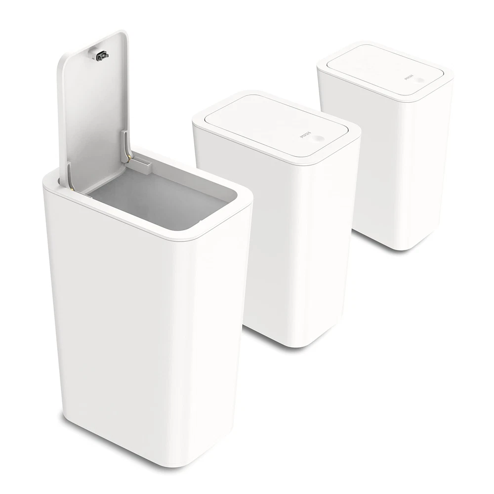 This off white small trash can is the great choice for any home or office. Whether you need a small kitchen trash can, a slim bathroom trash can, or a small trash can, this small trash can kitchen is sure to meet your needs. It has a secure lid to keep odors sealed in and a sleek, modern design to add a touch of style to any room. this small trash can with lid is the great way to keep your space tidy and organized, this small kitchen trash can is crafted from high-quality PP material makes small desk trash can with lid wear-resistant. Our small trash can with lid for bathroom will not easily age or become brittle which gives you long-term usage. This small trash can is suitable for indoor and outdoor use, as well as offices and kitchens. It is lightweight and portable, making it easy to move and . The deep interior allows for plenty of storage space without taking up too much room. This small trash can is great for a bathroom, kitchen, bedroom, or office. It is large enough to hold a variety of items, yet small enough to fit in tight spaces. This small trash can with lid is great for tight spaces, and the small kitchen garbage can is great for food waste. The small trash bin is great for any room, and the office trash can is great for keeping your desk neat. The small bedroom trash can is great for keeping your space clean and organized. This small waste basket is easy to clean and maintain. It is great for a small kitchen garbage can, a small bathroom trash can with lid, or a small trash can with lid. This small trash can can also be used as a trash bin or waste basket, making it a versatile item for any home or office. Fits Almost Everywhere: A stylish small trash can with a modern slim design that looks great and easily fits into narrow openings and small spaces. Fits well in small kitchens, bathrooms, offices or wherever space is limited Compact Design: This rectangular slim Garbage can is the great size for storing inside cabinets, underneath counters, under sinks and other small nooks and spaces in your bathroom; The small bathroom trash cans with lids tuck conveniently next to the toilet or beside a shower or bathtub and keep garbage, recycling, and other small items out of sight Pop-up Design Lid: The small trash can is design with a pop-up design lid, just need simply tap the button to open or closed the lid. The press top lid can allows you to it in plain sight; The trash is contained out of view.The plastic ring can fix the garbage bag and prevent the garbage bag from slipping away Efficient and Sturdy: Crafted from premium-ABS material, this small trash can with lid boasts high durability and resistance to wear and tear. With a compact 2.6-gallon capacity tiny wastebasket, it's great for use in your bathroom, bedroom, or office. Its lightweight design allows for effortless transportation, making it a flexible solution for your disposal needs Chic & Versatile Trash Can Set: Our collection of three trash cans showcases a modern design that enhances the beauty of any room. Each slim garbage bin is easy to clean and maintain, making it a practical choice for your home or office