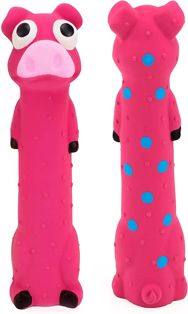 Made with Non-Toxic Latex Rubber, Criterion of Detection US FDA CFR 21 (Rubber Articles) / EU CE EN71 ( Toys ) Soft, Squeeze Squeak, No Stuffing Dogs Interactive Chew Sound and Outdoor Indoor Fetch Play 3 Pack - Funny Long Body Pig Chicken Frog Suitable for Small and Medium Dogs - 4~30kg(8.8~ 66lb) If you have any questions about this product, please feel free to us. Product Description Product Features Soft Chew Squeaky Sound No Stuffing Stick Easy to Wipe Clean 9 Inch Latex Rubber Dog Toy Animal Standing Stick Interactive and Fetch Play for Small Medium Dogs Chiwava toys are made from Latex,NON-TOXIC. Toys coating is pleasant to the touch and soft, easy to clean. Toys come in set of 3 bright colors (rose red, orange and green) with funny cute animal faces (piggy, chicken and frog). toys have long-body shape and because of rubber, can stretch and tug without breaking it, have small squeaker which makes high sound when you squeeze it. Dogs Should be Supervised While Playing with Toys Damaged Toys Should be Taken Away Strong Chewing Dogs Should be Teach Care Toys