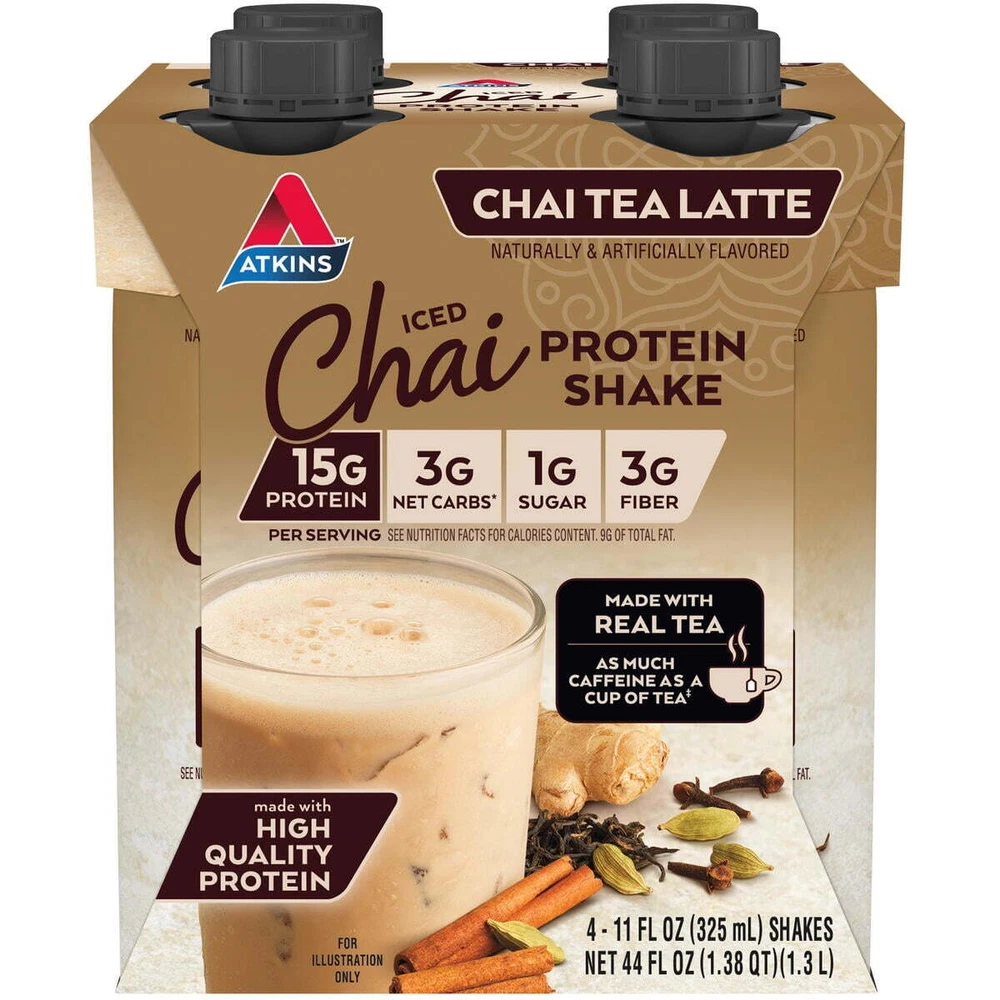 Product details Atkins™ Chai Tea Latte flavored Protein Shakes are low sugar*, low carb* and bring together the invigorating taste of chai tea flavor and the enlivening kick of a cup of tea in a delicious protein shake. There’s nothing quite like a gluten free, low glycemic protein shake with the great taste of chai tea and the caffeine* of a cup of tea to get you going, with 15g of protein, 3g of net carbs, and 1g of sugar per serving*. They’re also keto friendly*, a good source of fiber* and contain no artificial growth hormones. AT HOME OR ON-THE-GO. Atkins Chai Tea Latte Protein Shakes. Enjoy delicious shakes that fit right into your busy schedule, with 15g of protein, 3g of net carbs, and 1g of sugar per serving*. This is Today’s Atkins™. YOUR APPROACH. Help give your body the nutrients it needs without sacrificing your favorite flavors. AMAZING RECIPES. Delight in the nutrients and satisfying flavors of great foods made with quality ingredients. Offered in 4ct cartons containing individually bottled 11 fl oz shakes. TASTE WHAT’S GOOD. Stay true to your low carb lifestyle with these delicious protein shakes. *See Nutrition Facts for Calories and Saturated Fat Contents. Fiber: 9g Total Fat per serving. Low Sugar: 1g Total Sugar per serving. Not a low calorie food. Low Carb: 6g Total Carbs, 3g Net Carbs per serving. Caffeine content per shake as compared to a standard 8 fl oz cup of brewed coffee.