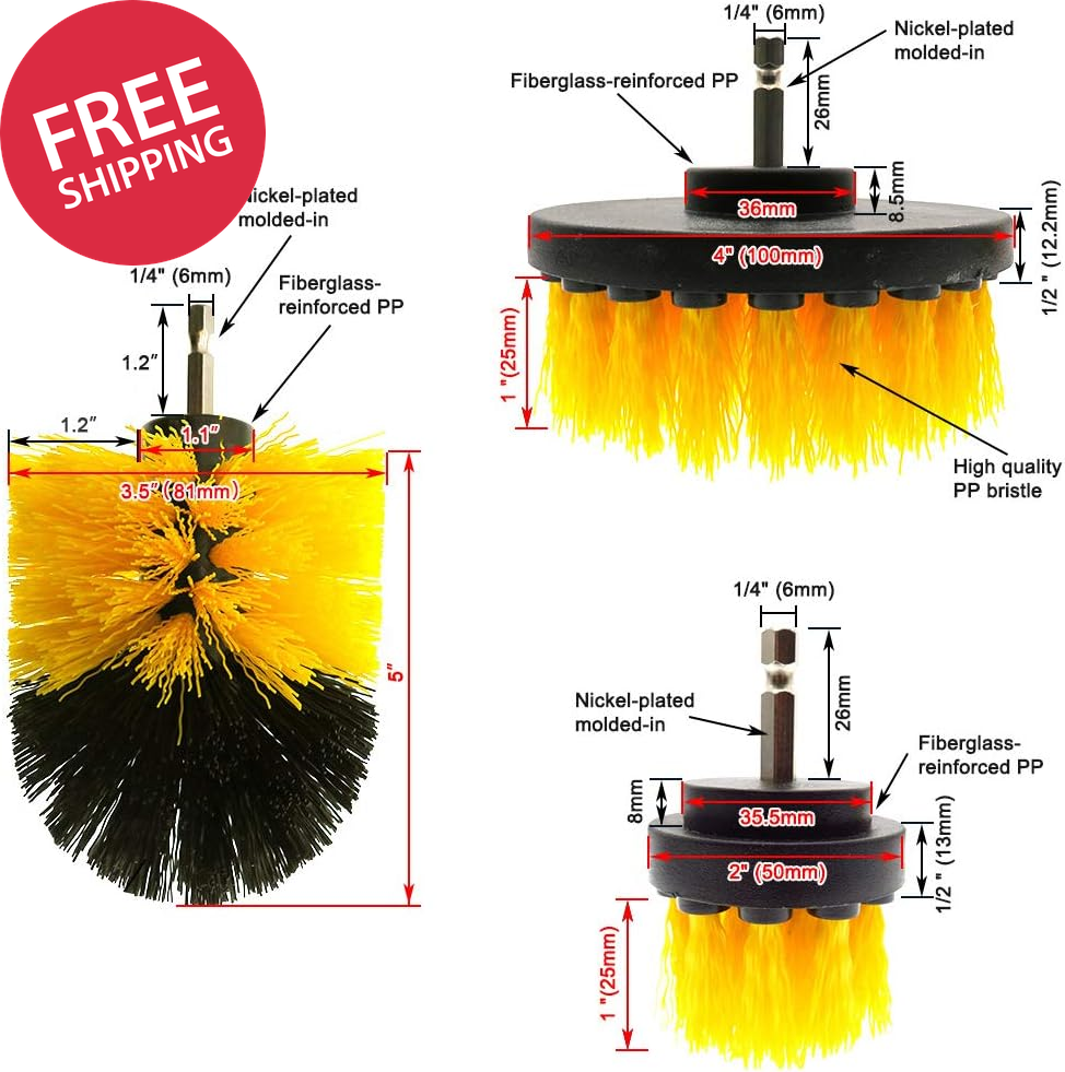 [3 Pack] Auto Detailing Drill Brush Set, Wheel Cleaner Brush, Car Cleaner Wash Brush Supplies Kit Fit Tire, Car Mats, Floor Mat, Bathroom and Auto Power Scrubber Brush Cleaning Sets ✅【What You Receive】 1 x 4 inch Drill Brush , 1 x 3.5 inch Wheel Brush , 1 x 2.5 inch Detailing Brush . If these Detailing Brush Set don't live up to your expectations, please let us know. We will send you a replacement or refund. You take NO RISK when you purchase with us. But we're betting you'll fall in love with these Detailing Brush Sets / Kits. ✅【High-Quality Detailing Brush】 Detailing Brush features premium plastic molded construction and dense polypropylene bristles that perfect for Car Wash Detailing Brush Supplies Set. Nylon bristles will not scratch surfaces of them. ✅【Broad Range of Applications】3 shapes of drill brush power scrubber can be used to clean your floor mats, wheel, car carpet, bathtub, grout, bathroom surface, tile, and shower, etc. The 1/4 inch connectors of these brushes can be used on hand-held tool for rapid changing of components. ✅【360 Degree Drilling Brush】 The car wheel cleaner brush kit is a premium multi-functional cleaning tool, easy 360 degree cleaning angle. Product description Deigned and Made for World Class Drill Brush We’ve manufactured our powerful drill brush set for more than 10 years, sold around the world by efficient cleaning. The all-purpose heavy-duty kit contains high-quality stiffness nylon power brushes that will firmly attach to your favorite cordless drill. Do not worry about falling off. Nylon bristles will make every corners and gaps very clean. The cleanup effect will be beyond your imagination. 3 essential power scrubber attachments (1) 4in brush is built for hub-tire and flat surface (2) 3.5in bullet-shaped brush for tight corners (3) small 2 in car detailing brush for lug nuts and tight gap spaces Apply to: Car Wheel Truck tires Toilet Carpet Leather cleaning Kitchen Bathroom Heavy duty cleaning helper The brushes with extended reach attachment become a powerful cleaning tool that can help you clean up any area you can’t easily reach. 360 degree rotation drill brush The high speed rotation of the drill combined with high quality premium medium duty bristle brush lifts and easily extracts spots from leather and fabric upholstery or carpet. Sturdy 1/4in stainless connector Simply install and fit any cordless drill or impact driver tightly. Unit Count 3.0 Count Number of Items 3 Color Yellow Material Nylon, Polypropylene Manufacturer Part Number BrushY Item Firmness Description Medium Item Weight 1 pounds Handle Material Plastic Specific Uses For Product Carpet,Floor,Shower,Bathtub,Drill,Tile Surface Recommendation Multiple Surfaces Special Features Durable Included Components Attachment Special Feature Durable Package Dimensions 5.12 x 4.29 x 4.21 inches Shipping Fast shipping is very important for us. Our standard US shipping service is FREE. Your order will be shipped within 2-3 business days upon full payment received. Your order will be delivered within 2-3 business days after the handling time. We only ship to the confirmed PayPal address. We reserve the right to cancel any order for any reason at any time. We are not responsible for undeliverable addresses. Returns and payment We offer a 30 days return policy from checkout winning date. We allow only PayPal as payment method FeedBack Your feedback very important to us, after you get your package and you are satisfied with our service please leave us positive feedback If you have any problem with your order / any questions please before leave any type of feedback For any questions, using eBay contact system Please visit our eBay store to check out other items for sale! Thank you for shopping at our store.