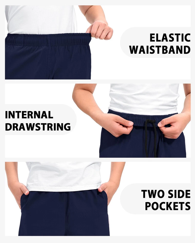 Boys Athletic Shorts Quick Dry Basketball Soccer Running Sports Gym Active Performance Shorts with Pockets Quick Dry Fabric: These boys athletic shorts are made of 88% nylon 12% spandex. The fabric is lightweight, breathable and quick-drying, the pants can keep boys cool even in the hot summer. Elastic Waistband: Our boys sports shorts come with a high elastic waistband that easily adapts to boys' waistline, preventing the pants from falling down and wrapping around the waist for better support. Internal Drawstring: Our boys basketball shorts feature an internal drawstring and elastic waistband to keep comfy and from falling off while running and training. 2 Side Pockets: With 2 side pockets on both sides of boys soccer shorts to a cell , wallets, or other things. Your boys will be able to enjoy on basketball, soccer, running, exercising without worrying about things getting left behind. A Variety of Colors and Sizes: The short pants for teen boys come in a variety of colors and sizes for your children to choose. These boys shorts can easily be paired with a variety of tops, perfect for basketball, soccer, running, sports or everyday wearing!