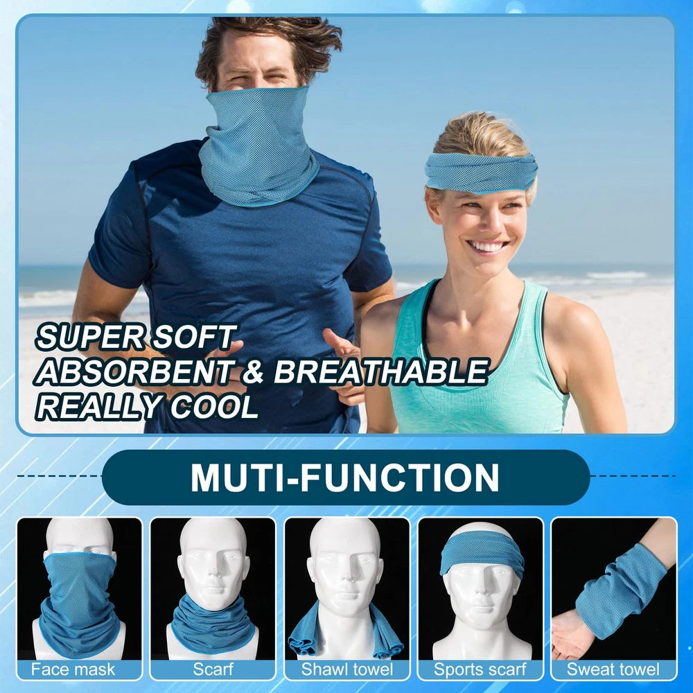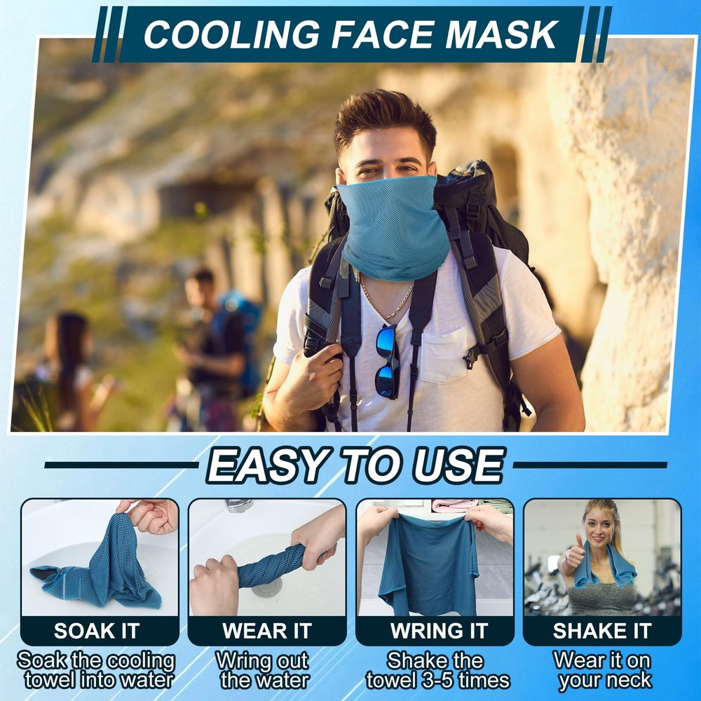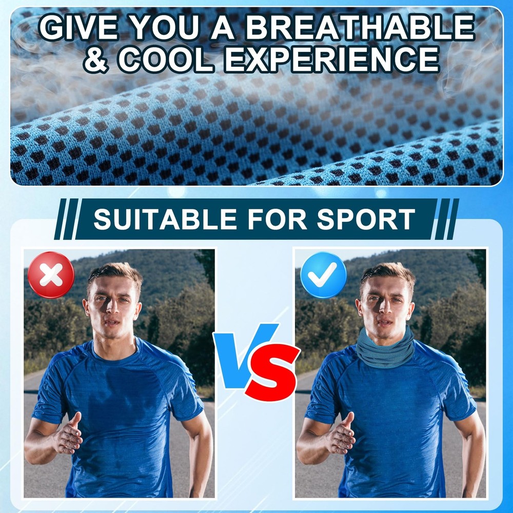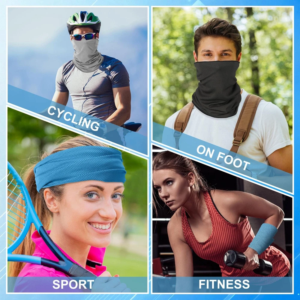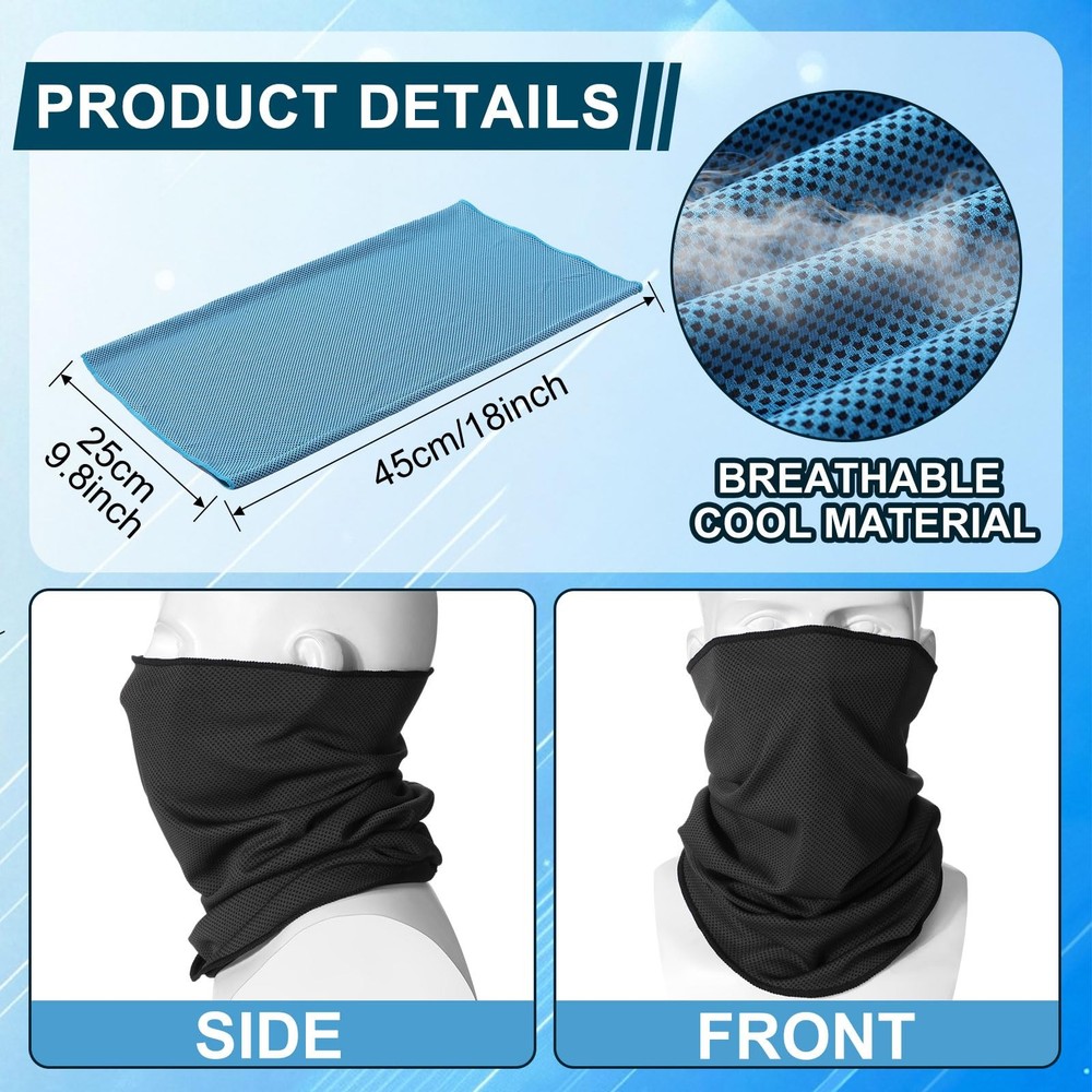 Features: The cold sports face mask can be worn on your head, neck, wrist or ankle for a quick cooling effect, keeping your skin from the direct sun, dust or more. You can send the cool neck rag to those people who need to go out in hot weather, including your parents, children, brother, husband, classmates. This can improve your relationship. Specifications: Material: poliester Color: black, sky blue, grey Size: Height: approx. 40 cm/ 15.7 inches Width: approx. 25 cm/ 9.8 inches Package includes: 3 x Cooling neck gaiter face mask Notes: Manual measurement, please allow slight errors on size. The color may exist slight difference due to different screen displays. Enough to Use: you will receive 3 pieces of cooling neck gaiter face mask for athletes in different colors, abundant in quantity and rich in color, enough for you to choose according to your mood; And the breathable balaclava bandana can be washed by washing machine Upgraded Cooling Fabric: Our neck gaiter is made of cooling technology polyester fabric, which is strong and reliable, good water absorption, soft and comfortable. When the cooling sweat breathable face bandanas is wet, it will quickly cool down and continue to feel cool. Just wet it and wring it dry. It can stay cool for up to 3 hours, allowing you to exercise comfortably even in hot weather. Multiple Functions: the workout neck cover can be worn in a variety of ways, can be applied as a neck gaiter, head wrap, face scarf, balaclava, headband, towels,scarf, bandana, beanie cap, hood and wristband.This neck gaiters for women and men is also a great gift for you and friends and a good choice for walking, yoga, fishing, hunting, sports, riding a bike or music festival. Wind And Dust Proof: When going out for motorcycling, running, cycling, skiing or snowboarding, wearing it as a face mask gaiter, headband, face scarf, bandanna mask gaiter, or ski neck gaiter can protect your face, neck and avoid your nose and mouth clean from breathing dust. What’s more, it has performance of windproof. Suitable for Many Occasions: the cool gym face mask are suitable for athletes, runners, gardeners doing yard work, workers working in hot weather, which can also be applied for running, hiking, fishing, hiking, concerts, festivals, barbecues, mountain climbing, vacations, beaches and more.It's an essential item for anyone who enjoys outdoor activities, sports