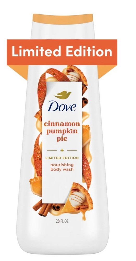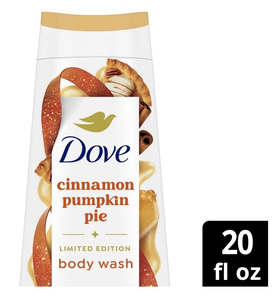 Dove Limited Edition Holiday Treats Cinnamon Pumpkin Pie Body Wash, 20oz. Pumpkin patch pics, Pumpkin Spice Lattes and Pumpkin Pie. If your Fall season is pumpkin filled, our Cinnamon Pumpkin Pie Body Wash, a Limited-Edition Holiday Treat, is made for you. Indulgent and sweet as pie with a delicious, dessert-like scent and rich, creamy lather to nourish your skin. A mix of mouth-watering aromas and skin-quenching ingredients like 24hr renewing MicroMoisture and plant-based moisturizers make this one delicious recipe for glowing, soft skin. This slice of home baked goodness is perfect for satisfying your cravings and your senses, minus the kitchen mess. It may smell good enough to eat but remember – this treat is made for the shower, so please don’t devour. • DELICIOUS NOURISHMENT: Unwrap the gift of deliciously nourished skin with this spiced treat – adding a touch of softness with microbiome-gentle cleansing, savor the scent of the sweet creaminess, while revealing that holiday glow you deserve • IRRESISTIBLE FESTIVE SCENTS: Fall into the warm embrace of sweet cinnamon spice, mixed with buttery pumpkin notes; Savor the delightful scent of sweet creaminess as you lather up, pampering your skin with a slice of home-baked goodness • TREATS FOR THE SHOWER: Gently cleans and nourishes your skin while wrapped in the warm aroma of festive home baked goods; This slice of home baked goodness is perfect for satisfying your cravings, minus the kitchen mess • THOUGHTFULLY MADE: Made with plant-based moisturizers, this bodywash is deeply nourishing, providing a luxurious shower experience that restores your skin's natural radiance • 100% RECYCLED BOTTLE: Great for the planet • LIMITED EDITION HOLIDAY TREATS: Deck the shower with Dove Cinnamon Pumpkin Pie Body Wash, a delightful Limited-Edition Holiday Treat that indulges your every sense with a harmonious blend of delicious nourishment and irresistibly festive scents