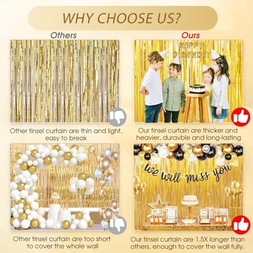 These gold foil fringe curtains are absolutely stunning! They instantly elevate any party backdrop with their shiny, luxurious look. Super easy to hang and the perfect length—transform any space into a festive photo booth or celebration area in seconds. The 3-pack is a great value, and they arrived quickly in perfect condition. Highly recommend for birthdays, weddings, or any special event!