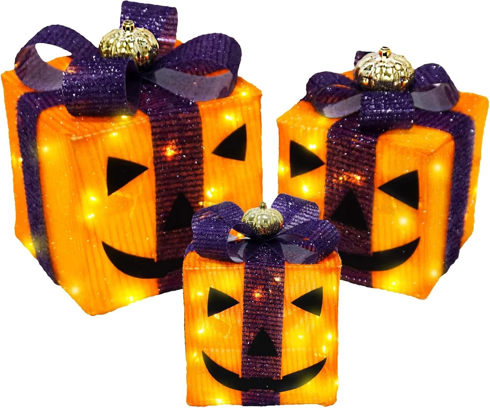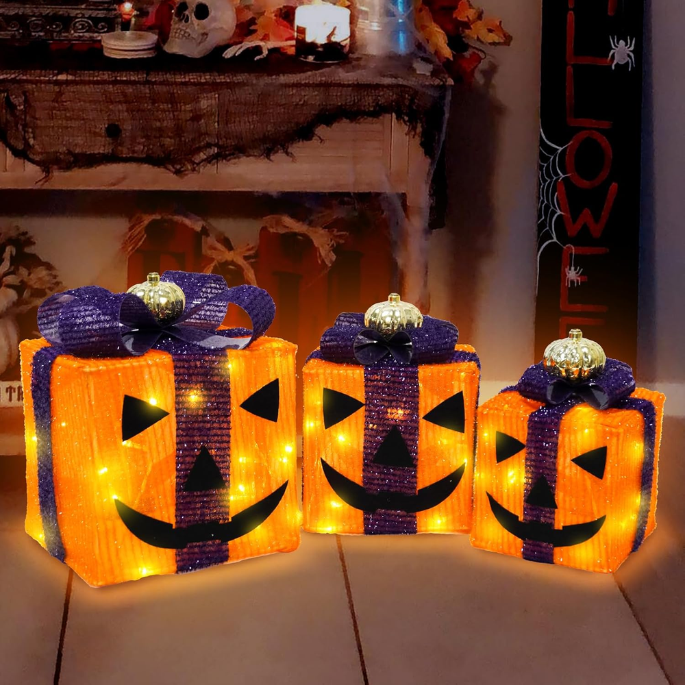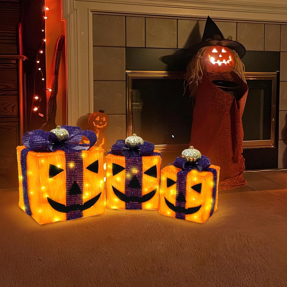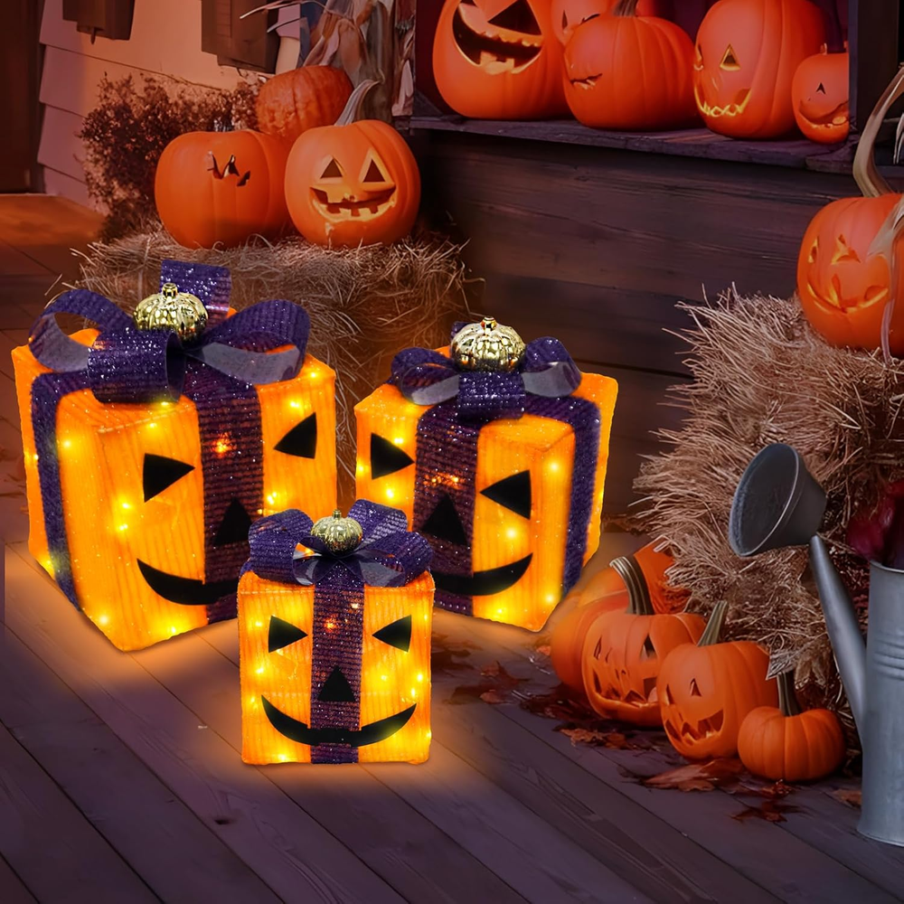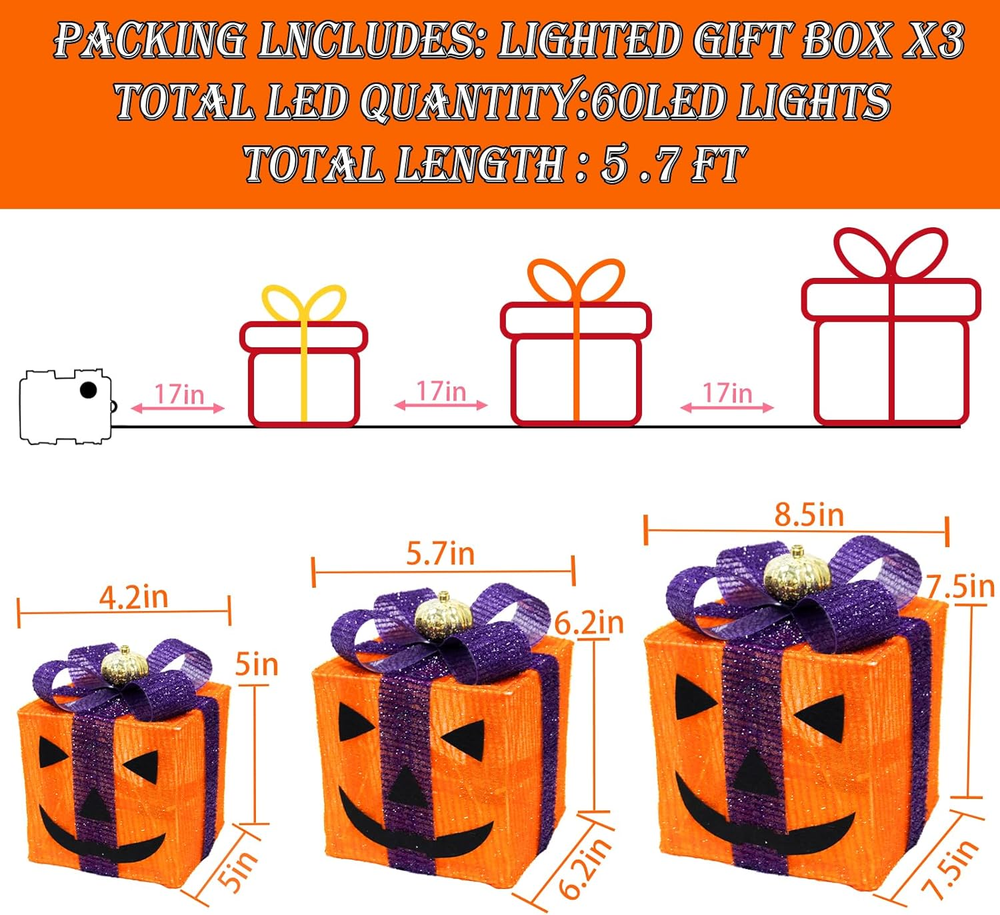 Store New Arrivals Add to Favorite View Feedback Contact Fast deliveries to the customer's home Quality customer service John Make the customers happy! 3 Pack Lighted Gift Boxes - Outdoor Halloween Orange and Purple Gift Boxes with Lights - Pumpkin Battery Operated Light up Decor for outside Porch Yard Table Party Description 3 Pack Halloween-Themed Lighted Gift Boxes: Includes 3 pcs in various sizes, Our black Halloween decor features orange and black mixed fabric with a cute pumpkin on top. Each box is equipped with built-in LED lights 2 in1 Light Up Halloween Decoration : The black lights decor features a bottom cutout design in the upright position, you can use them separately for desired display or just stack them together at your wish Lighted Halloween Table Decor: Our light-up outdoor Halloween decor are connected by non-detachable wires and powered by a shared battery box, making them versatile for use in any of your Halloween home decorations 8 Lighting Modes & Timer :This lighted gift boxes powered by 3 AA batteries(Not Included) . It is equipped with a timer that allows Halloween present boxes to light up for 6 hours and automatically turn off for 18 hours Halloween Party Decorations : Ideal for creating a lively and culturally rich atmosphere in your table centerpieces, mantel, window, party or any indoor celebration Product Description Item model number Halloween Lighted Gift Boxes Item dimensions L x W x H 1 x 1 x 1 inches Number of Light Sources 3 Number of Items 3 Color orange Light Color Multicolor Material Purple Black Country of Origin China Style orange Item Weight 1.5 pounds Product Dimensions 1 x 1 x 1 inches Theme Halloween Frame Material Plastic Voltage 4.5 Volts Recommended Uses For Product Indoor Home Decor, Outdoor Lighting Decor ABOUT US We offer the best prices around on high quality products. Our E-store includes media such as books, movies, music and games while offering electronics, toys, sporting apparel, clothing, tools, general home, garden items and more. SHIPPING We are always working hard to ensure your package arrives as soon as possible. Please understand that some factors like weather, high postal traffic, and the performance of shipping companies are outside of our control. We offer free shipping to the lower 48 states and ship within 2 business days of payment, usually sooner. We do not accept P.O. Boxes. Please provide a physical address. For shipping outside of the continental USA, we only use eBay's Global Shipping Program. The item is shipped to KY and then sent to the rest of the world. International customers are responsible for all duties and taxes. Continue to 'check out' to calculate costs for shipping the item to your country. Messages regarding eBay's Global Shipping Program MUST be directed at eBay EXCLUSIVELY. RETURNS We offer a 30-Day Return Policy on items in which you are not completely satisfied with. You have the option of a full-refund or an exchange of the item. No returns are available on items shipped outside of the USA PAYMENT We accept PayPal. CONTACT US This page content is yet to come Please ad us to your favorite seller and visit again later Thank You CUSTOMER SATISFACTION We try our very best to make sure every customer is completely satisfied. If there's a problem, message us! We're happy to help. WE ACCEPT