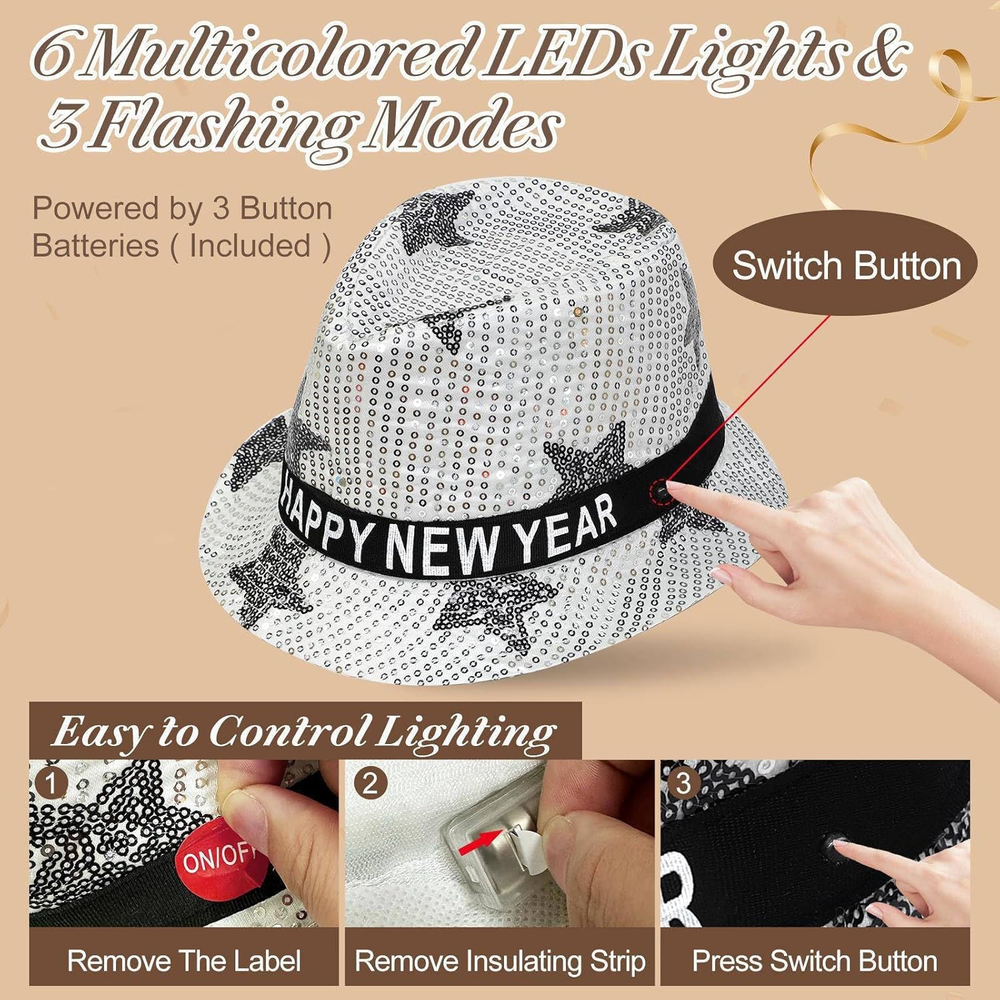 3 Pack Happy New Year Hats: Our New Year's parties hats set includes gold, silver and black 3 hats; The brightly colored hats are pre-installed with LEDs, allowing you to easily attract attention at the New Year's parties LEDs Photo Props: Each Happy New Year hat pre-installed with 6 LEDs, emitting red, green, and blue lights with 3 lightmodes: fast flash, flash, and combination, use 3 button batteries (included); Lighted hat can be selfie props to add charm to your photos Durability Materials and Sequins Design: New Year's parties hats are made of durable polyester fiber, comfortable to wear; The hat surface is filled with sequins, decorated with "Happy New Year" and cute stars, wearing it will make you the focus of parties Suitable Size for Most: The top circumference of jazz hat is about 19 inch/48 cm, one size fits most men, women, and kids, providing a comfortable and stylish fit for people of all ages and head shapes, allowing your guests to enjoy the parties at night Light Up Your NYE Parties: Wearing glowing hats will make you stand out from the crowd, suitable for New Year's parties, costume parties, Christmas, camping, carnivals, music festivals, nightclubs; they can also be given as a surprise to family and friends 【Product Specification】 Quantity: 3 Colors: Gold, Silver, Black Materials: Polyester Dimensions: With Brim: 10.5 inch * 8.5 inch (L*W) Without Brim: 8 inch * 6.5 inch (L*W) Outer Height: 4.5 inch Inner Height: 3.8 inch Brim Width: 1.8 inch Inner Top Circumference: 19 inch Lights Quantity: 6 Light Colors: Red, Blue, Green Light Modes: 3 Modes: Fast Flash, Flash, Combination (Slow Flash & Flash & Fast Flash) Power Supply: 3 Button Batteries (Included) Applicable Occasions: New Year's Eve, New Year's Parties, Masquerade Balls, Birthday Parties, Christmas Celebrations, Camping, Carnivals, Concerts, Outdoor Music Festivals, Bars, Nightclubs, Cosplay, Retro Jazz Parties, Vacations, Stage Performances, Themed Costumes, Themed Parties, Western Theme Parties. 【Package Includes】 Gold hat *1 Silver hat *1 Black hat *1