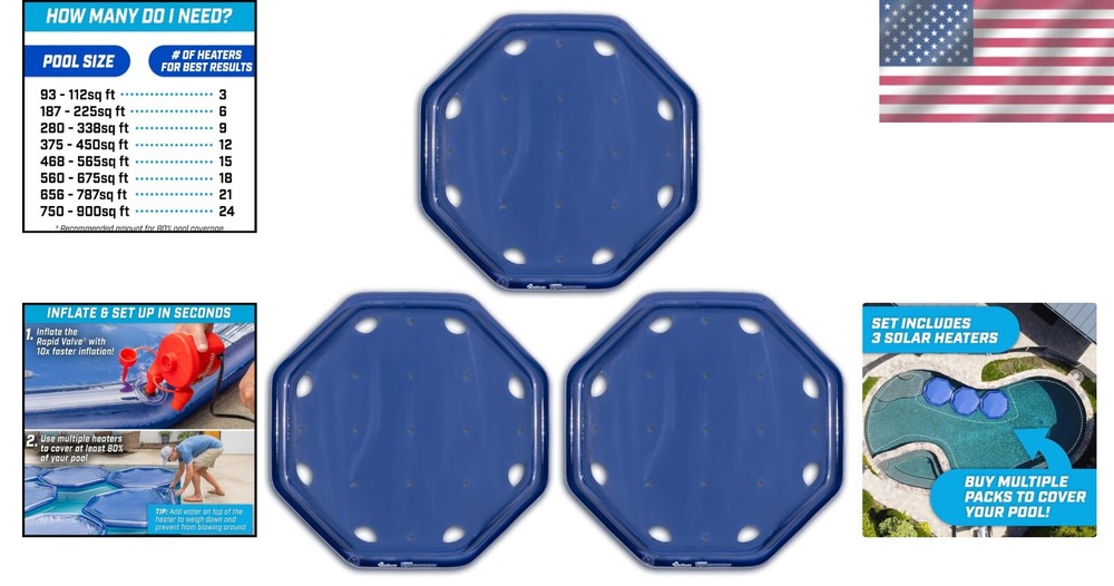 Inflatable Solar Pool Heaters 3 Pack Polyethylene Modern Flat Pool Heating ‹ › ‹ › ‹ › ‹ › ‹ › ‹ › ‹ › ‹ › Inflatable Solar Pool Heaters 3 Pack Polyethylene Modern Flat Pool Heating NEW UPGRADED DESIGN: Rings inflate faster & lay perfectly flat every time. Heaters trap the sun's energy to heat your pool during the day and keep it insulated at night. Use multiple heaters to cover at least 80% of your pool's surface for best results. SAVE ON HEATING: Includes 3 inflatable heaters that complement existing gas and electric heaters. Experience faster heating, saving you time and energy costs. MINIMALISTIC DESIGN: Each heater lies completely flat with a solid blue color. Provides a clean, modern look to enhance any backyard pool setting. RECOMMENDED AMOUNT: Each heater measures 5 ft x 5 ft, covering 25 square feet of your pool surface. For optimal coverage, take your pool's square footage and divide by 30 to calculate the required number of rings. GREATER COVERAGE: Thick outer perimeter minimizes potential overlapping. Increases pool surface coverage for maximum efficiency. Why Choose Our Inflatable Solar Pool Heaters? Transform your swimming experience while being eco-friendly with our inflatable solar pool heaters. These modern, stylish heaters absorb and disperse the sun's natural energy, effectively heating your pool water during the day while maintaining warmth at night. The design is not just aesthetically pleasing but functionally superior, making it easy to set up and remove whenever you desire a dip. Extend your pool season comfortably and effortlessly, using these heaters during the shoulder seasons to bring a warm touch to cool evenings. Save on heating costs and help preserve the environment with our innovative technology as you create a cozy swimming retreat all round. Elevate your pool experience—order your 3-pack Inflatable Solar Pool Heaters today! Shipping Free & Fast Shipping - We offer free shipping to most of the USA with a normal delivery time of 3-7 days. However, due to the current situation, additional delivery time (up to 3 weeks) may be required for some items. Alternative Carriers - We may use alternative carriers (e.g. USPS, FedEx, UPS, etc.) to ensure your package arrives safely and on time. Due to the use of multiple carriers, we are unable to provide a tracking number automatically. Handling Time - Orders are processed and shipped within 1-2 business days of receiving cleared payment. Shipping Restrictions - Shipping to Alaska, Hawaii, Puerto Rico, Guam, and other US territories may incur shipping charges or delivery restrictions. Please contact us before ordering, or your order can be refunded/cancelled. State Restrictions - There may be restrictions based on your state of purchase. For example, certain items may not be shipped to California due to state regulations. Contact for Tracking Updates - If you require tracking updates or have any concerns about the delivery of your order, please feel free to contact us, and we will be happy to assist you. Return 30-Day Hassle-Free Returns - We want you to be completely satisfied with your purchase. If you are not, you can return the item within 30 days of receiving it for a full refund or exchange. Easy Return Process - To start a return, simply contact us and we will provide you with a prepaid return shipping label and detailed instructions. Restocking Fee - There are no restocking fees for returns. However, the buyer is responsible for return shipping costs if the return is not due to a seller's error. Refund Processing Time - Refunds will be processed within 5 business days of receiving the returned item in its condition. Payment We accept all major credit cards, PayPal, and Apple Pay for your convenience. Your payment information is secure and encrypted to ensure a safe and seamless transaction. Please complete your payment within 3 days of purchase to avoid any delays in shipping. Feedback Your feedback is extremely important to us. We strive to provide the best products and customer service possible. If you are satisfied with your purchase, please take a moment to leave us a positive review. If you have any concerns or issues with your order, please contact us before leaving negative feedback. We are committed to resolving any problems and ensuring your satisfaction. Contact Us If you have any questions or concerns, please feel free to out to our customer support team. You can contact us through the eBay messaging system. We are available Monday to Friday, 9:00 am to 5:00 pm EST, and we will do our best to respond to your inquiry within 24 hours. Buy it now and enjoy a pleasant shopping experience! Unit Quantity: 3 Pack Power Source: Solar Suitable For: Above Ground Pools,Inflatable & Kid Pools,In Ground Pools Features: Portable,Inflatable Type: Solar Mat BTUh Heating Rating: Less Than 50 Heating System: Instantaneous (Tankless) Item Height: 4.5 Inches Item Weight: 3 lb Unit Type: lb