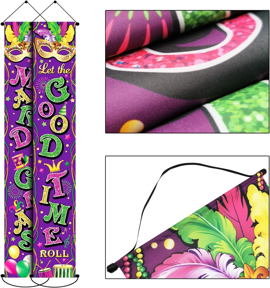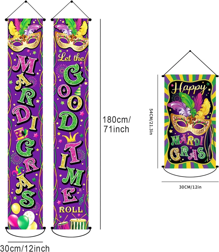 Brand: Does not apply Included Components: Let the good time roll Banner, Mardi Gras Banner, Mardi Gras door Special Feature: Foldable Care instructions: Hang It Item Weight: 8.1 ounces Product Dimensions: 70"L x 12"W Number of pieces: 3 Theme: Fantasy Specific Uses For Product: Outdoor, Indoor Recommended Uses For Product: Party Type: Does not apply Fabric Type: Polyester Material: Polyester Occasion: Mardi Gras Batteries required: No Color: Mardi Gras Set Specific instructions for use: Outdoor, Indoor