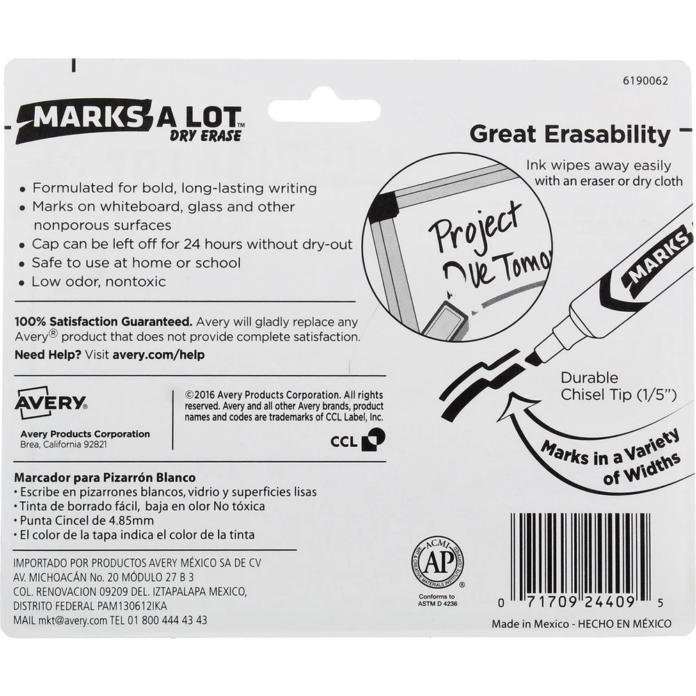Product Description The bold, erasable ink of Avery Marks-A-Lot Dry Erase Markers gives you high visibility even from a distance. The markers write smoothly on whiteboards, glass and other nonporous surfaces, and the ink wipes off easily with a dry cloth or eraser. Even better, the cap can be left off for up to 24 hours without the ink drying out. Durable 1/5 chisel tip marks in a variety of widths Nontoxic, low-odor ink Great for school, office and home Product Description The bold, erasable ink of Avery Marks-A-Lot Dry Erase Markers gives you high visibility even from a distance. The markers write smoothly on whiteboards, glass and other nonporous surfaces, and the ink wipes off easily with a dry cloth or eraser. Even better, the cap can be left off for up to 24 hours without the ink drying out. Durable 1/5 chisel tip marks in a variety of widths Nontoxic, low-odor ink Great for school, office and home Disclaimer The product descriptions and instructions provided by vitabox.com are for informational purposes only and are qualified in their entirety by the information available from manufacturers of the products. You should carefully read all product packaging, and contact the manufacturer with any questions before using a product. While we endeavor to ensure that product descriptions are current, manufacturers sometimes change their products. We are not liable for inaccuracies or misstatements about products. We do not provide medical advice or recommendations. You should not use the information provided by vitabox.com for diagnosing or treating a health problem or disease. If you have or suspect that you have a medical problem, immediately contact your health care provider. Information and statements regarding dietary supplements have not been evaluated by the Food and Drug Administration or any other government agency and are not intended to diagnose, treat, cure, or prevent any disease.
