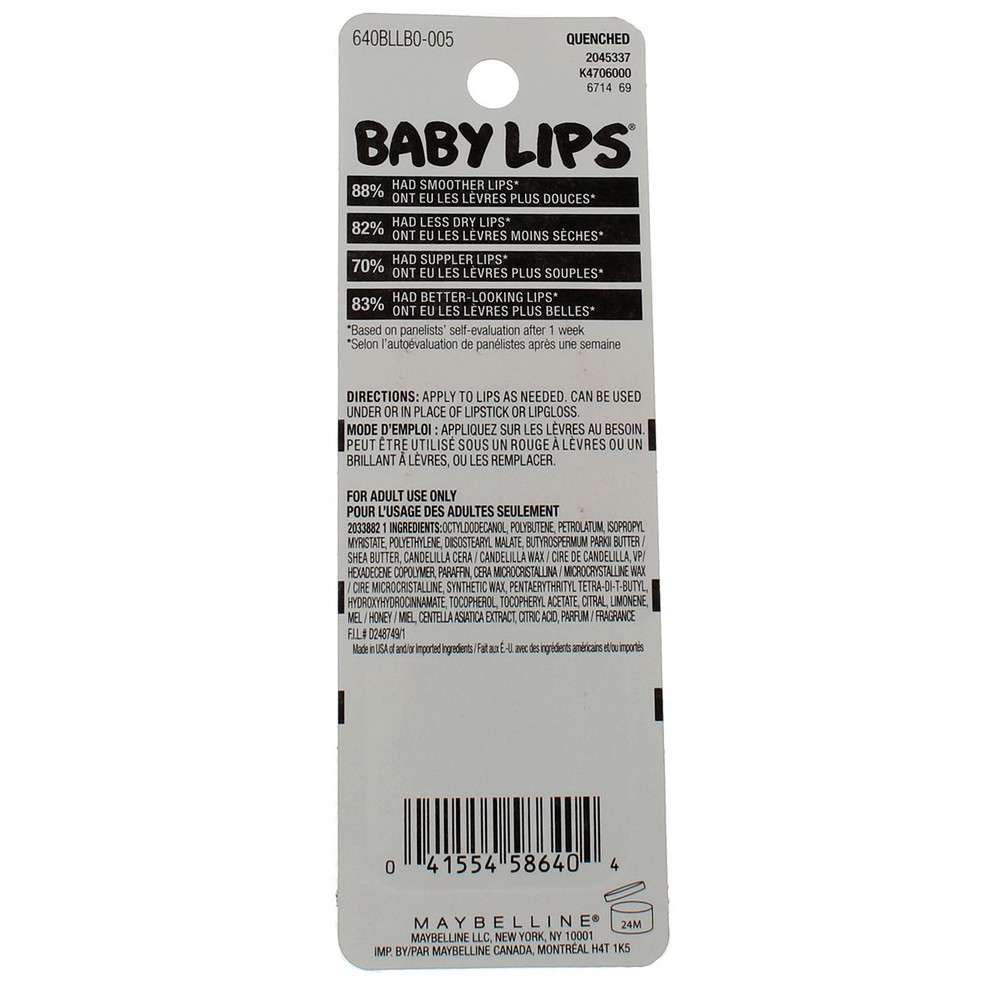 Product Description It’s clinical care for baby soft lips. Maybelline New York's Baby Lips Lip Balm exclusive lip renew formula moisturizes and protects lips for a full eight hours. After one week, lips are visibly renewed. 88% experienced more smooth lips. 83% experienced better-looking lips. 82% experienced less dry lips. Moisturizing lip care for baby soft lips Maybelline Baby Lips lip balm provides eight-hour hydration Lips are visibly renewed in one week Baby Lips lip balm- clinically tested lip care formula that surges with moisture Ingredients Polybutene, Octyldodecanol, Isopropyl Myristate, Petrolatum, Ethylhexyl Methoxycinnamate, Polyethylene, Ozokerite, Ethylhexyl Salicylate, Butyrospermum Parkii Butter/Shea Butter, Diisostearyl Malate, Candelilla Cera/Candelilla Wax/Cire De Candelilla, Vp/Hexadecene Copolymer, Silica Dimethyl Silylate, Parfum/Fragrance, Calcium Aluminum Borosilicate, Pentaerythrityl Tetra-Di-T-Butyl Hydroxyhydrocinnamate, Tocopherol, Tocopheryl Acetate, Alumina, Aroma/Flavor, Silica, Isopropyl Palmitate, Pentaerythrityl Tetraisostearate, Limonene, Synthetic Fluorphlogopite, Calcium Sodium Borosilicate, Benzyl Benzoate, Centella Asiatica Extract, Aluminum Hydroxide, Citral, Linalool, Hexyl Cinnamal, Tin Oxide, Geraniol, Eugenol, Aloe Barbadensis Extract/Aloe Barbadensis Leaf Extract, Mel/Honey/Miel, Calcium Pantothenate, Ascorbic Acid, Dimethicone, Sodium Chondroitin Sulfate, Atelocollagen, [+/- May Contain/Peut Contenir, Ci 77891/Titanium Dioxide, Mica, Ci 45410/Red 28 Lake, Ci 77491, Ci 77492, Ci 77499/Iron Oxides, Ci 15850/Red 7, Ci 45380/Red 22 Lake, Ci 19140/Yellow 5 Lake. Ci 42090/Blue 1 Lake, Ci 15985/Yellow 6 Lake, Ci 75470/Carmine] Product Description It‚Äôs clinical care for baby soft lips. Maybelline New York's Baby Lips Lip Balm exclusive lip renew formula moisturizes and protects lips for a full eight hours. After one week, lips are visibly renewed. 88% experienced more smooth lips. 83% experienced better-looking lips. 82% experienced less dry lips. Moisturizing lip care for baby soft lips Maybelline Baby Lips lip balm provides eight-hour hydration Lips are visibly renewed in one week Baby Lips lip balm- clinically tested lip care formula that surges with moisture Ingredients Polybutene, Octyldodecanol, Isopropyl Myristate, Petrolatum, Ethylhexyl Methoxycinnamate, Polyethylene, Ozokerite, Ethylhexyl Salicylate, Butyrospermum Parkii Butter/Shea Butter, Diisostearyl Malate, Candelilla Cera/Candelilla Wax/Cire De Candelilla, Vp/Hexadecene Copolymer, Silica Dimethyl Silylate, Parfum/Fragrance, Calcium Aluminum Borosilicate, Pentaerythrityl Tetra-Di-T-Butyl Hydroxyhydrocinnamate, Tocopherol, Tocopheryl Acetate, Alumina, Aroma/Flavor, Silica, Isopropyl Palmitate, Pentaerythrityl Tetraisostearate, Limonene, Synthetic Fluorphlogopite, Calcium Sodium Borosilicate, Benzyl Benzoate, Centella Asiatica Extract, Aluminum Hydroxide, Citral, Linalool, Hexyl Cinnamal, Tin Oxide, Geraniol, Eugenol, Aloe Barbadensis Extract/Aloe Barbadensis Leaf Extract, Mel/Honey/Miel, Calcium Pantothenate, Ascorbic Acid, Dimethicone, Sodium Chondroitin Sulfate, Atelocollagen, [+/- May Contain/Peut Contenir, Ci 77891/Titanium Dioxide, Mica, Ci 45410/Red 28 Lake, Ci 77491, Ci 77492, Ci 77499/Iron Oxides, Ci 15850/Red 7, Ci 45380/Red 22 Lake, Ci 19140/Yellow 5 Lake. Ci 42090/Blue 1 Lake, Ci 15985/Yellow 6 Lake, Ci 75470/Carmine] Suggested Use Step 1. Apply lip balm in the center of your upper lip and follow the contours of your mouth. Step 2. Glide the lip balm across the entire bottom lip. Step 3. Lip balm can be worn alone or under lipstick or lip gloss. Disclaimer The product descriptions and instructions provided by vitabox.com are for informational purposes only and are qualified in their entirety by the information available from manufacturers of the products. You should carefully read all product packaging, and contact the manufacturer with any questions before using a product. While we endeavor to ensure that product descriptions are current, manufacturers sometimes change their products. We are not liable for inaccuracies or misstatements about products. We do not provide medical advice or recommendations. You should not use the information provided by vitabox.com for diagnosing or treating a health problem or disease. If you have or suspect that you have a medical problem, immediately contact your health care provider. Information and statements regarding dietary supplements have not been evaluated by the Food and Drug Administration or any other government agency and are not intended to diagnose, treat, cure, or prevent any disease.