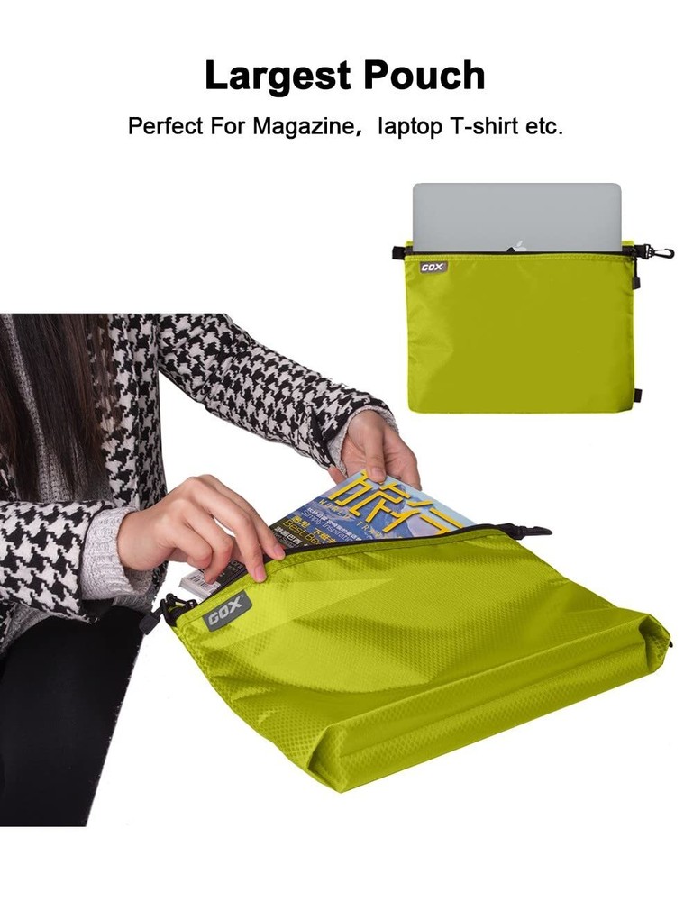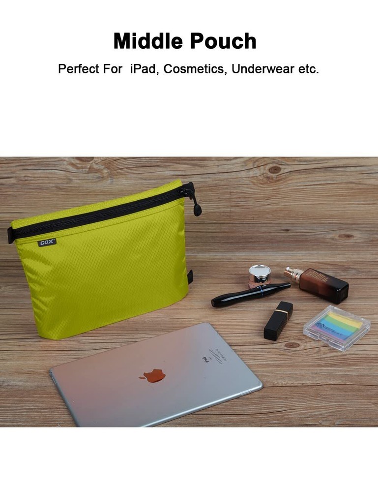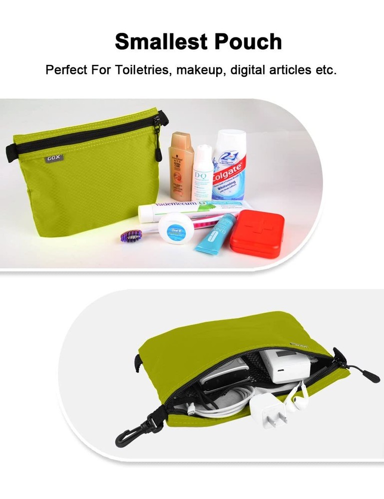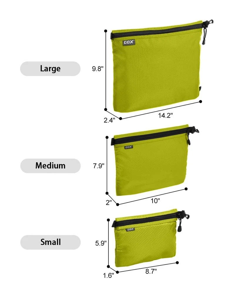 GOX 3 Pack Travel Toiletry Bag for Men Carry On Packing Organizer Zipper Pouch Portable Cosmetic Pouch Accessory Document Electronics (Green) The zipper pouch made by nylon which is durable, ripstop, scratch-resistant, water repellent. There is a nice pull on the zipper to facilitate opening and closing the bags. 3 SETS AT VARIOUS SIZES: This travel package bag set includes 3 sizes packing pouches: Large- 14x2.4x9.8 inch; Medium-10x2x7.9 inch; Small-8.7x1.6x5.9 inch. The bottoms can be expanded, so it will pop out and give more room. The different sizes will really help you keep everything organized during travels. It has a clip on one side so you could easy clip to your backpack or other gear to take with you to travel. Large size for tablet or magazine; Medium size for perhaps cosmetics, underwear, but really it is up to you what to put in there.; Small size can be used as electronic cable organizer or makeup bag for daily routine.The small one is good for personal items because it has dividers in it. The small one has a nylon sleeve inside, along with two mesh pockets that are well stitched and this construction helps to store your items clean and separate by your purpose. Description 3 SETS AT VARIOUS SIZES: This travel package bag set includes 3 sizes packing pouches: Large- 14x2.4x9.8 inch; Medium-10x2x7.9 inch; Small-8.7x1.6x5.9 inch SHIPPING Domestic Buyers - We have confidence in our products, but if you are not fully satisfied please contact us within 30 days of purchase and you will get full refund. - We ship within 3 business days of payment, usually sooner - We offer FREE shipping on all orders! - We only ship to the lower 48 states, no APO/FPO addresses or PO Boxes allowed International buyers – please note: Import duties, taxes, and charges aren't included in the item price or postage cost. These charges are the buyer's responsibility. - Please check with your country's customs office to determine what these additional costs will be prior to bidding or buying. * Order Cancellation Policy ** You can return a product for up to 30 days from the date you purchased it. 1. The seller reserves the right to cancel the special case only due to eBay cancellation fee. 2. The decision of seller is the final. 3. The seller will respond to the cancellation request within 2 business days. Please wait for the result of cancellation. 4. In case the cancellation is not completed by some reasons, the buyer can follow the options below to get the refund. 4.1 The buyer can reject the item when it arrives. 4.2 The buyer can send the item back to the seller within 30 days If the buyer receives item (USA Shipment ONLY). The seller will provide the FREE return label to the buyer when the buyer opens " Return Item" case on eBay by using the reason as "Change my mind" ONLY. 5. When buyer has placed the order. The order will be processed and completed by automatic warehouse system within 5 minutes. In case that buyer sends the cancellation request after 5 minutes of placing the order, the request will be rejected. **Sending direct message to cancel the order is not allowed for every case.* Return Policy For the return case - If buyer would like to return the items for refund or replacement, please CONTACT SELLER to receive the free return label from seller. The refund or replacement will be processed with the tracking number of return label which is provided by seller only. The other ways of return which are not approved by seller will not be processed for the refund or replacement.