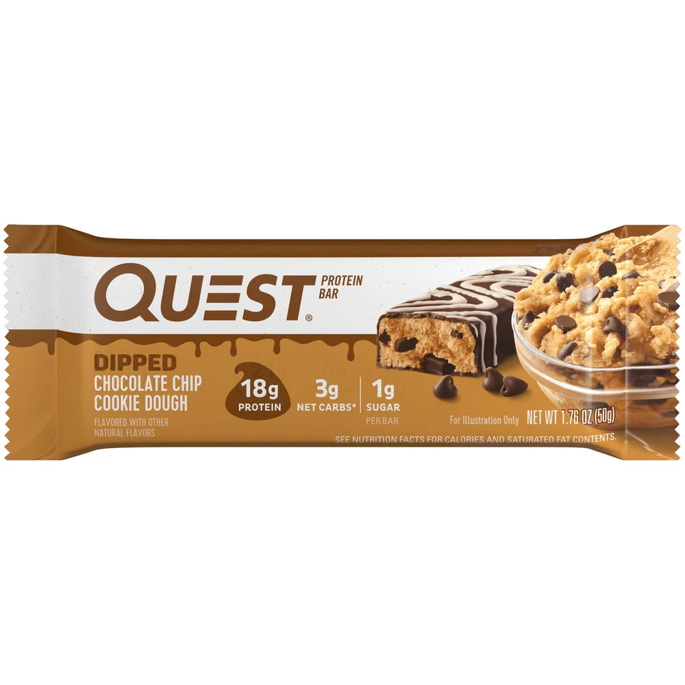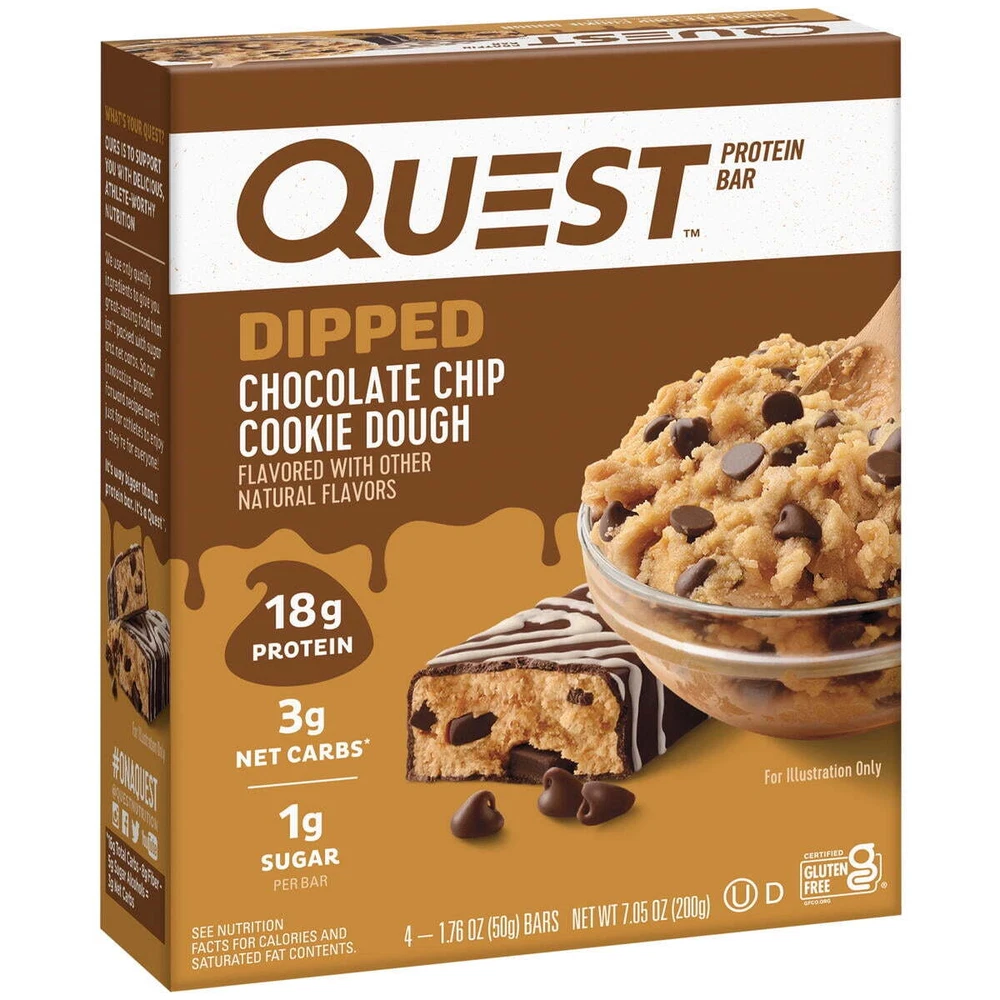 eBay Product details Quest Dipped Protein Bars, Low Sugar, High Protein, Chocolate Chip Cookie Dough, 4 Count QUEST DIPPED CHOCOLATE CHIP COOKIE DOUGH PROTEIN BAR tastes like a scoop of cookie dough fresh from the bowl. Only our version is packed with chocolate flavored chips, then dipped and topped with chocolatey drizzle, and has 17g protein 4g net carbs and 1g sugar per serving. UNWRAP COMPLETE PROTEINS: Quest Dipped Chocolate Chip Cookie Dough Protein Bars are made with complete, dairy-based proteins to provide your body with 9 essential amino acids. FIBER IS YOUR FRIEND: Each Quest Dipped Chocolate Chip Cookie Dough Protein Bar has 9g of fiber per serving to provide your body with a more complete macro profile. SWEET WITHOUT ADDED SUGAR: Enjoy the rewarding taste of Chocolate Chip Cookie Dough without worrying about added sugars. The Quest Dipped Chocolate Chip Cookie Dough Protein Bar has no added sugars COMFORT FOODS FOR ANYTIME CRAVINGS: The Quest Dipped Chocolate Chip Cookie Dough Protein bar is a sweet treat, without a ton of sugar, you can enjoy whenever you want to satisfy your sweet tooth. Box contains 4 Dipped Chocolate Chip Cookie Dough flavored protein bars