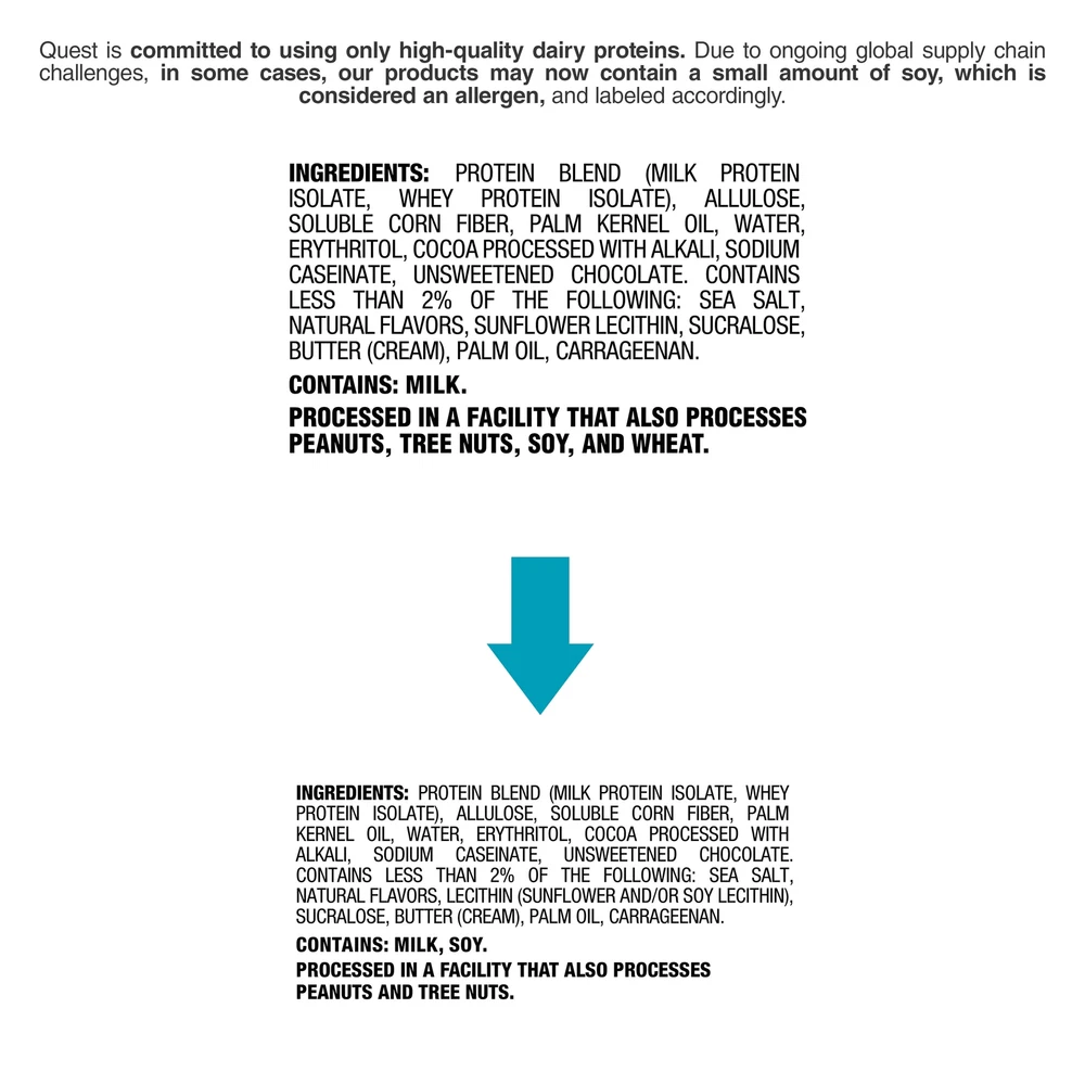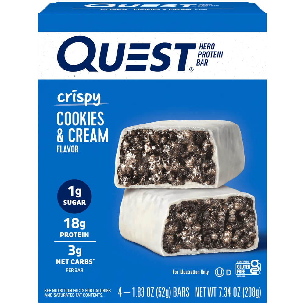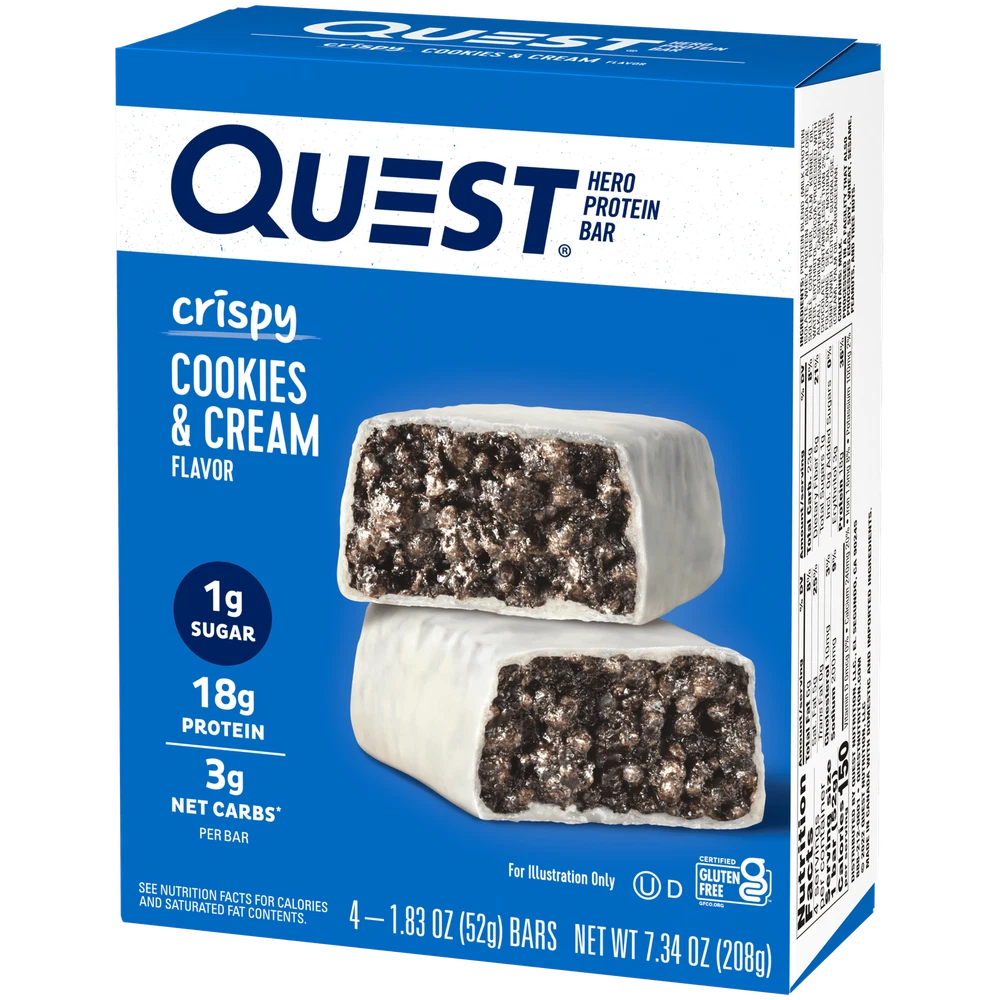 eBay Product details Discover sweets without all the sugar and enjoy the benefits of feeding your cravings the Quest way. Why do millions of people love Quest Protein Bars? Quest Protein Bars are sweet without all the sugar. Our protein bars use complete, dairy-based proteins and provide 9 essential amino acids to help, support and uplift your nutrition goals without sacrificing taste. Quest Hero Bars look and taste like the candy bars you know and love with a fraction of the sugars and net carbs. Sounds too good to be true? Try one today and find out for yourself. Due to global supply chain issues, Quest™ recently reformulated some of its products to contain soy lecithin and/or vegetable oil including soybean which is considered an allergen. The small amount contained within the product will not change the quality, flavor or texture of the product. We remain committed to using the high quality dairy-based proteins to help give you the amino acids you need. YOU DESERVE A SWEET TREAT: The Quest Cookies & Cream Hero Protein Bar tastes like an indulgent candy bar. Only our version has 17g protein, 3g net carbs and 1g of sugar. UNWRAP COMPLETE PROTEINS: The Quest Cookies & Cream Hero Protein Bars are made with complete, dairy-based proteins to provide your body with 9 essential amino acids. FIBER IS YOUR FRIEND: The Quest Cookies & Cream Hero Protein Bars have 6g of fiber to provide your body with a more complete macro profile. SWEET WITHOUT ALL THE SUGAR: Enjoy the sweet taste of Cookies & Cream without worrying about excess sugar. The Quest Cookies & Cream Hero Protein Bar has 1g of sugar per bar. COMFORT FOODS FOR ANYTIME CRAVINGS: The Quest Cookies & Cream Hero Protein Bar is a sweet treat, without all the sugar, you can enjoy whenever you want to satisfy your sweet cravings. Box contains 4 Cookies & Cream flavored Quest Hero Protein Bars