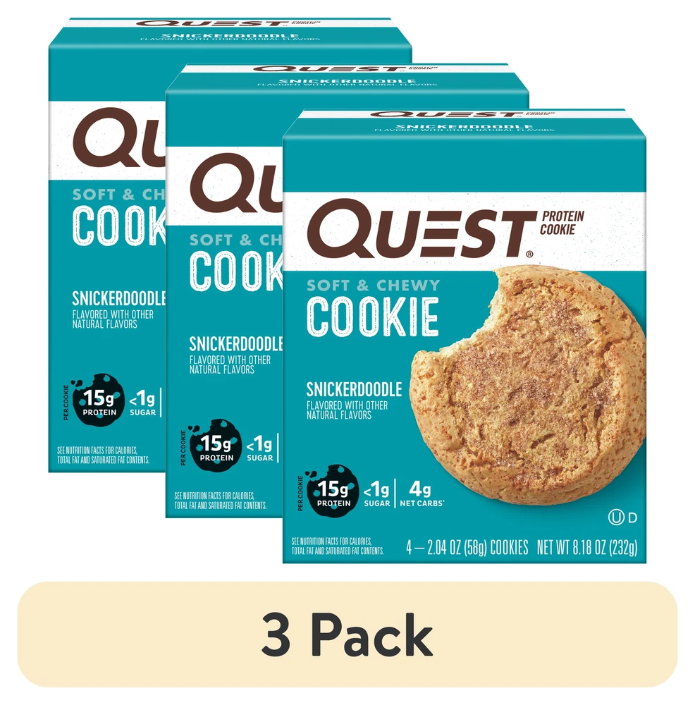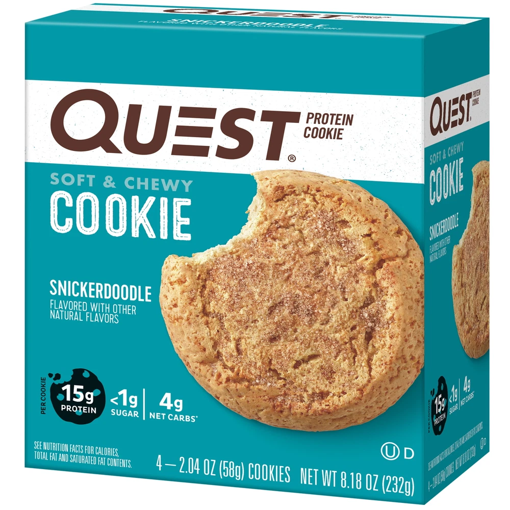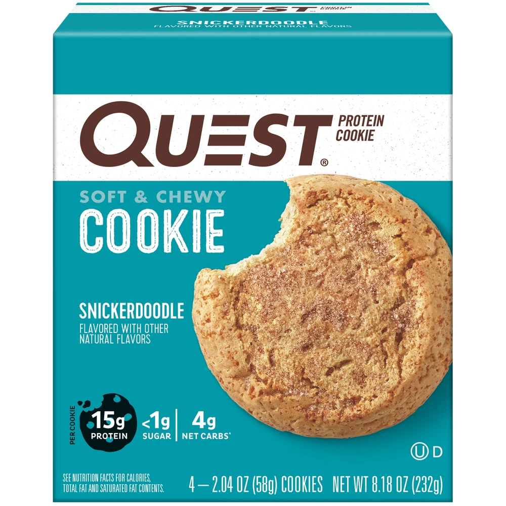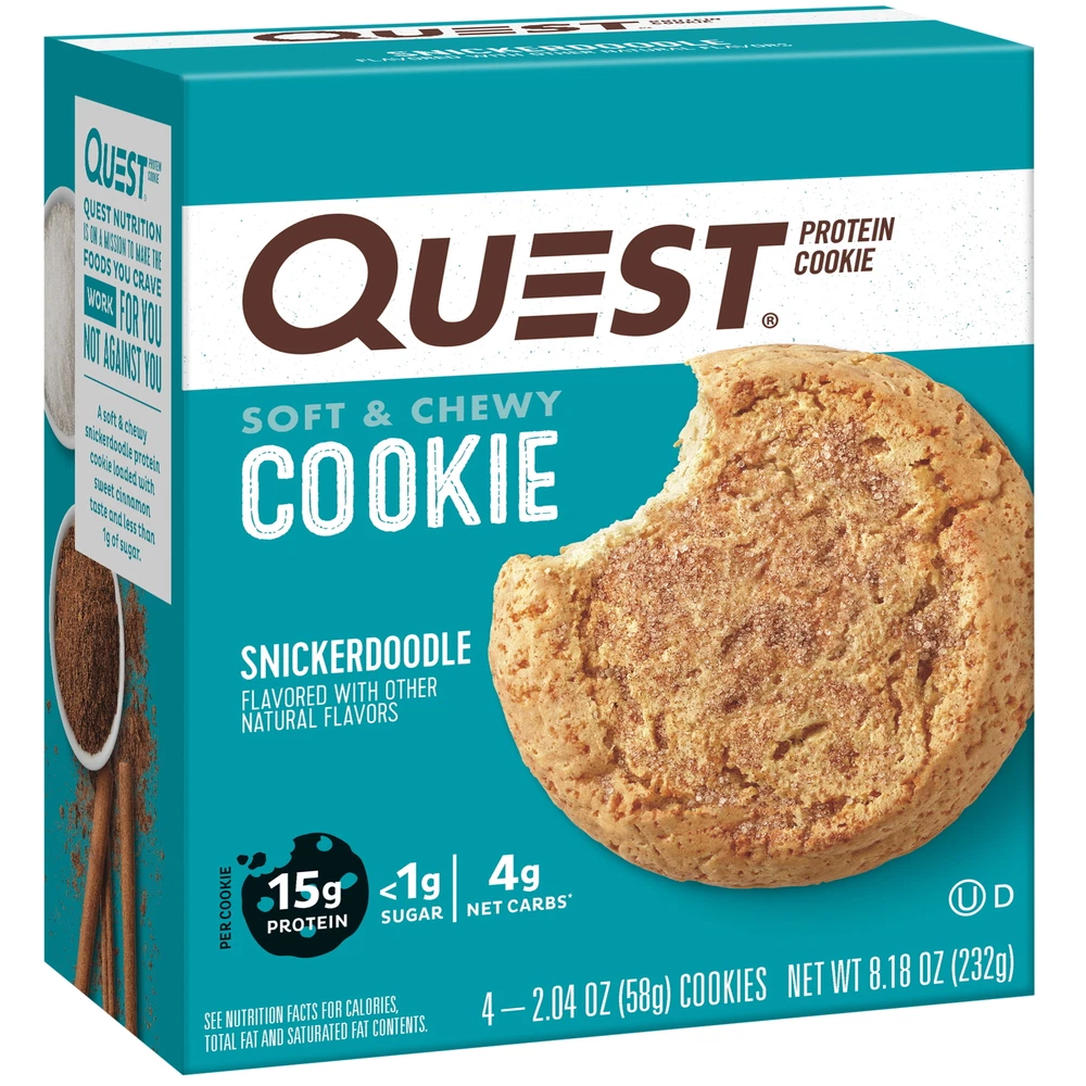 Product details Enjoy sweet cinnamon indulgence of Quest Nutrition Snickerdoodle Protein Cookies! All the taste, texture and satisfaction of a snickerdoodle cookie with only 4g of net carbs and less than 1g of sugar. Great protein snack option for on-the-go, lunch sweet treat, or post-working protein boost. Each box contains 4 individually wrapped Snickerdoodle Protein Cookies. Due to global supply chain issues, Quest recently reformulated some of its products to contain soy lecithin and/or vegetable oil including soybean which is considered an allergen. The small amount contained within the product will not change the quality, flavor or texture of the product. We remain committed to using the high quality dairy-based proteins to help give you the amino acids you need. YOU DESERVE A COOKIE: The Quest Snickerdoodle Protein Cookies provide you with a sweet, soft & chewy cookie with 15g protein, 4g net carbs, and 1g of sugar. FIBER IS YOUR FRIEND: Quest Snickerdoodle Protein Cookies have 11g of fiber to provide your body with a more complete macro profile. UNWRAP COMPLETE PROTEINS: Quest Snickerdoodle Protein Cookies are made with complete, dairy-based proteins to provide you with 9 essential amino acids. COOKIES THAT TRAVEL WITH YOU: Individually wrapped protein cookies perfect for afternoon treats, adding to your gym-bag, purse or car console Box contains 4 individually wrapped protein cookies