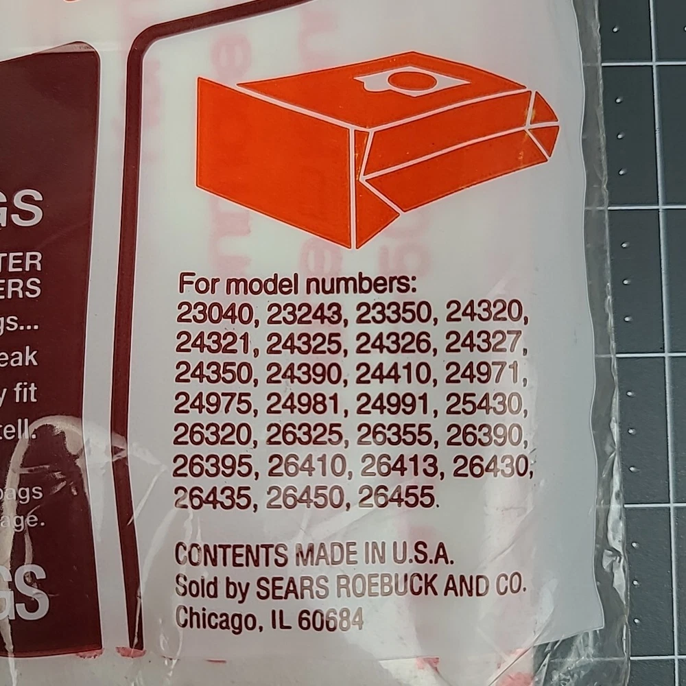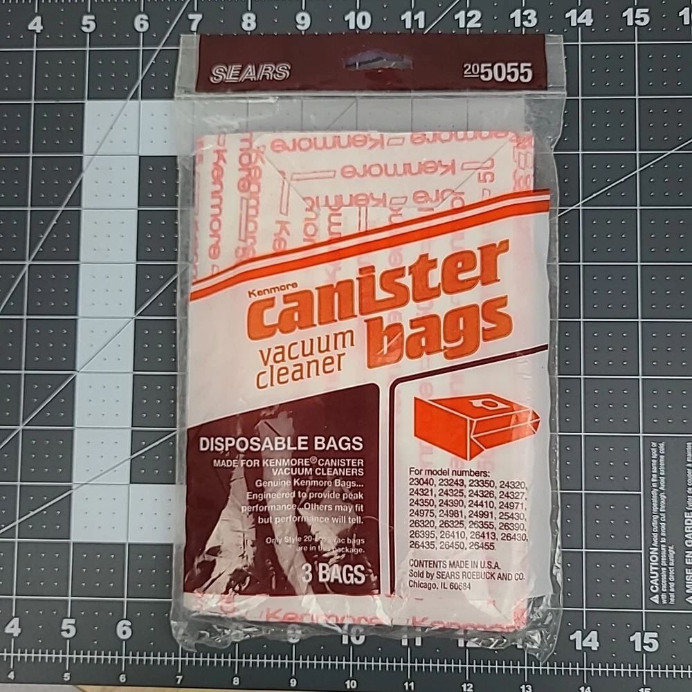 Brand:KenmoreSet Includes:Vacuum Cleaner BagsMaterial:Papergtin13:Does not applyCountry/Region of Manufacture:United StatesCompatible Model:Kenmore 24320Finish:MattNumber of Items in Set:3Custom Bundle:NoType:Vacuum Cleaner BagsUPC:Does not applyNumber in Pack:3Model:Sears Kenmore 20-50655Features:DisposableCompatible Brand:For Kenmore, For SearsMPN:20-5055