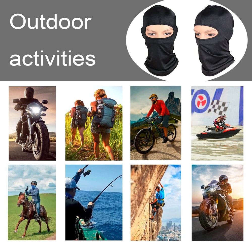【Multiple Wearing Methods】Can be worn as opened or closed balaclavas, ski mask, face masks, neck gaiters, kids ski mask, scarfs, bandanas, helmet liners, headbands and even wristbands, provides great protection to your face, ear and neck from sun. Kids ski mask, kids balaclava extremely elastic strong and durable - wrinkle free - lightweight, portable and comfortable, ventilation - quick drying. 【All Year Round Friendly】This multifunctional ski mask is eligible for superior wind and weather protection around the head and neck, black balaclava without any skin irritation and helps prevents heat loss. Sun UV protection, summer cooling, windbreak, dustproof and sand control, sweat absorption and machine washable, ski mask for men. 【Very Practical】 Suitable for all outdoor sports and activities, such as skiing, snowboarding, fishing, motorcycling, running, climbing, hiking, tactical training and other outdoor activities. Wear your balaclava on its own, under a helmet, as a full face mask, open balaclava, half ski mask, ninja hoodie, pooh shiesty mask, or neck gaiter. This cold weather gear is as versatile as it comes. Black balaclava women ski mask is versatile enough to complement your goggles, helmet, and ski gear. 【Unique Design】 Unisex balaclava face mask, provides cover and comfort with lightweight (thin material) Designed in a minimalist unisex aesthetic which is suitable for men/women and even kid children. Balaclava hood is to be worn next to skin underneath any helmet or hat ( including any motorcycle helment or ski helmet). 【One Size Fits All Noggins】Black balaclava kids ski mask for men, It is soft 92% polyester 8% spandex blend, stretchy, breathable thermal spandex fabric. It has four-way stretch and a lightweight feel that will fit comfortably, even on Einstein-sized heads. Package include: 3 pack black balaclavas.